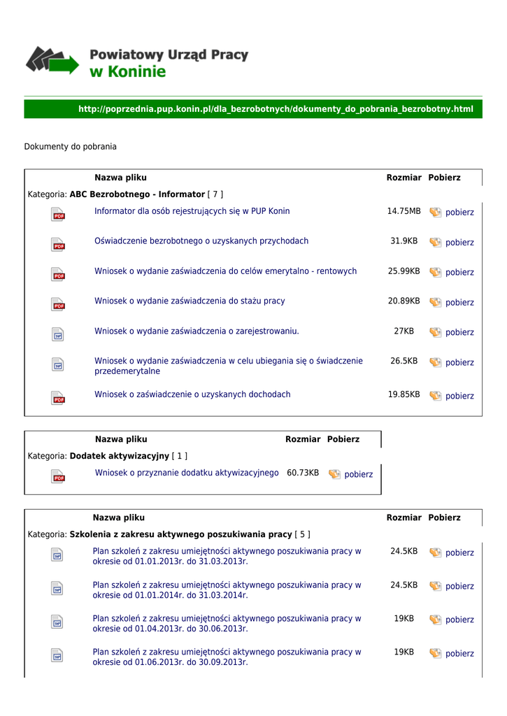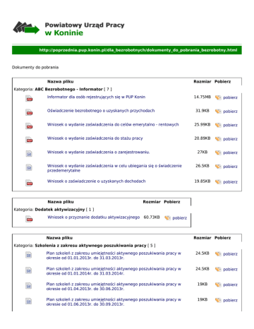 http://poprzednia.pup.konin.pl/dla_bezrobotnych/dokumenty_do_pobrania_bezrobotny.html Dokumenty do pobrania Nazwa pliku Rozmiar Pobierz Kategoria: ABC Bezrobotnego - Informator [ 7 ] Informator dla osób rejestrujących się w PUP Konin 14.75MB pobierz Oświadczenie bezrobotnego o uzyskanych przychodach 31.9KB pobierz Wniosek o wydanie zaświadczenia do celów emerytalno - rentowych 25.99KB pobierz Wniosek o wydanie zaświadczenia do stażu pracy 20.89KB pobierz 27KB pobierz Wniosek o wydanie zaświadczenia w celu ubiegania się o świadczenie przedemerytalne 26.5KB pobierz Wniosek o zaświadczenie o uzyskanych dochodach 19.85KB pobierz Wniosek o wydanie zaświadczenia o zarejestrowaniu. Nazwa pliku Rozmiar Pobierz Kategoria: Dodatek aktywizacyjny [ 1 ] Wniosek o przyznanie dodatku aktywizacyjnego 60.73KB pobierz Nazwa pliku Rozmiar Pobierz Kategoria: Szkolenia z zakresu aktywnego poszukiwania pracy [ 5 ] Plan szkoleń z zakresu umiejętności aktywnego poszukiwania pracy w okresie od 01.01.2013r. do 31.03.2013r. 24.5KB pobierz Plan szkoleń z zakresu umiejętności aktywnego poszukiwania pracy w okresie od 01.01.2014r. do 31.03.2014r. 24.5KB pobierz Plan szkoleń z zakresu umiejętności aktywnego poszukiwania pracy w okresie od 01.04.2013r. do 30.06.2013r. 19KB pobierz Plan szkoleń z zakresu umiejętności aktywnego poszukiwania pracy w okresie od 01.06.2013r. do 30.09.2013r. 19KB pobierz Plan szkoleń z zakresu umiejętności aktywnego poszukiwania pracy w okresie od 02.09.2013r. do 31.12.2013r. Nazwa pliku 19KB pobierz Rozmiar Pobierz Kategoria: Zajęcia aktywizacyjne [ 5 ] Plan zajęć aktywizacji w Klubie Pracy od 01.01.2013r. do 31.03.2013r. 63KB pobierz Plan zajęć aktywizacji w Klubie Pracy od 01.01.2014r. do 31.03.2014r. 64KB pobierz Plan zajęć aktywizacji w Klubie Pracy od 01.04.2013r. do 30.06.2013r. 41.5KB pobierz Plan zajęć aktywizacji w Klubie Pracy od 01.07.2013r. do 30.09.2013r. 44KB pobierz Plan zajęć aktywizacji w Klubie Pracy od 02.09.2013r. do 31.12.2013r. 59.5KB pobierz Nazwa pliku Rozmiar Pobierz Kategoria: Informacja zawodowa [ 5 ] Harmonogram informacji grupowych z zakresu poradnictwa zawodowego I kwartał 2013 roku. 280.5KB pobierz Harmonogram informacji grupowych z zakresu poradnictwa zawodowego I kwartał 2014 roku. 211KB pobierz Harmonogram informacji grupowych z zakresu poradnictwa zawodowego II kwartał 2013 roku. 239KB pobierz Harmonogram informacji grupowych z zakresu poradnictwa zawodowego III kwartał 2013 roku. 247KB pobierz Harmonogram informacji grupowych z zakresu poradnictwa zawodowego IV kwartał 2013 roku. 222.5KB pobierz Nazwa pliku Rozmiar Pobierz Kategoria: Porady grupowe [ 5 ] Harmonogram porad grupowych z zakresu poradnictwa zawodowego I kwartał 2013 roku. 157KB pobierz Harmonogram porad grupowych z zakresu poradnictwa zawodowego I kwartał 2014 roku. 159.5KB pobierz Harmonogram porad grupowych z zakresu poradnictwa zawodowego II kwartał 2013 roku. 156KB pobierz Harmonogram porad grupowych z zakresu poradnictwa zawodowego III kwartał 2013 roku. 154.5KB pobierz Harmonogram porad grupowych z zakresu poradnictwa zawodowego IV kwartał 2013 roku. 160.5KB pobierz Nazwa pliku Rozmiar Pobierz Kategoria: Refundacja kosztów dojazdu [ 1 ] Wniosek o zwrot kosztów dojazdu, rozliczenie, oświadczenie 43KB pobierz Nazwa pliku Rozmiar Pobierz Kategoria: Refundacja kosztów opieki [ 1 ] Wniosek o przyznanie refundacji kosztów opieki nad dzieckiem do lat 7 Nazwa pliku 49KB Rozmiar Pobierz Kategoria: Staż - bezrobotny [ 3 ] Druk karty stażu 31.5KB pobierz Wniosek o wydanie zaświadczenia 22KB pobierz Wniosek o zwrot badań - SANEPID 25KB pobierz Nazwa pliku Rozmiar Pobierz Kategoria: Studia podyplomowe [ 1 ] Wniosek o dofinansowanie studiów podyplomowych Nazwa pliku 29KB pobierz Rozmiar Pobierz Kategoria: Stypendia z tytułu podjęcia dalszej nauki [ 1 ] Wniosek o stypendium z tytułu podjęcia dalszej nauki Nazwa pliku 31.94KB pobierz Rozmiar Pobierz Kategoria: Szkolenia [ 2 ] Karta kandydata na szkolenie Wniosek bezrobotnego o szkolenie indywidualne Nazwa pliku 43.5KB pobierz 88KB pobierz Rozmiar Pobierz Kategoria: Szkolenia grupowe [ 1 ] Karta kandydata na szkolenie 43.5KB pobierz pobierz Nazwa pliku Rozmiar Pobierz Kategoria: Środki na podjęcie działalności gospodarczej [ 7 ] Karta oceny formalnej wniosku 34.5KB pobierz 36KB pobierz Oświadczenie poręczyciela o dochodach 32.5KB pobierz Projekt umowy sprzedaży 44.5KB pobierz Regulamin przyznawania bezrobotnym jednorazowych środków na podjęcie działalności gospodarczej 98.5KB pobierz Rozliczenie 73.5KB pobierz Wniosek w sprawie przyznania osobie bezrobotnej jednorazowo środków finansowych na podjęcie działalności gospodarczej 485KB pobierz Karta oceny merytorycznej wniosku Nazwa pliku Rozmiar Pobierz Kategoria: Terminy wypłat świadczeń dla bezrobotnych [ 2 ] Harmonogram wypłat świadczeń dla bezrobotnych - 2014.01 (styczeń) 68KB pobierz Harmonogram wypłat świadczeń dla bezrobotnych - 2014.02 (luty) 68KB pobierz Nazwa pliku Rozmiar Pobierz Kategoria: Ubezpieczenia społeczne rolników [ 1 ] Wniosek o pokrycie składek na ubezpieczenia społeczne rolników Nazwa pliku 32.5KB Rozmiar Pobierz Kategoria: Wyniki posiedzenia komisji ds. dotacji [ 1 ] Wyniki z posiedzenia komisji z dnia 04.09.2013 r. Nazwa pliku 208KB Rozmiar Pobierz Kategoria: Wyrejestrowanie [ 1 ] Wniosek w przypadku zmiany PUP 69.46KB pobierz pobierz pobierz