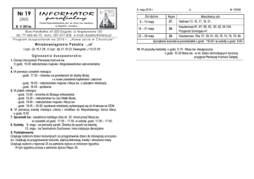 8. maja 2016 r. Nr 19 Dni dyżuru (365) 8. V 2016r. Parafia Rzymskokatolicka, pw. św. Anny i św. Joachima w Gogolinie - Karłubcu Biuro Parafialne: 47-320 Gogolin, ul. Krapkowicka 102 tel.: 77–466–66–72, kom.: 507–017–858, e-mail: [email protected] Program duszpasterski na 2016 r.: „Nowe życie w Chrystusie” -4- 8 – 14 maja Rejon 27. 15 – 21 maja 28. 22 – 28 maja 29. Nr 19/365 Mieszkańcy ulic Sadowa 13, 15, 17, 19, 21. Kasztanowa 81, 87, 89, 93; 90, 92, 94,104. Przyjaciół Schongau 41. Kasztanowa 55a, 57, 59, 61, 69, 79; 74, 76, 78, 80. Sprzątanie kościoła w poniedziałek o godz. *16.00 i w sobotę o godz. 9.00. W n i e b o w s t ą p i e n i e P a ń s k i e - „Jał” I czyt.: Dz 15,1-29; II czyt.: Ap 21,10-23; Ewangelia: J 14,23-29 Ogłoszenia duszpasterskie: 1. Dzisiaj Uroczystość Pierwszej Komunii św. O godz. 15.00 nabożeństwo majowe i błogosławieństwo sakramentalne. 2. 4. W pierwszy czwartek miesiąca: - godz. 17.30 – różaniec za powołanych do służby Bożej i o nowe powołania kapłańskie i zakonne - godz. 18.00 – nabożeństwo majowe i Msza św. z udziałem młodzieży - godz. 18.45 - spotkanie 5. W piątek miesiąca: - godz. 15.00 – koronka do Bożego miłosierdzia - godz. 16.30 – nabożeństwo ku czci Matki Bożej - godz. 18.00 – nabożeństwo majowe i Msza św. - godz. 18.45 – 20.00: spotkanie młodzieży wybierającej się do Krakowa na ŚDM 6. W pierwszą sobotę miesiąca Litania i modlitwa do Niepokalanego Serca Maryi o godz. 8.00. 7. Spowiedź św.: zasadniczo każdego dnia ok. 30. minut przed Mszą św. w czwartek od godz. 17.00 – 17.55, w sobotę: godz. 17.00 – 17.50. 8. Kolekty: 8. maja - na potrzeby parafii. Zbiórka do puszki na katedrę. 15. maja - na Seminarium Duchowne i inne instytucje diecezjalne 9. Podziękowania: Dziękuję rodzicom dzieci komunijnych za przygotowanie dzieci do dzisiejszej uroczystości. Dziękuję za przygotowanie kościoła, piękną dekorację, kwiaty i skoszenie trawy. Dziękuję osobom z rejonowi 25 za pełnienie dyżuru w minionym tygodniu. W tym tygodniu proszę o pełnienie dyżuru Rejon 26. 10. W przyszłą niedzielę: o godz. 9.15 - Msza św. dwujęzyczna, o godz. 10.30 Msza św. w int. dzieci obchodzących rocznicę przyjęcia Pierwszej Komunii Świętej. 8. maja 2016 r. -2- Nr 19/365 8. maja 2016 r. -3- Nr 19/365 0 Złota myśl tygodnia: „Każde pożegnanie ma coś ze śmierci, każde ponowne spotkanie – coś ze zmartwychwstania”. (Artur Schopenhauer) M.: 18.00 – za ++ rodziców Adama i Kazimierę Harlos. * 3. dzień przygotowania na przyjście Ducha Świętego Pocieszyciela Uroczystość Wniebowstąpienia Pańskiego – 8. maja 2016 r. (odnowienie przyrzeczeń chrzcielnych) M.: 8.00 – w int. Edwarda Sczakiel (z okazji 60 r. urodzin) z podz. za o.łaski z prośbą o Boże błogosławieństwo w rodzinie. (TD) M.: *9.15 (dwujęzyczna - j. niem i j. pol.) – za + żonę Beatę Kaizik (w 3. r. śmierci) ++ z rodzin Kaizik, Szulc i Cebula, za dusze w czyśćcu cierpiące. Rocznica Pierwszej Komunii świętej M: 10.30 - w intencji dzieci obchodzących rocznicę przyjęcia Pierwszej Komunii świętej i ich rodzin. 15.00 – nabożeństwo ku czci Matki Bożej (rozpoczęcie przy grocie), procesja do kościoła, nowenna do Ducha Świętego i bł. sakramentalne. * 4. dzień przygotowania na przyjście Ducha Świętego Pocieszyciela Poniedziałek (9. V) – św. Stanisława, biskupa i męczennika, głównego patrona Polski (obchód liturgiczny przeniesiony z 8. maja) 18.00 – nabożeństwo majowe i nowenna do Ducha Świętego Msza św. – do Bożej Opatrzności z podz. za o. łaski z prośbą o Boże błog. i opiekę Matki Bożej w rodzinie Antoniego i Łucji Wicher. * 5. dzień przygotowania na przyjście Ducha Świętego Pocieszyciela Wtorek (10. V) – dzień powszedni 18.00 – nabożeństwo majowe i nowenna do Ducha Świętego Msza św. – za ++ rodziców Alojzego i Marię Duczek, teścia Józefa Grobosz, ++ z pokrewieństwa i dusze w czyśćcu cierpiące. Spotkanie odpowiedzialnych za ołtarze w czasie procesji Bożego Ciała * 6. dzień przygotowania na przyjście Ducha Świętego Pocieszyciela Środa (11. V) – dzień powszedni *8.00 – nabożeństwo majowe i nowenna do Ducha Świętego Msza św.: – do Bożej Opatrzności z podz. za o. łaski z prośbą o Boże błog. w rodzinie Alfreda i Anny Bomba. Pielgrzymka autokarowa do Trzebnicy (św. Jadwiga) i Wrocławia – 21. maja (sobota). Wyjazd o godz. 8.00, powrót ok. godz. 20.00. Koszt: dorośli 40 zł, młodzież i dzieci 30 zł, ministranci i dzieci Maryi 10 zł. * 7. dzień przygotowania na przyjście Ducha Świętego Pocieszyciela Czwartek (12. V) – dzień powszedni 17.30 – różaniec w intencji naszych rodzin, za kapłanów i siostry zakonne, o powołania do służby Bożej z naszej parafii, w intencji DDM „Oremus”. 18.00 – nabożeństwo majowe i nowenna do Ducha Świętego Msza św. – za + męża Henryka Pietruszka, ++ rodziców Pietruszka i Chwałek, ++ z pokrewieństwa. Spotkanie kandydatów do bierzmowania (Grupa II) * 8. dzień przygotowania na przyjście Ducha Świętego Pocieszyciela Piątek (13. V) – dzień fatimski (wspomnienie Najświętszej Maryi Panny) 15.00 – koronka do Bożego Miłosierdzia 16.30 – nabożeństwo majowe z udziałem wszystkich dzieci *19.30 – różaniec fatimski *20.00 – Msza św. w intencjach zbiorowych: ………………………….. (intencję proszę napisać na karteczce i przynieść do zakrystii) Po Mszy św. procesja ze świecami wokół kościoła i błog. sakramentalne. * 9. dzień przygotowania na przyjście Ducha Świętego Pocieszyciela Sobota (14. V) – św. Macieja, Apostoła 8.00 – nabożeństwo majowe i Msza św. – z podz. za o. łaski z prośbą o Boże błogosławieństwo w rodzinach Matuszków, Pakułów i Kociubowskich. *O godz. 10.00 zabrzmią dzwony przypominające o święceniach kapłańskich w Opolu. 17.00 – rozpoczęcie