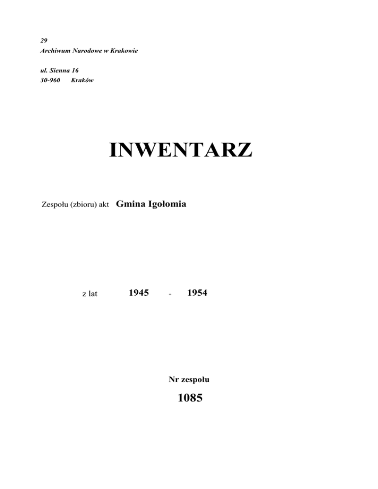 29 Archiwum Narodowe w Krakowie ul. Sienna 16 30-960 Kraków INWENTARZ Zespołu (zbioru) akt z lat Gmina Igołomia 1945 - 1954 Nr zespołu 1085 Akta z lat 1945-1950 Dział ogólno - organizacyjny Tytuł\Treść: Nr 0 - Przepisy i zarządzenia ogólne; 1950 Nr 2 - Sprawy osobowe członkow organów gminy i pracowników gminnych; 1946, 1948, 1950 Nr 3 - Zebrania i urzędowanie ciał samorządowych; 1950 Nr 4 - Kontrola wewnętrzna i nadzór; 1945-1948 Nr 5 - Majątek gminy i gromad; 1945-1946, 1949-1950 Sygnatura: Gm Ig 1 Daty: 1945-1950 Opis j.a.: akta luźne; ; ; ; ; Sygnatury dawne: Znak teczki: Uwagi: Nr 3: tymczasowy regulamin obrad rad narodowych, protokoły sesji Powiatowej Rady Narodowej sprawozdanie z działalności Gminnej Rady Narodowej na okres 1945-1950. Dział gospodarki gminnej Tytuł\Treść: Nr 20 - Przemysł i handel Sygnatura: Gm Ig 2 Daty: 1946-1950 Opis j.a.: akta luźne; ; ; ; ; Sygnatury dawne: Znak teczki: Uwagi: Dział administracyjno - społeczny Tytuł\Treść: Nr 22 - Oświata, kultura i sztuka Sygnatura: Gm Ig 3 Daty: 1945-1950 Opis j.a.: akta luźne; ; ; ; ; Sygnatury dawne: Znak teczki: Uwagi: Dział administracyjny (sprawy poruczone) Tytuł\Treść: Nr 28 - Sprawy wyznaniowe i sprawy akt stanu cywilnego Sygnatura: Gm Ig 4 Daty: 1946-1950 Opis j.a.: akta luźne; ; ; ; ; 2,5 cm Sygnatury dawne: Znak teczki: Uwagi: Nr zespołu: 1085 Strona 1 Tytuł\Treść: Nr 29 - Ewidencja i kontrola ruchu ludności; 1949 Nr 30 - Bezpieczeństwo i porządek publiczny; 1946, 1948-1950 Nr 34 - Budowlane i odbudowy; 1946, 1949-1950 Sygnatura: Gm Ig 5 Daty: 1946-1950 Opis j.a.: akta luźne; ; ; ; ; Sygnatury dawne: Znak teczki: Uwagi: Nr 30: sprawozdania okresowe ze stanu bezpieczeństwa, akcja zwalczania bandytyzmu oraz inne sprawy z zakresu ochrony bezpieczeństwa i porządku publicznego; obchody uroczystości i świąt narodowych, publiczne zbiórki pieniężne, wykaz repatriantów i reemigrantów, sprawy grobów wojennych oraz inne sprawy z dziedziny społeczno-politycznej Akta z lat 1951-1954 Referat ogólno - administracyjny Tytuł\Treść: Nr 1 - Sprawy organizacyjne; 1951 Nr 2 - Sprawy osobowe pracowników Prezydium Gminnej Rady Narodowej; 19511954 Sygnatura: Gm Ig 6 Daty: 1951-1954 Opis j.a.: akta luźne; ; ; ; ; Sygnatury dawne: Znak teczki: Uwagi: Nr 1: wzory druków urzędowych Tytuł\Treść: Nr 3 - a) Protokoły posiedzeń Gminnej Rady Narodowej; 1951-1952 b) Protokoły posiedzeń Prezydium Gminnej Rady Narodowej; 1951- 1952 c) Plany pracy Gminnej Rady Narodowej i jej Prezydium; 1951 d) Sprawozdania z działalności Prezydium Gminnej Rady Narodowej; 1951 e) Akta Komisji Gminnej Rady Narodowej 1951 Sygnatura: Gm Ig 7 Daty: 1951-1952 Opis j.a.: ; ; ; ; ; Sygnatury dawne: Znak teczki: Uwagi: Tytuł\Treść: Nr 3 - Sprawy obsługi rad narodowych i ich organów Sygnatura: Gm Ig 8 Daty: 1951-1952 Opis j.a.: akta luźne; ; ; ; ; Sygnatury dawne: Znak teczki: Uwagi: Przygotowania do nowego podziału administracyjnego na gromady i do wyborów gromadzkich rad narodowych Nr zespołu: 1085 Strona 2 Tytuł\Treść: Nr 4 - Kontrola wewnętrzna i nadzór; 1952 Nr 5 - Bezpieczeństwo i porządek publiczny; 1951 Sygnatura: Gm Ig 9 Daty: 1951-1952 Opis j.a.: akta luźne; ; ; ; ; Sygnatury dawne: Znak teczki: Uwagi: Nr 5: sprawozdania z działalności gminnej i gromadzkich komisji przeciwpożarowych Referat spraw socjalnych i kulturalnych Tytuł\Treść: Nr 1 - Oświata, kultura i sztuka; 1951-1954 Nr 7 - Sprawy budowlane; 1951-1954 Nr 8 - Zarząd Nieruchomości; 1951, 1953 Nr 9 - Przedsiębiorstwa gminne; 1951, 1953 Sygnatura: Gm Ig 10 Daty: 1951-1954 Opis j.a.: akta luźne; ; ; ; ; Sygnatury dawne: Znak teczki: Uwagi: Referat rolny Tytuł\Treść: Nr 2 - Sprawy statystyki gminnej Sygnatura: Gm Ig 11 Daty: 1951-1952 Opis j.a.: akta luźne; ; ; ; ; Sygnatury dawne: Znak teczki: Uwagi: Ogólna liczba pozycji: 11 Inwentarz zatwierdzony na posiedzeniu Komisji Metodycznej w dniu ........................................................ ................................................................... (miejscowość, data) .......................................................... (podpis przewodniczącego Komisji) Nr zespołu: 1085 ................................................................... (podpis sporządzającego inwentarz) Strona 3