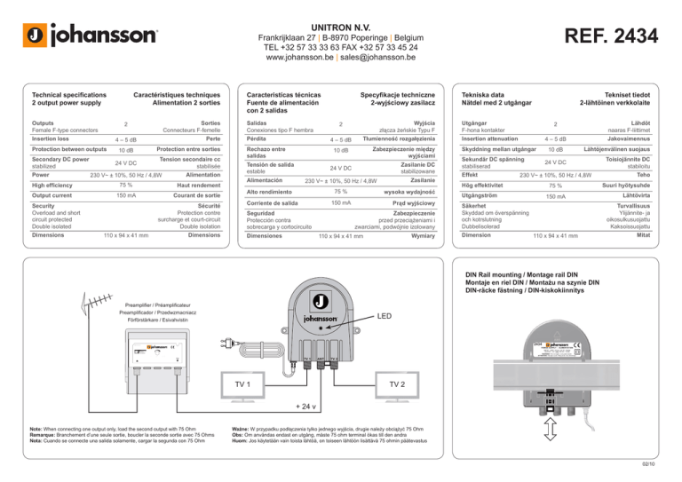 UNITRON N.V. REF. 2434 Frankrijklaan 27 | B-8970 Poperinge | Belgium TEL +32 57 33 33 63 FAX +32 57 33 45 24 www.johansson.be | [email protected] Technical specifications 2 output power supply Outputs Female F-type connectors Perte 4 – 5 dB Protection between outputs Power Sorties Connecteurs F-femelle 2 Insertion loss Secondary DC power stabilized Caractéristiques techniques Alimentation 2 sorties 10 dB Protection entre sorties 24 V DC Tension secondaire cc stabilisée 75 % Output current 150 mA Haut rendement Courant de sortie Security Overload and short circuit protected Double isolated Dimensions Alimentation 230 V~ ± 10%, 50 Hz / 4,8W High efficiency Sécurité Protection contre surcharge et court-circuit Double isolation Dimensions 110 x 94 x 41 mm Caracteristícas técnicas Fuente de alimentación con 2 salidas Specyfikacje techniczne 2-wyjściowy zasilacz Salidas Conexiones tipo F hembra Wyjścia złącza żeńskie Typu F 2 Pérdita 4 – 5 dB Rechazo entre salidas Tłumienność rozgałęzienia Zabezpieczenie między wyjściami 10 dB Tensión de salida estable Zasilanie DC stabilizowane 24 V DC Alimentación Zasilanie 230 V~ ± 10%, 50 Hz / 4,8W 75 % Alto rendimiento wysoka wydajność 150 mA Corriente de salida Seguridad Protección contra sobrecarga y cortocircuito Dimensiones Prąd wyjściowy Zabezpieczenie przed przeciążeniami i zwarciami, podwójnie izolowany Wymiary 110 x 94 x 41 mm Tekniska data Nätdel med 2 utgångar Tekniset tiedot 2-lähtöinen verkkolaite Utgångar F-hona kontakter Insertion attenuation Jakovaimennus 4 – 5 dB Skyddning mellan utgångar 10 dB Sekundär DC spänning stabiliserad Effekt Lähdöt naaras F-liittimet 2 Lähtöjenvälinen suojaus 24 V DC 230 V~ ± 10%, 50 Hz / 4,8W Hög effektivitet 75 % Utgångström 150 mA Säkerhet Skyddad om överspänning och kotrslutning Dubbelisolerad Dimension Toisiojännite DC stabiloitu Teho Suuri hyötysuhde Lähtövirta Turvallisuus Ylijännite- ja oikosulkusuojattu Kaksoissuojattu 110 x 94 x 41 mm Mitat DIN Rail mounting / Montage rail DIN Montaje en riel DIN / Montażu na szynie DIN DIN-räcke fästning / DIN-kiskokiinnitys Preamplifier / Préamplificateur Preamplificador / Przedwzmacniacz Förförstärkare / Esivahvistin 2434 UHF /50mA 7322 10dB 25dB Préamplificateur TNT DTT preamplifier UHF C. 21-69 POWER SUPPLY - ALIMENTATION INPUT : 230V~ 50 Hz / 4,8 W : Entrée OUTPUT : 24 V 150 mA : Sortie WARNING ! Do not open. Live parts inside. ATTENTION ! Ne pas ouvrir. Risque de choc électrique. 24V Digital Terrestrial LED TV 1 TV TV 1 ANT TV 2 TV 2 + 24 v Note: When connecting one output only, load the second output with 75 Ohm Remarque: Branchement d’une seule sortie, boucler la seconde sortie avec 75 Ohms Nota: Cuando se connecte una salida solamente, cargar la segunda con 75 Ohm Ważne: W przypadku podłączenia tylko jednego wyjścia, drugie należy obciążyć 75 Ohm Obs: Om användas endast en utgång, måste 75 ohm terminal ökas till den andra Huom: Jos käytetään vain toista lähtöä, on toiseen lähtöön lisättävä 75 ohmin päätevastus 02/10 SAFETY INSTRUCTIONS CONSIGNES DE SECURITE INSTRUCCIONES DE SEGURIDAD Read carefully these instructions before connect ing the unit. Lire attentivement ces instructions avant le branchement au réseau électrique. Leer con cuidado estas instrucciones antes de conectar la unidad. The operating voltage is indicated on the nameplate of the housing. La plaque signalétique sur le produit indique la tension de fonctionnement. El voltaje viene indicado en el aparato. To prevent fire, short circuit, shock hazard: Do not expose the unit to rain or moisture. Install the unit in a dry location without infiltration or condensation of water. Do not expose it to dripping or splashing. Do not place objects filled with liquids, such as vases, on the apparatus. If any liquid should accidentally fall into the cabinet, disconnect the mains plug. Refer to qualified technician before it’s further operation. Afin d’éviter tout risque de court-circuit ou de choc électrique : Ne pas exposer cet appareil à la pluie ou à l’humidité. Installer le produit dans un lieu sec, sans infiltration ni condensation d’eau. Ne pas l’exposer à des égouttements ou à des éclaboussures d’eau. Aucun objet rempli de liquide tel qu’un vase ... ne doit être posé sur l’appareil. Si un liquide tombe accidentellement dans le boîtier, débrancher le cordon secteur. S’adresser à un technicien qualifié avant sa remise en service. Para prevenir fuego, corto-circuito, peligro de descargas: No exponga la unidad a la lluvia o humedad. Instale la unidad en un lugar seco sin filtraciones o condensaciones de agua. No la exponga a salpicaduras. No ponga objetos con líquido, en el aparato. Si cae algún líquido en la carcasa accidentalmente, desconecte la corriente. Diríjase a un tecnico cualificado antes de su puesta en marcha. To avoid any risk of overheating: Install the unit in a well aery location and keep a minimum distance of 10 cm around the apparatus for sufficient ventilation. Do not place any items such as newspapers , table-cloths, curtains ... on the unit that might cover the ventilation holes. The unit must not be exposed to any source of heat (sun, heater,...). Do not place any naked flame sources, such as lighted candles, on the apparatus. Do not install the product in a dusty place. Para evitar riesgos por calentamiento: Instale la unidad en un buen lugar y mantenga una distancia mínima de 10 cm alrededor del aparato con suficiente ventilación. No ponga ningún articulo como papel de periódico, manteles, cortinas... encima de la unidad que puedan cubrir las aperturas de ventilación. La unidad no debe ser expuesta a fuentes de calor (sol, calefacción,...). No ponga ninguna fuente de calor, tales como velas en el aparato. No instale el aparato en un lugar con mucho polvo. Pull out the mains plug to make the different connections of cables. Afin d’évite