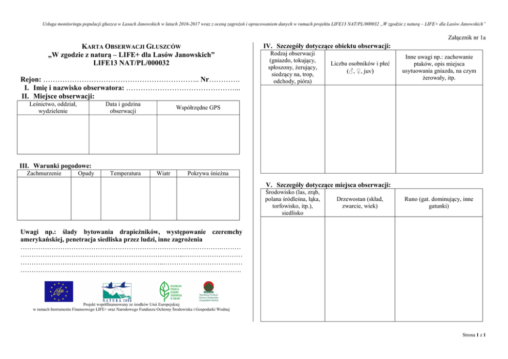 Usługa monitoringu populacji głuszca w Lasach Janowskich w latach 2016-2017 wraz z oceną zagrożeń i opracowaniem danych w ramach projektu LIFE13 NAT/PL/000032 „W zgodzie z naturą – LIFE+ dla Lasów Janowskich” Załącznik nr 1a KARTA OBSERWACJI GŁUSZCÓW „W zgodzie z naturą – LIFE+ dla Lasów Janowskich” LIFE13 NAT/PL/000032 Rejon: ……………………………………………………….. Nr…………. I. Imię i nazwisko obserwatora: ………………………………………... II. Miejsce obserwacji: Leśnictwo, oddział, wydzielenie Data i godzina obserwacji IV. Szczegóły dotyczące obiektu obserwacji: Rodzaj obserwacji (gniazdo, tokujący, spłoszony, żerujący, siedzący na, trop, odchody, pióra) Liczba osobników i płeć (♂, ♀, juv) Inne uwagi np.: zachowanie ptaków, opis miejsca usytuowania gniazda, na czym żerowały, itp. Współrzędne GPS III. Warunki pogodowe: Zachmurzenie Opady Temperatura Wiatr Pokrywa śnieżna V. Szczegóły dotyczące miejsca obserwacji: Środowisko (las, zrąb, polana śródleśna, łąka, torfowisko, itp.), siedlisko Drzewostan (skład, zwarcie, wiek) Runo (gat. dominujący, inne gatunki) Uwagi np.: ślady bytowania drapieżników, występowanie czeremchy amerykańskiej, penetracja siedliska przez ludzi, inne zagrożenia ……………………………………………………………………………….……… ………………………………………………………………..……………………… ………………………………………………………..……………………………… ………………………………………………………………………………………. Projekt współfinansowany ze środków Unii Europejskiej w ramach Instrumentu Finansowego LIFE+ oraz Narodowego Funduszu Ochrony Środowiska i Gospodarki Wodnej Strona 1 z 1