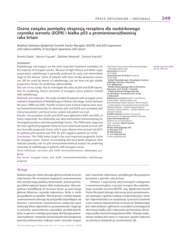 PRACE ORYGINALNE / ORIGINALS 249 Ocena związku pomiędzy ekspresją receptora dla naskórkowego czynnika wzrostu (EGFR) i białka p53 a promieniowrażliwością raka krtani Relation between Epidermal Growth Factor Receptor (EGFR) and p53 expression and radiocurability of laryngeal squamous cell cancer Dorota Dupla1, Marcin Frączek 2, Zdzisław Woźniak 3, Tomasz Kręcicki2 SUMMARY Radiotherapy and surgery are the most important treatment modalities for the majority of laryngeal cancers. Because of high efficacy and better organ preservation radiotherapy is generally preferred for early and intermediate stage of the disease. Some of patients with more locally advanced cancers can still be cured by means of radiotherapy, but we have not got reliable prognostics factors for predicting radiocurability. The aim of my study: was to investigate the value of p53 and EGFR expression for predicting clinical outcomes of laryngeal cancer patients treated with radiotherapy. Methods and materials: The study included 50 patients with laryngeal cancer treated in Department of Radiotherapy of Silesian Oncology Center between the years 1998 and 2003. Paraffin sections from archival material were studied immunohistochemically for detection p53 and EGFR and correlated with clinical parameters and local tumor control and patient survival. Results: Accumulation of p53 and EGFR were detected in 65% and 50% of tumor respectively. No relationship was observed between immunostaining for investigated proteins and clinicopathologic factors. The TNM tumor stage was the most significant prognostic factor for local control and overall survival. p53 was favorable prognostic factor with 5-years disease free survival rate 82% for patients p53-positive and 75% for p53-negative patients (p=0,04). Conclusion: The TNM tumor stage is the most important prognostic factor for laryngeal cancer. Tumors accumulating p53 have better prognosis what indicates possibly role for p53 immunohistochemical analysis for predicting outcomes of radiotherapy in patients with laryngeal cancer. ©by Polskie Towarzystwo Otorynolaryngologów – Chirurgów Głowy i Szyi Otrzymano/Received: 28.11.2008 Zaakceptowano do druku/Accepted: 16.02.2009 1 Zakład Teleradioterapii, Dolnośląskie Centrum Onkologii, Wrocław. Kierownik: dr B. Spytkowska 2 Klinika Otolaryngologii AM we Wrocławiu. Kierownik: prof. dr hab. T. Kręcicki 3 Zakład Anatomii Patologicznej AM we Wrocławiu. Kierownik: prof. dr hab. J. Rabczyński Wkład pracy autorów/Authors contribution: Dorota Dupla – główny badacz oraz przewodniczący zespołu autorów, Marcin Frączek – analiza danych oraz przygotowanie manuskryptu, Zdzisław Woźniak – analiza histopatologiczna materiału, Tomasz Kręcicki – analiza materiału oraz zebranie funduszy Konflikt interesu/Conflicts of interest: Autorzy pracy nie zgłaszają konfliktu interesów. Adres do korespondencji/ Address for correspondence: imię i nazwisko: Marcin Frączek adres pocztowy: Klinika Otolaryngologii AM ul. Borowska 213 50-556 Wrocław tel. 0 71 668 324 022 e-mail [email protected] Hasła indeksowe: rak krtani, p53, EGFR, immunohistochemia, radioterapia, prognoza Key words: laryngeal cancer, p53, EGFR, immunohistochemistry, radiotherapy, prognosis Wstęp Radioterapia jest obok chirurgii główną metodą leczenia raka krtani. We wczesnych stopniach zaawansowania obie metody mają podobną skuteczność, jednak przewagą radioterapii jest lepszy efekt funkcjonalny. Obecnie, podczas kwalifikacji do leczenia brane są pod uwagę głównie kliniczne czynniki rokownicze, które w wielu przypadkach są zawodne. Wśród guzów o niskim stopniu zaawansowania zdarzają się przypadki niepoddające się leczeniu i przeciwnie zaawansowane miejscowo guzy wykazują dobrą odpowiedź na promieniowanie. Sugeruje to potrzebę wprowadzenia czynników predykcyjnych, które w oparciu o biologię guza lepiej określą jego promieniowrażliwość. Poznanie mechanizmów karcinogenezy pozwala jednocześnie wskazać nowe czynniki mogące Otolar yngologia Polska tom 63, nr 3, maj – c zer wiec 20 0 9 mieć znaczenie rokownicze i predykcyjne dla pacjentów leczonych z powodu raka krtani. Jednym z najczęściej aktywowanych onkogenów w nowotworach głowy i szyi jest receptor dla naskórkowego czynnika wzrostu (EGFR, ang. Epidermal Growth Factor Receptor) którego aktywacja przez promieniowanie jonizujące spełnia funkcję cytoprotekcyjną i może być odpowiedzialna za repopulację i przeżycie komórek a tym samym niepowodzenie leczenia [1]. Radioterapia jest także jednym z głównych czynników powodujących aktywację białka p53 i włączenie mechanizmu obronnego punktu kontroli integralności DNA. Dlatego uszkodzenie funkcji p53 może w znaczący sposób wpływać na przeżycie komórek po naświetlaniu [2]. Otolaryngol Pol 2009; 63 (3): 249-255 250 PRACE ORYGINALNE / ORIGINALS Celem pracy było określenie wartości predykcyjnej EGFR i białka p53 w prognozowaniu skuteczności radioterapii, poprzez ustalenie związku ekspresji ocenianych markerów z ryzykiem wznowy miejscowej i przeżyciem swoistym pacjentów z rakiem płaskonabłonkowym krtani leczonych samodzielną radioterapią. Materiał i metody Do badań włączono 50 chorych leczonych w Zakładzie Teleradioterapii Dolnośląskiego Centrum Onkologii we Wrocławiu w latach 1998–2003. Wśród chorych było 40 mężczyzn i 10 kobiet. Wiek pacjentów wahał się od 33 do 82 lat (średnia 61 lat). Kliniczne zaawansowanie nowotworu określone za pomocą klasyfikacji TNM wg UICC. Wśród chorych były 4 przypadki raka przedinwazyjnego (Tis), 20 chorych z guzem T1, 20 z T2, 5 z T3 i 1 z T4. W 46 przypadkach nie stwierdzono obecności przerzutów do węzłów chłonnych, 2 chorych oceniono jako N1 a pozostałych 2 jako N2. Pierwszy stopień zaawansowania stwierdzono u 19 chorych, II u 18, III u 7 i IVa u 2 pacjentów. U 39 pacjentów guz nowotworowy zlokalizowany był w głośni a w 1