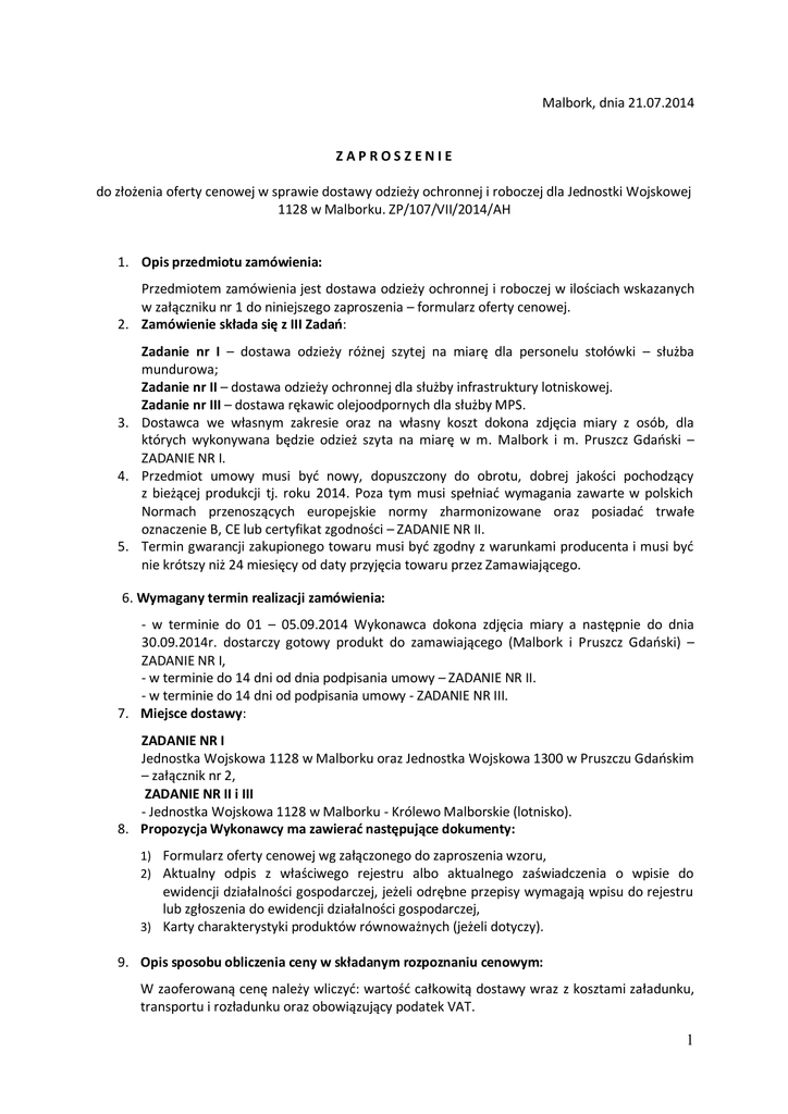Malbork, dnia 21.07.2014 ZAPROSZENIE do złożenia oferty cenowej w sprawie dostawy odzieży ochronnej i roboczej dla Jednostki Wojskowej 1128 w Malborku. ZP/107/VII/2014/AH 1. Opis przedmiotu zamówienia: Przedmiotem zamówienia jest dostawa odzieży ochronnej i roboczej w ilościach wskazanych w załączniku nr 1 do niniejszego zaproszenia – formularz oferty cenowej. 2. Zamówienie składa się z III Zadań: Zadanie nr I – dostawa odzieży różnej szytej na miarę dla personelu stołówki – służba mundurowa; Zadanie nr II – dostawa odzieży ochronnej dla służby infrastruktury lotniskowej. Zadanie nr III – dostawa rękawic olejoodpornych dla służby MPS. 3. Dostawca we własnym zakresie oraz na własny koszt dokona zdjęcia miary z osób, dla których wykonywana będzie odzież szyta na miarę w m. Malbork i m. Pruszcz Gdański – ZADANIE NR I. 4. Przedmiot umowy musi być nowy, dopuszczony do obrotu, dobrej jakości pochodzący z bieżącej produkcji tj. roku 2014. Poza tym musi spełniać wymagania zawarte w polskich Normach przenoszących europejskie normy zharmonizowane oraz posiadać trwałe oznaczenie B, CE lub certyfikat zgodności – ZADANIE NR II. 5. Termin gwarancji zakupionego towaru musi być zgodny z warunkami producenta i musi być nie krótszy niż 24 miesięcy od daty przyjęcia towaru przez Zamawiającego. 6. Wymagany termin realizacji zamówienia: - w terminie do 01 – 05.09.2014 Wykonawca dokona zdjęcia miary a następnie do dnia 30.09.2014r. dostarczy gotowy produkt do zamawiającego (Malbork i Pruszcz Gdański) – ZADANIE NR I, - w terminie do 14 dni od dnia podpisania umowy – ZADANIE NR II. - w terminie do 14 dni od podpisania umowy - ZADANIE NR III. 7. Miejsce dostawy: ZADANIE NR I Jednostka Wojskowa 1128 w Malborku oraz Jednostka Wojskowa 1300 w Pruszczu Gdańskim – załącznik nr 2, ZADANIE NR II i III - Jednostka Wojskowa 1128 w Malborku - Królewo Malborskie (lotnisko). 8. Propozycja Wykonawcy ma zawierać następujące dokumenty: 1) Formularz oferty cenowej wg załączonego do zaproszenia wzoru, 2) Aktualny odpis z właściwego rejestru albo aktualnego zaświadczenia o wpisie do ewidencji działalności gospodarczej, jeżeli odrębne przepisy wymagają wpisu do rejestru lub zgłoszenia do ewidencji działalności gospodarczej, 3) Karty charakterystyki produktów równoważnych (jeżeli dotyczy). 9. Opis sposobu obliczenia ceny w składanym rozpoznaniu cenowym: W zaoferowaną cenę należy wliczyć: wartość całkowitą dostawy wraz z kosztami załadunku, transportu i rozładunku oraz obowiązujący podatek VAT. 1 10. Opis sposobu przygotowania oferty cenowej: a) Formularz ofert cenowej, wraz z dokumentami określonymi w pkt. 8, należy przesłać pocztą elektroniczną, na adres: [email protected] lub przesłać na adres: Jednostka Wojskowa 1128 Kancelaria Jawna, ul. 17 Marca 20, 82 – 200 Malbork, z dopiskiem: Oferta – odzież robocza ZADANIE NR …………... 11. Sposób oceny ofert: a) Ocenie podlegają oferty zawierające wszystkie pozycje wymienione w formularzu oferty cenowej. Niedopuszczalna jest zmiana asortymentu czy ilości wymienionych w załączniku nr 1. b) Kryterium wyboru oferty najkorzystniejszej: cena 100% c) Sposób porównania ofert: oferty zostaną przeliczone zgodnie ze wzorem: cena oferty najniższej/cena oferty badanej x 100 x 100% Oferta najkorzystniejsza to ta, która uzyska największą ilość punktów w kryterium cena. 12. Istotne postanowienia które zostaną wprowadzone do treści umowy: a) Wykonawca zapłaci Zamawiającemu kary umowne za zawinione niewykonanie lub nienależyte wykonanie umowy w następujących przypadkach i wysokości: - 10% wartości brutto umowy, gdy Zamawiający odstąpi od umowy z powodu okoliczności, za które odpowiada Wykonawca, - 10% wartości brutto umowy, gdy Wykonawca nie wykona zamówienia w całości, bądź nawet w jakiejś jego części, - 0,12% wartości brutto niedostarczonego w terminie towaru, w przypadku nieuzasadnionej zwłoki w realizacji zamówienia – za każdy dzień zwłoki w stosunku do terminów określonych w pkt. 6. b) warunki płatności: faktury będą płatne 30 dni od dnia dostarczenia przez Wykonawcę faktury do Zamawiającego. 13. Miejsce i termin złożenia rozpoznania cenowego: Formularz oferty cenowej należy złożyć lub przesłać w terminie: do dnia 29 lipca 2014 roku, do godz. 10:00. 14. Osobą uprawnioną do kontaktów z Wykonawcami jest: Agnieszka Halama, faks: 55 620 67 13 , e-mail: [email protected] Informacje techniczne dot. zamawianych materiałów (ZADANIE NR I): p. Jolanta PIASECKA tel. 55 620 62 62 Informacje techniczne dot. zamawianych materiałów (ZADANIE NR II): sierż. Tomasz WANATOWSKI tel. 504 262 053 Informacje techniczne dot. zamawianych materiałów (ZADANIE NR III): sierż. Roman SUROWIEC tel. 55 620 62 26 Załączniki: 1. formularz oferty cenowej 2. Miejsce dostawy towaru DOWÓDCA …………………………….. spr. J. Narloch …………. Wykonano w 1 egz.: Egz. Nr 1 – ad acta Wykonała: A. Halama (tel. 55 620 67 13) Dostęp do dokumentu: sekcja zamówień Publicznych 2 Załącznik nr 1 ................................... ............................ (pieczęć firmowa) (miejscowość, data) OFERTA CENOWA Odpowiadając na zaproszenie do złożenia oferty cenowej na dostawę odzieży ochronnej i roboczej dla Jednostki Wojskowej 1128 w Malborku: 1. Oferuję wykonanie przedmiotu zamówienia zgodnie z wymogami opisu przedmiotu zamówienia, za kwotę w wysokości: ZADANIE NR I netto: ............................................... zł, podatek VAT ........ %, brutto: ............................................ zł, (słownie: ..........................................................................................................................) ZADANIE NR II netto: ............................................... zł, podatek VAT ........ %, brutto: ............................................ zł, (słownie: 