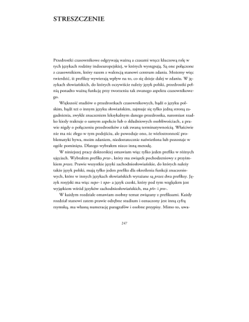 STRESZCZENIE Przedrostki czasownikowe odgrywają ważną a czasami wręcz kluczową rolę w tych językach rodziny indoeuropejskiej, w których występują. Są one połączone z czasownikiem, który razem z walencją stanowi centrum zdania. Możemy więc twierdzić, iż prefiksy wywierają wpływ na to, co się dzieje dalej w zdaniu. W językach słowiańskich, do których oczywiście należy język polski, przedrostki pełnią ponadto ważną funkcję przy tworzeniu tak zwanego aspektu czasownikowego. Większość studiów o przedrostkach czasownikowych, bądź o języku polskim, bądź też o innym języku słowiańskim, zajmuje się tylko jedną stroną zagadnienia, zwykle znaczeniem leksykalnym danego przedrostka, natomiast rzadko kiedy traktuje o samym aspekcie lub o składniowych osobliwościach, a prawie nigdy o połączeniu przedrostków z tak zwaną terminatywnością. Właściwie nie ma nic złego w tym podejściu, ale powoduje ono, że wielostronność problematyki bywa, moim zdaniem, niedostatecznie naświetlona lub pozostaje w ogóle pominięta. Dlatego wybrałem nieco inną metodę. W niniejszej pracy doktorskiej omawiam więc tylko jeden prefiks w różnych ujęciach. Wybrałem prefiks prze-, który ma związek pochodzeniowy z przyimkiem przez. Prawie wszystkie języki zachodniosłowiańskie, do których należy także język polski, mają tylko jeden prefiks dla określenia funkcji znaczeniowych, które w innych językach słowiańskich wyrażane są przez dwa prefiksy. Język rosyjski ma więc nepe- i npo- a język czeski, który pod tym względem jest wyjątkiem wśród języków zachodniosłowiańskich, ma pře- i pro-. W każdym rozdziale omawiam osobny temat związany z prefiksami. Każdy rozdział stanowi zatem prawie odrębne studium i oznaczony jest inną cyfrą rzymską, ma własną numerację paragrafów i osobne przypisy. Mimo to, uwa- 247 STUDIES ON THE POLISH VERBAL PREFIX PRZE- żam, iż praca ta stanowi integralną całość. Każdorazowo stosowałem jako przykład przedrostek prze-, toteż rozdziały stanowią tak zwane case studies. W pierwszym rozdziale pracy zajmuję się znaczeniem przedrostka prze-. Znaczenie prefiksu należy analizować wraz z czasownikiem podstawowym, z którym on występuje. Skoro prefiks nigdy nie występuje sam, należy porównywać znaczenie danego wyrazu złożonego (z prefiksem) ze znaczeniem czasownika podstawowego. Wychodząc z tego założenia zarówno leksykografowie większości słowników polskich jak i inni badacze tego tematu sporządzili obszerne spisy poszczególnych wariantów znaczeniowych. Jak już wspomniano wyżej, znaczenie prefiksu prze- pokrywa się ze znaczeniami dwóch prefiksów w innych językach słowiańskich, a więc pod kątem znaczeniowym fakt ten stanowi dodatkową komplikację. Udało mi się jednak drogą porównywania zredukować sporą ilość wariantów znaczeniowych do dwóch podstawowych wariantów. Z ich wspólnych cech wyodrębniłem model elementarnego inwariantu znaczeniowego przedrostka prze-. Ważną, moim zdaniem, cechą znaczeniową wszystkich prefiksów jest to, że przedstawiają i opisują daną sytuację w obrębie dwóch przeciwstawnych „pozycji”, które w niniejszej pracy określiłem jako „starą” i „nową”. Wynikiem tej cechy jest to, iż każdy czasownik rozszerzony prefiksem jest terminatywny. Dalej poświęcam jeszcze parę słów tematowi korelacji terminatywności z ową charakterystyką. Najpierw jednak krótko opisuję stosowany przeze mnie model terminatywności. Podstawą tego modelu jest teoria Maslova (1961), która została obszernie rozwinięta przez Barentsena (1985, 1995, 2003). Mówiąc w skrócie, Barentsen przedstawia sytuację terminatywną jako składającą się z trzech faz: XYZ. Faza początkowa X wchodzi w fazę końcową Z poprzez czynność (proces itd.) Y wyrażaną przez czasownik. Wraz z zakończeniem czynności (procesu itd.) zmienia się więc także sytuacja od X do Z. „Moment” przejścia od Y do Z, a więc moment zakończenia czynności (procesu itd.) nazywamy ‘transitus’. Następnie przechodzę do już zapowiedzianej korelacji między znaczeniem prefiksu a modelem terminatywności. Istnieje więc bezpośredni związek między przywołaną 248 STRESZCZENIE poprzez prefiks pozycją „starą” i fazą początkową X modelu terminatywności. Taka sama zależność istnieje pomiędzy pozycją „nową” i fazą końcową Z. Prefiks opisuje zatem w gruncie rzeczy te dwie fazy schematu XYZ. W drugim rozdziale rozpatruję korelację między prefiksem a terminatywnością, jak również niektóre skutki tegoż związku. Terminatywność to właściwie cecha znaczeniowa czasowników słowiańskich: wszystkie czasowniki dokonane są terminatywne, czasowniki niedokonane zaś są albo nieterminatywne, albo terminatywne. Formalnie nieterminatywne czasowniki występują także w sytuacjach terminatywnych, kiedy to terminatywność jest wyrażana nie czasownikiem lecz inną częścią zdania. Ta funkcja może być pełniona przez różne części zdania, ale w tejże pracy opisałem tylko takie sytuacje, w których to dopełnienie bliższe stanowi o terminatywności. Niedokonane czasowniki terminatywne zajmują ważne miejsce w systemie aspektowym wszystkich języków słowiańskich, choć dokładne ich funkcje mogą się różnić w poszczególnych językach. Ogromna grupa tych tak zwanych wtórnie niedokonanych czasowników jest bardzo ciekawa. Ich prefiks określa niewątpliwą terminatywność. Czasowniki te umożliwiają polszczyźnie przedstawienie danej sytuacji jako jednoznacznie terminatywnej i niedokonanej. Stosuje się je w dwojaki sposób, choć nie każdy czasownik wtórnie niedokonany na to pozwala. Owszem, każdy z nich może występować na oznaczenie tak zwanego otwartego powtarzania (tj powtarzanie bez kwantyfikacji, czyli typu Ania zawsze przepisywałai swoje artykuły w przeciwieństwie do Ania przepisałap swoje a