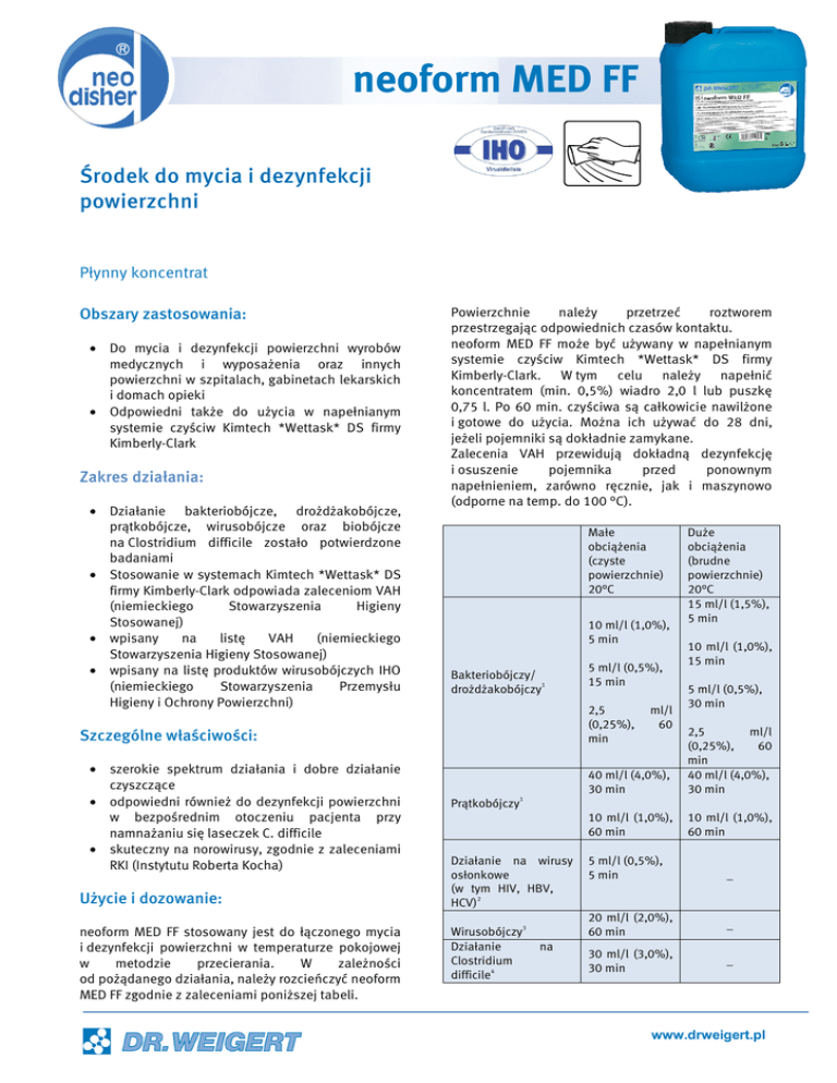 neoform MED FF Środek do mycia i dezynfekcji powierzchni Płynny koncentrat Obszary zastosowania: • Do mycia i dezynfekcji powierzchni wyrobów medycznych i wyposażenia oraz innych powierzchni w szpitalach, gabinetach lekarskich i domach opieki • Odpowiedni także do użycia w napełnianym systemie czyściw Kimtech *Wettask* DS firmy Kimberly-Clark Zakres działania: • Działanie bakteriobójcze, drożdżakobójcze, prątkobójcze, wirusobójcze oraz biobójcze na Clostridium difficile zostało potwierdzone badaniami • Stosowanie w systemach Kimtech *Wettask* DS firmy Kimberly-Clark odpowiada zaleceniom VAH (niemieckiego Stowarzyszenia Higieny Stosowanej) • wpisany na listę VAH (niemieckiego Stowarzyszenia Higieny Stosowanej) • wpisany na listę produktów wirusobójczych IHO (niemieckiego Stowarzyszenia Przemysłu Higieny i Ochrony Powierzchni) Powierzchnie należy przetrzeć roztworem przestrzegając odpowiednich czasów kontaktu. neoform MED FF może być używany w napełnianym systemie czyściw Kimtech *Wettask* DS firmy Kimberly-Clark. W tym celu należy napełnić koncentratem (min. 0,5%) wiadro 2,0 l lub puszkę 0,75 l. Po 60 min. czyściwa są całkowicie nawilżone i gotowe do użycia. Można ich używać do 28 dni, jeżeli pojemniki są dokładnie zamykane. Zalecenia VAH przewidują dokładną dezynfekcję i osuszenie pojemnika przed ponownym napełnieniem, zarówno ręcznie, jak i maszynowo (odporne na temp. do 100 °C). Małe obciążenia (czyste powierzchnie) 20°C 10 ml/l (1,0%), 5 min Bakteriobójczy/ 1 drożdżakobójczy 2,5 (0,25%), min Szczególne właściwości: • szerokie spektrum działania i dobre działanie czyszczące • odpowiedni również do dezynfekcji powierzchni w bezpośrednim otoczeniu pacjenta przy namnażaniu się laseczek C. difficile • skuteczny na norowirusy, zgodnie z zaleceniami RKI (Instytutu Roberta Kocha) Użycie i dozowanie: neoform MED FF stosowany jest do łączonego mycia i dezynfekcji powierzchni w temperaturze pokojowej w metodzie przecierania. W zależności od pożądanego działania, należy rozcieńczyć neoform MED FF zgodnie z zaleceniami poniższej tabeli. 5 ml/l (0,5%), 15 min ml/l 60 Duże obciążenia (brudne powierzchnie) 20°C 15 ml/l (1,5%), 5 min 10 ml/l (1,0%), 15 min 5 ml/l (0,5%), 30 min 40 ml/l (4,0%), 30 min 2,5 ml/l (0,25%), 60 min 40 ml/l (4,0%), 30 min 10 ml/l (1,0%), 60 min 10 ml/l (1,0%), 60 min Prątkobójczy1 Działanie na wirusy osłonkowe (w tym HIV, HBV, 2 HCV) Wirusobójczy3 Działanie Clostridium 4 difficile na 5 ml/l (0,5%), 5 min _ 20 ml/l (2,0%), 60 min _ 30 ml/l (3,0%), 30 min _ www.drweigert.pl neoform MED FF Ważne wskazówki dotyczące użycia: Oznakowanie CE: • Wyłącznie do zastosowań profesjonalnych. • Dla ekonomicznego i bezpiecznego dozowania produktu dostępne są odpowiednie środki techniczne. • Zaleca się użycie rękawic ochronnych podczas ręcznej pracy z środkami dezynfekcyjnymi. • Aby uniknąć pozostałości na powierzchniach, konieczne jest spłukanie wodą zdatną do picia po każdym czyszczeniu i dezynfekcji. • Proces dekontaminacji musi być zgodny ze wszystkimi wymaganiami Dyrektywy dot. wyrobów medycznych oraz spełniać zasady walidacji. • Nie mieszać z innymi produktami. neoform MED FF spełnia wymagania dotyczące wyrobów medycznych zgodnie z Dyrektywą 93/42/EWG, załącznik I. Magazynowanie: Przechowywać w szczelnie zamkniętych pojemnikach w temperaturach od 0 do 25 °C. Przy prawidłowym magazynowaniu okres trwałości wynosi 4 lata od daty produkcji. Data ważności podana jest na etykiecie za symbolem . Rodzaje zagrożeń i zasady prawidłowego postępowania: Raporty / opinie: Wpisany na listę VAH (niemieckiego Stowarzyszenia Higieny Stosowanej). Skuteczność dezynfekcyjna została potwierdzona odpowiednimi badaniami. Raporty z badań dostępne są na życzenie. Kompatybilność oraz wytrzymałość systemu Kimtech *Wettask* DS Kimberly-Clark zgodnie z zaleceniami VAH, potwierdzone certyfikatem. Zamknięte opakowania należy usuwać jako odpady tylko po całkowitym opróżnieniu. Usuwanie resztek produktu według zaleceń zamieszczonych w karcie charakterystyki. Producent: Chemische Fabrik Dr.Weigert GmbH & Co. KG, Mühlenhagen 85, 20539 Hamburg/Niemcy Dane techniczne: Wartość pH Gęstość Lepkość Informacje dotyczące bezpieczeństwa i ochrony środowiska znajdują się w karcie charakterystyki dostępnej na stronie www.drweigert.pl ok. 4,5 (koncentrat, 20 °C) 1,0 g/cm3 (20 °C) < 10 mPa s PL 1.0 / 08.2014 Skład: Zawartość składników według Rozporządzenia WE 648/2004 w sprawie detergentów: Substancje aktywne w 100g: 5,0 g chlorki benzalkoniowe, 3,0 g chlorek didecylodimetyloamoniowy, 8,0 g glutaral (Glutaraldehyd) ________________________________________________________ 1 zgodnie z wytycznymi DGHM (Niemieckiego Towarzystwa Higieny i Mikrobiologii) 2 zgodnie z wytycznymi RKI/DVV (Instytutu Roberta Kocha / Niemieckiego Stowarzyszenia Zwalczania Chorób Wirusowych) 3 zgodnie z normą EN 13704 Powyższa informacja, odpowiednia do naszej aktualnej wiedzy, opisuje produkt w zakresie bezpieczeństwa. Odstępstwa od zaleceń stosowania nie gwarantują jakości produktu i nie pociągają za sobą roszczeń prawnych. Dr. Weigert Polska Sp. z o.o. ul. Wybrzeże Gdyńskie 6A • 01-531 Warszawa tel.: +4822 616 02 23 faks:+4822 617 81 21 [email protected] www.drweigert.pl