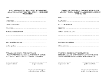 KARTA ZGŁOSZENIA NA ZAWODY WĘDKARSKIE „ZŁAPMY ZŁOTĄ RYBKĘ” DLA DZIECI I MŁODZIEŻY WOŹNIKI 2016 KARTA ZGŁOSZENIA NA ZAWODY WĘDKARSKIE „ZŁAPMY ZŁOTĄ RYBKĘ” DLA DZIECI I MŁODZIEŻY WOŹNIKI 2016 IMIĘ……………………………………………………………… IMIĘ……………………………………………………………… NAZWISKO …………………………………………………….. NAZWISKO …………………………………………………….. DATA URODZENIA ……………………………………………. DATA URODZENIA ……………………………………………. TELEFON ……………………………………………………….. TELEFON ……………………………………………………….. ADRES ZAMIESZKANIA ……………………………………… ADRES ZAMIESZKANIA ……………………………………… ……………………………………………………………………. ……………………………………………………………………. ……………………………………………………………………. ……………………………………………………………………. Imię i nazwisko opiekuna …………………………...................... Imię i nazwisko opiekuna …………………………...................... telefon opiekuna …………………………………………………. telefon opiekuna …………………………………………………. WYRAŻAM ZGODĘ NA WYKORZYSTANIE I PRZETWARZANIE DANYCH ZAWARTYCH W KARCIE ZGŁOSZENIA PRZEZ ORGANZATORÓW ZAWODÓW WYRAŻAM ZGODĘ NA WYKORZYSTANIE I PRZETWARZANIE DANYCH ZAWARTYCH W KARCIE ZGŁOSZENIA PRZEZ ORGANZATORÓW ZAWODÓW …………………… miejscowość data …………………… miejscowość data …………………………….. podpis uczestnika …………………………… podpis dorosłego opiekuna …………………………….. podpis uczestnika …………………………… podpis dorosłego opiekuna