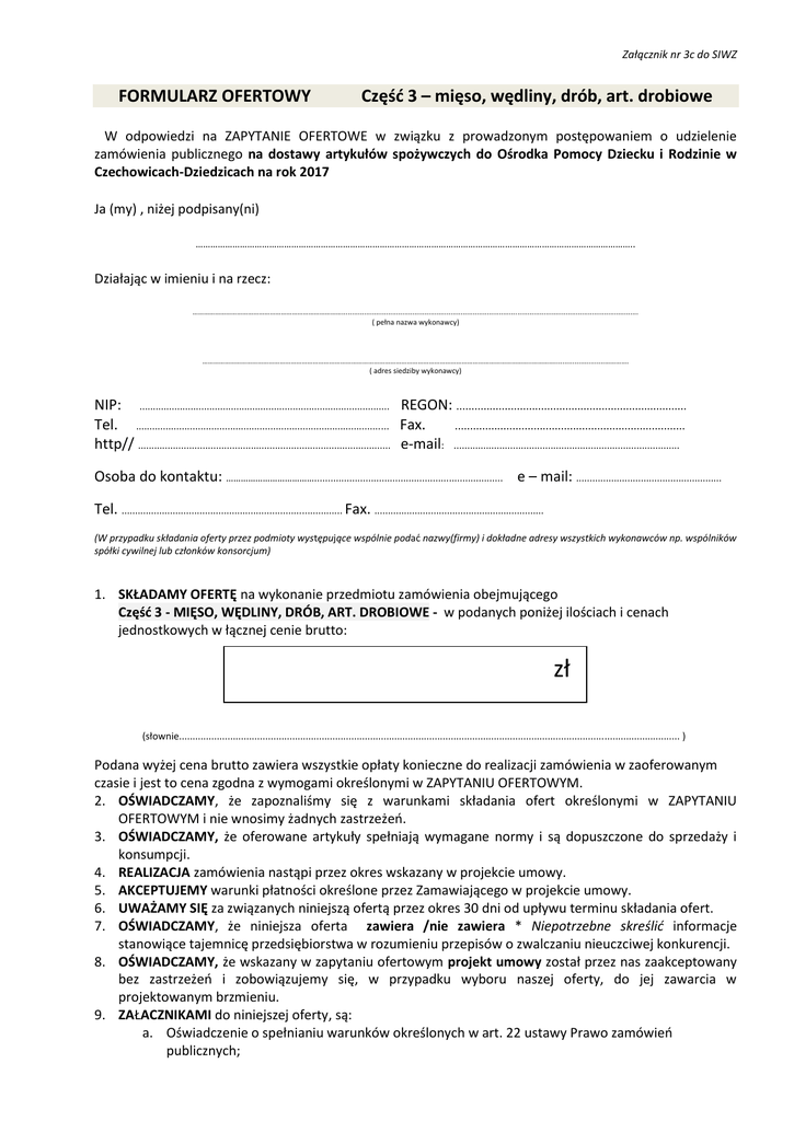 FORMULARZ OFERTOWY Część 3 – mięso, wędliny, drób, art