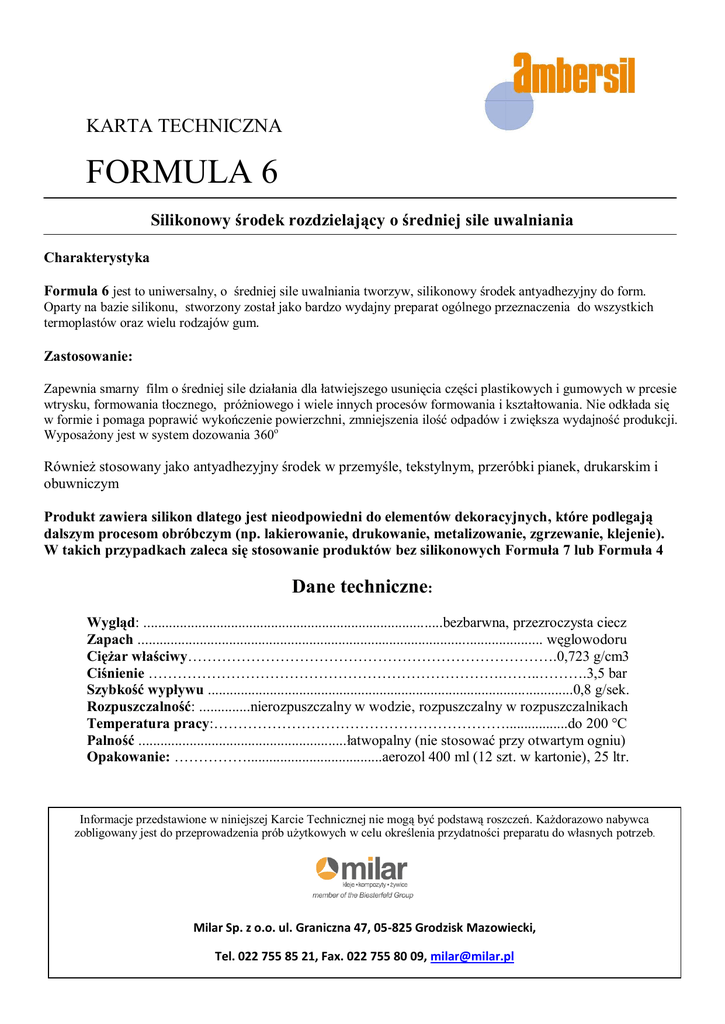 KARTA TECHNICZNA FORMULA 6 Silikonowy środek rozdzielający o średniej sile uwalniania Charakterystyka Formula 6 jest to uniwersalny, o średniej sile uwalniania tworzyw, silikonowy środek antyadhezyjny do form. Oparty na bazie silikonu, stworzony został jako bardzo wydajny preparat ogólnego przeznaczenia do wszystkich termoplastów oraz wielu rodzajów gum. Zastosowanie: Zapewnia smarny film o średniej sile działania dla łatwiejszego usunięcia części plastikowych i gumowych w prcesie wtrysku, formowania tłocznego, próżniowego i wiele innych procesów formowania i kształtowania. Nie odkłada się w formie i pomaga poprawić wykończenie powierzchni, zmniejszenia ilość odpadów i zwiększa wydajność produkcji. Wyposażony jest w system dozowania 360o Również stosowany jako antyadhezyjny środek w przemyśle, tekstylnym, przeróbki pianek, drukarskim i obuwniczym Produkt zawiera silikon dlatego jest nieodpowiedni do elementów dekoracyjnych, które podlegają dalszym procesom obróbczym (np. lakierowanie, drukowanie, metalizowanie, zgrzewanie, klejenie). W takich przypadkach zaleca się stosowanie produktów bez silikonowych Formuła 7 lub Formuła 4 Dane techniczne: Wygląd: ..................................................................................bezbarwna, przezroczysta ciecz Zapach ............................................................................................................... węglowodoru Ciężar właściwy………………………………………………………………….0,723 g/cm3 Ciśnienie ……………………………………………………………….……..……….3,5 bar Szybkość wypływu ....................................................................................................0,8 g/sek. Rozpuszczalność: ..............nierozpuszczalny w wodzie, rozpuszczalny w rozpuszczalnikach Temperatura pracy:…………………………………………………….................do 200 °C Palność .........................................................łatwopalny (nie stosować przy otwartym ogniu) Opakowanie: …………….....................................aerozol 400 ml (12 szt. w kartonie), 25 ltr. Informacje przedstawione w niniejszej Karcie Technicznej nie mogą być podstawą roszczeń. Każdorazowo nabywca zobligowany jest do przeprowadzenia prób użytkowych w celu określenia przydatności preparatu do własnych potrzeb. Milar Sp. z o.o. ul. Graniczna 47, 05-825 Grodzisk Mazowiecki, Tel. 022 755 85 21, Fax. 022 755 80 09, [email protected] Sposób użycia: Nanosić cienką warstwę ciągłym strumieniem z odległości ok. 25 do 30 cm. Dodatkowe informacje - System rozpylania 360 °C umożliwia wielokierunkowe zastosowanie do całkowitego pokrycia i maksymalną kontrolę Przeznaczenie: - przetwórstwo gum i termoplastów - formowanie próżniowe - wytłaczanie - odlewanie Przechowywanie: Produkt może być przechowywany w temperaturze otoczenia i posiada okres przechowywania nie mniejszy niż 72 miesiące, przy poprawnym, magazynowaniu. Aerozole powinny zawsze być przechowywać w temperaturze poniżej 50 ° C, z dala od źródeł ciepła i otwartego ognia. Bezpieczeństwo: Karta charakterystyki produktu dostępna osobno. Informacje przedstawione w niniejszej Karcie Technicznej nie mogą być podstawą roszczeń. Każdorazowo nabywca zobligowany jest do przeprowadzenia prób użytkowych w celu określenia przydatności preparatu do własnych potrzeb. Milar Sp. z o.o. ul. Graniczna 47, 05-825 Grodzisk Mazowiecki, Tel. 022 755 85 21, Fax. 022 755 80 09, [email protected]