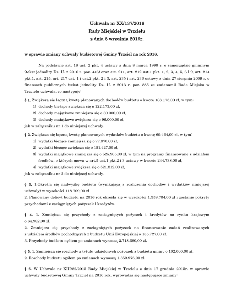 Uchwała nr XX/137/2016 Rady Miejskiej w Trzcielu z dnia 8 września 2016r. w sprawie zmiany uchwały budżetowej Gminy Trzciel na rok 2016. Na podstawie art. 18 ust. 2 pkt. 4 ustawy z dnia 8 marca 1990 r. o samorządzie gminnym (tekst jednolity Dz. U. z 2016 r. poz. 446) oraz art. 211, art. 212 ust.1 pkt. 1, 2, 3, 4, 5, 6 i 9, art. 214 pkt.1, art. 215, art. 217 ust. 1 i ust.2 pkt. 2 i 3, art. 235 i art. 236 ustawy z dnia 27 sierpnia 2009 r. o finansach publicznych (tekst jednolity Dz. U. z 2013 r. poz. 885 ze zmianami) Rada Miejska w Trzcielu uchwala, co następuje: § 1. Zwiększa się łączną kwotę planowanych dochodów budżetu o kwotę 188.173,00 zł, w tym: 1) dochody bieżące zwiększa się o 122.173,00 zł, 2) dochody majątkowe zmniejsza się o 30.000,00 zł, 3) dochody majątkowe zwiększa się o 96.000,00 zł, jak w załączniku nr 1 do niniejszej uchwały. § 2. Zwiększa się łączną kwotę planowanych wydatków budżetu o kwotę 69.464,00 zł, w tym: 1) wydatki bieżące zmniejsza się o 77.870,00 zł, 2) wydatki bieżące zwiększa się o 151.427,00 zł, 3) wydatki majątkowe zmniejsza się o 525.905,00 zł, w tym na programy finansowane z udziałem środków, o których mowa w art.5 ust.1 pkt.2 i 3 ustawy w kwocie 244.738,00 zł, 4) wydatki majątkowe zwiększa się o 521.812,00 zł, jak w załączniku nr 2 do niniejszej uchwały. § 3. 1.Określa się nadwyżkę budżetu (wynikającą z rozliczenia dochodów i wydatków niniejszej uchwały) w wysokości 118.709,00 zł. 2. Planowany deficyt budżetu na 2016 rok określa się w wysokości 1.358.704,00 zł i zostanie pokryty przychodami z zaciągniętych pożyczek i kredytów. § 4. 1. Zmniejsza się przychody z zaciągniętych pożyczek i kredytów na rynku krajowym o 64.982,00 zł. 2. Zmniejsza się przychody z zaciągniętych pożyczek na finansowanie zadań realizowanych z udziałem środków pochodzących z budżetu Unii Europejskiej o 155.727,00 zł. 3. Przychody budżetu ogółem po zmianach wynoszą 2.718.680,00 zł. § 5. 1. Zmniejsza się rozchody z tytułu udzielonych pożyczek z budżetu gminy o 102.000,00 zł. 2. Rozchody budżetu ogółem po zmianach wynoszą 1.359.976,00 zł. § 6. W Uchwale nr XIII/82/2015 Rady Miejskiej w Trzcielu z dnia 17 grudnia 2015r. w sprawie uchwały budżetowej Gminy Trzciel na 2016 rok, wprowadza się następujące zmiany: 1. § 6. Otrzymuje brzmienie: „§ 6. Ustala się limit zobowiązań: 1) na pokrycie występującego w ciągu roku przejściowego deficytu budżetu do kwoty 400.000,00 zł, 2) na finansowanie planowanego deficytu budżetu do kwoty 1.358.704,00 zł, w tym na wyprzedzające finansowanie działań finansowanych ze środków pochodzących z budżetu Unii Europejskiej do kwoty 224.980,00 zł, 3) na spłatę wcześniej zaciągniętych zobowiązań z tytułu kredytów i pożyczek do kwoty 746.276,00 zł. 2. Załącznik nr 3 „Przychody i rozchody budżetu w 2016 r.” otrzymuje brzmienie jak załącznik nr 3 do niniejszej uchwały. 3. Załącznik nr 5 „Zestawienie planowanych dotacji z budżetu Gminy Trzciel na 2016 rok” otrzymuje brzmienie jak załącznik nr 4 do niniejszej uchwały. 4. Załącznik nr 7 „Wydatki z budżetu Gminy Trzciel w ramach Funduszu Sołeckiego na 2016 rok” otrzymuje brzmienie jak załącznik nr 5 do niniejszej uchwały. § 7. Po zmianach określa się łączną kwotę planowanych dochodów Gminy w wysokości 23.623.394,98 zł, w tym: 1) dochody bieżące - 23.426.903,98 zł, 2) dochody majątkowe - 196.491,00 zł. § 8. Po zmianach określa się łączną kwotę planowanych wydatków Gminy w wysokości 24.982.098,98 zł, w tym: 1) wydatki bieżące - 22.748.047,98 zł, 2) wydatki majątkowe - 2.234.051,00 zł. § 9. Wykonanie uchwały powierza się Burmistrzowi Trzciela. § 10. Uchwała wchodzi w życie z dniem podjęcia. Uzasadnienie Dochody 1. Zwiększenie w rozdziale 75801 z tytułu otrzymanych środków z rezerwy części oświatowej subwencji ogólnej w kwocie 10.000,00 zł, z przeznaczeniem w rozdziale 80101 na dofinansowanie wyposażenia gabinetów profilaktyki zdrowotnej i pomocy przedlekarskiej oraz gabinetów stomatologicznych w szkołach/placówkach oświatowych. 2. Zwiększenie w rozdziale 75814 z tytułu zwrotu z budżetu państwa w formie dotacji celowej części wydatków wykonanych w 2015 roku w ramach Funduszu Sołeckiego w kwocie 43.402,20 zł. 3. Zwiększenie w rozdziale 80149 w kwocie 13.727,00 zł z tytułu refundacji przez Gminę Miedzichowo kosztów udzielonej dotacji dla niepublicznego przedszkola w Lutolu Suchym na dziecko niepełnosprawne będące mieszkańcem Gminy Miedzichowo. 4. Zwiększenie w rozdziale 85203 o 66.000,00 zł w związku z planowanym otrzymaniem dotacji z PFRON-u z przeznaczeniem na realizację zadania „Zakup samochodu 9-osobowego dostosowanego do przewozu osób niepełnosprawnych na potrzeby Środowiskowego Domu Samopomocy w Trzcielu”. 5. Zwiększenie w rozdziale 01095 o 30.000,00 zł - aktualizacja wykonanych dochodów ze sprzedaży gruntów na cele rolne. 6. Zmiany w rozdziale 70005: - zmniejszenie o 30.000,00 zł - aktualizacja wykonanych dochodów ze sprzedaży nieruchomości, - zwiększenie o 260,00 zł - aktualizacja wykonanych dochodów z opłat za trwały zarząd, - zwiększenie o 100,00 zł - aktualizacja wykonanych dochodów z różnych opłat, - zwiększenie o 838,80 zł - aktualizacja wykonanych dochodów z odsetek. 7. Zmiany w rozdziale 75615: - zwiększenie o 20.000,00 zł - aktualizacja wykonanych dochodów z wpływów z podatku od środków transportowych, - zwiększenie o 1.000,00 zł - aktualizacja wykonanych dochodów z wpływów z podatku od czynności cywilnoprawnych. 8. Zmiany w rozdziale 75616: - zwiększenie o 8.000,00 zł - aktualizacja wykonanych dochodów z wpływów z podatku od spadków i darowizn, - zwiększenie o 20.000,00 zł - aktualizacja wykonanych dochodów z wpływów z podatku od czynności cywilnoprawnych. 9. Zmiany w rozdziale 75618 - zwiększ