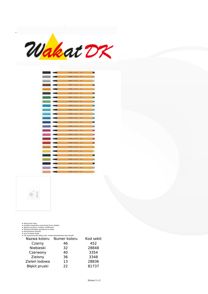 fabrycznie nowy produkt oryginalny niemieckiej firmy Stabilo idealny do pracy z linijką i szablonem fibrowa końcówka oprawiona w metal wentylowana skuwka tusz na bazie wody nie wysycha przez długi czas, nawet pozostawiony bez skuwki Nazwa koloru Czarny Niebieski Czerwony Zielony Zieleń lodowa Błękit pruski Numer koloru 46 32 40 36 13 22 Kod sebit 452 28848 3354 3348 28836 81737 Strona 1 z 2 Brzoskwiniowy Zieleń jasna Błękit ciemny Zieleń liściowa Żółty Brązowy Czerwień ciemna Błękit turkusowy Zieleń turkusowa Oranż Fiolet Róż Lazur Lila Jasny lila Ciemno zielony Ochra ciemna Szarzeń zimna jasna Szarzeń ciemna 26 33 41 43 44 45 50 81738 81739 3356 14636 28837 28843 14626 51 3359 53 113653 54 55 56 57 58 59 63 89 94 28842 28840 28839 28846 28841 81740 28847 5534 28845 96 28844 Strona 2 z 2