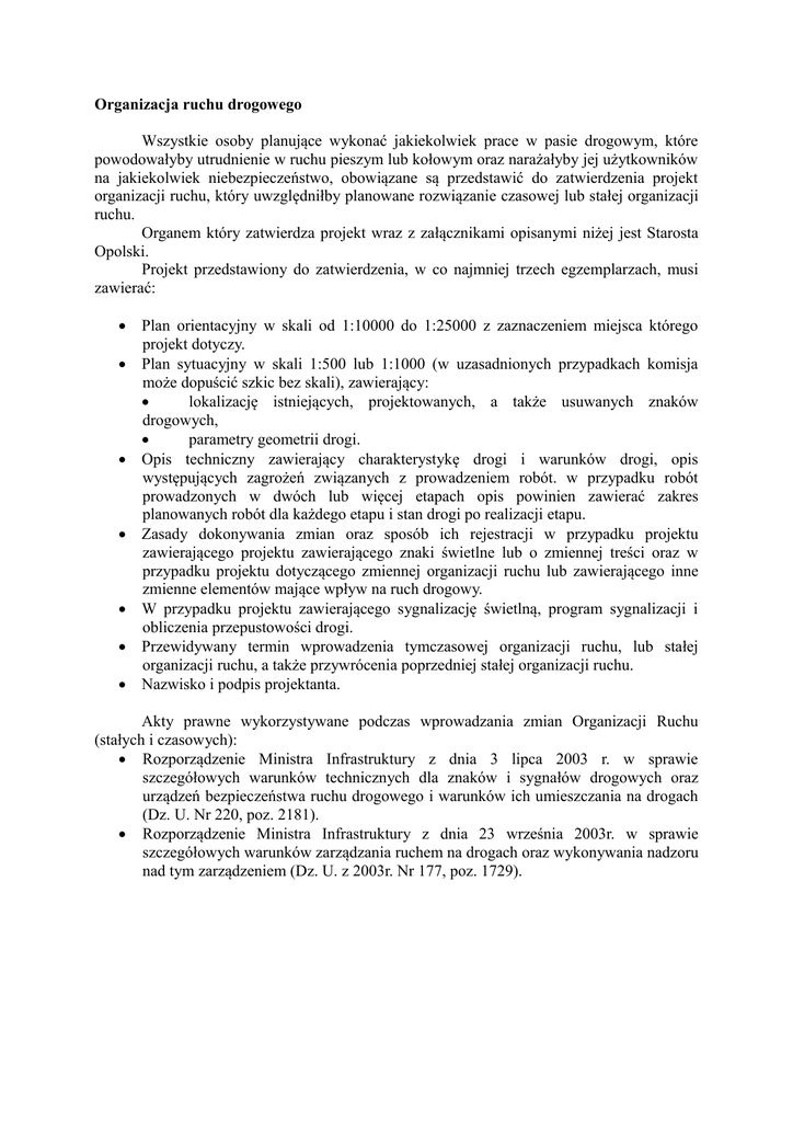 Organizacja ruchu drogowego Wszystkie osoby planujące wykonać jakiekolwiek prace w pasie drogowym, które powodowałyby utrudnienie w ruchu pieszym lub kołowym oraz narażałyby jej użytkowników na jakiekolwiek niebezpieczeństwo, obowiązane są przedstawić do zatwierdzenia projekt organizacji ruchu, który uwzględniłby planowane rozwiązanie czasowej lub stałej organizacji ruchu. Organem który zatwierdza projekt wraz z załącznikami opisanymi niżej jest Starosta Opolski. Projekt przedstawiony do zatwierdzenia, w co najmniej trzech egzemplarzach, musi zawierać: Plan orientacyjny w skali od 1:10000 do 1:25000 z zaznaczeniem miejsca którego projekt dotyczy. Plan sytuacyjny w skali 1:500 lub 1:1000 (w uzasadnionych przypadkach komisja może dopuścić szkic bez skali), zawierający: lokalizację istniejących, projektowanych, a także usuwanych znaków drogowych, parametry geometrii drogi. Opis techniczny zawierający charakterystykę drogi i warunków drogi, opis występujących zagrożeń związanych z prowadzeniem robót. w przypadku robót prowadzonych w dwóch lub więcej etapach opis powinien zawierać zakres planowanych robót dla każdego etapu i stan drogi po realizacji etapu. Zasady dokonywania zmian oraz sposób ich rejestracji w przypadku projektu zawierającego projektu zawierającego znaki świetlne lub o zmiennej treści oraz w przypadku projektu dotyczącego zmiennej organizacji ruchu lub zawierającego inne zmienne elementów mające wpływ na ruch drogowy. W przypadku projektu zawierającego sygnalizację świetlną, program sygnalizacji i obliczenia przepustowości drogi. Przewidywany termin wprowadzenia tymczasowej organizacji ruchu, lub stałej organizacji ruchu, a także przywrócenia poprzedniej stałej organizacji ruchu. Nazwisko i podpis projektanta. Akty prawne wykorzystywane podczas wprowadzania zmian Organizacji Ruchu (stałych i czasowych): Rozporządzenie Ministra Infrastruktury z dnia 3 lipca 2003 r. w sprawie szczegółowych warunków technicznych dla znaków i sygnałów drogowych oraz urządzeń bezpieczeństwa ruchu drogowego i warunków ich umieszczania na drogach (Dz. U. Nr 220, poz. 2181). Rozporządzenie Ministra Infrastruktury z dnia 23 września 2003r. w sprawie szczegółowych warunków zarządzania ruchem na drogach oraz wykonywania nadzoru nad tym zarządzeniem (Dz. U. z 2003r. Nr 177, poz. 1729).