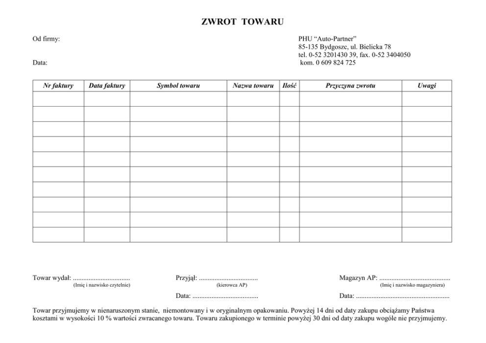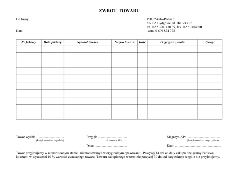 ZWROT TOWARU Od firmy: PHU “Auto-Partner” 85-135 Bydgoszc, ul. Bielicka 78 tel. 0-52 3201430 39, fax. 0-52 3404050 kom. 0 609 824 725 Data: Nr faktury Data faktury Towar wydał: ................................. (Imię i nazwisko czytelnie) Symbol towaru Nazwa towaru Przyjął: .................................. (kierowca AP) Data: ...................................... Ilość Przyczyna zwrotu Uwagi Magazyn AP: ......................................... (Imię i nazwisko magazyniera) Data: ...................................................... Towar przyjmujemy w nienaruszonym stanie, niemontowany i w oryginalnym opakowaniu. PowyŜej 14 dni od daty zakupu obciąŜamy Państwa kosztami w wysokości 10 % wartości zwracanego towaru. Towaru zakupionego w terminie powyŜej 30 dni od daty zakupu wogóle nie przyjmujemy.