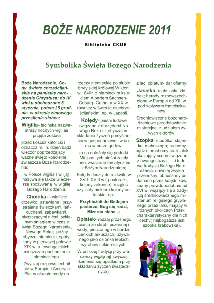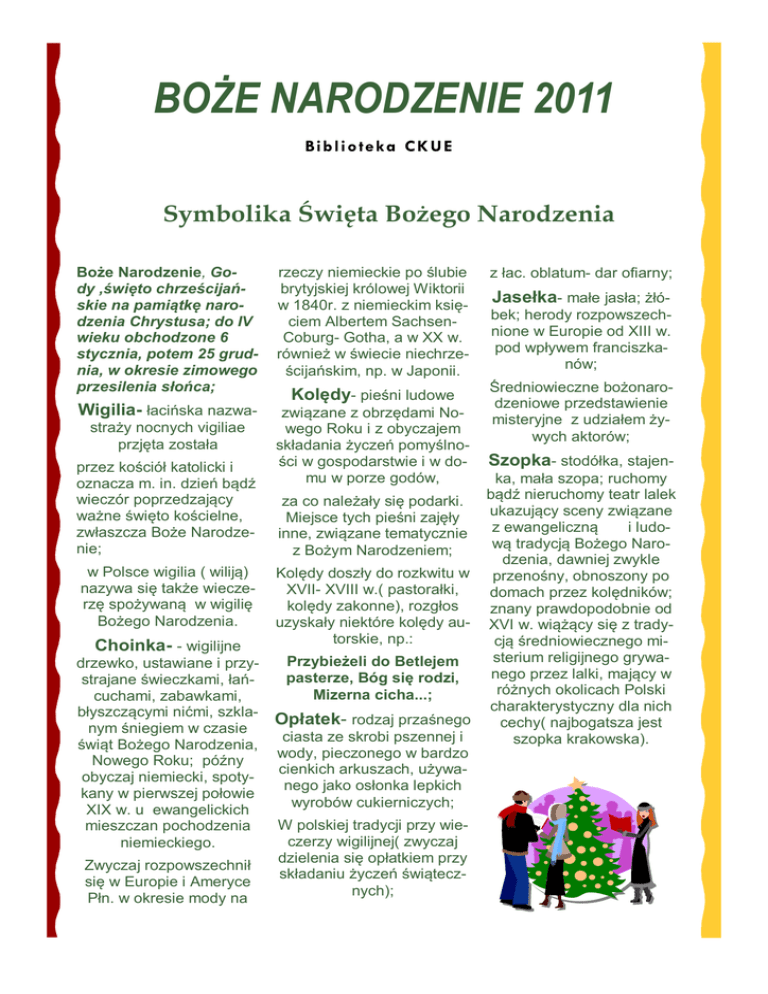 BOŻE NARODZENIE 2011 Biblioteka CKUE Symbolika Święta Bożego Narodzenia Boże Narodzenie, Gody ,święto chrześcijańskie na pamiątkę narodzenia Chrystusa; do IV wieku obchodzone 6 stycznia, potem 25 grudnia, w okresie zimowego przesilenia słońca; rzeczy niemieckie po ślubie brytyjskiej królowej Wiktorii w 1840r. z niemieckim księciem Albertem SachsenCoburg- Gotha, a w XX w. również w świecie niechrześcijańskim, np. w Japonii. z łac. oblatum- dar ofiarny; Wigilia- łacińska nazwa- Kolędy- pieśni ludowe związane z obrzędami Nowego Roku i z obyczajem składania życzeń pomyślności w gospodarstwie i w domu w porze godów, Średniowieczne bożonarodzeniowe przedstawienie misteryjne z udziałem żywych aktorów; straży nocnych vigiliae przjęta została przez kościół katolicki i oznacza m. in. dzień bądź wieczór poprzedzający ważne święto kościelne, zwłaszcza Boże Narodzenie; w Polsce wigilia ( wiliją) nazywa się także wieczerzę spożywaną w wigilię Bożego Narodzenia. Choinka- - wigilijne drzewko, ustawiane i przystrajane świeczkami, łańcuchami, zabawkami, błyszczącymi nićmi, szklanym śniegiem w czasie świąt Bożego Narodzenia, Nowego Roku; późny obyczaj niemiecki, spotykany w pierwszej połowie XIX w. u ewangelickich mieszczan pochodzenia niemieckiego. Zwyczaj rozpowszechnił się w Europie i Ameryce Płn. w okresie mody na za co należały się podarki. Miejsce tych pieśni zajęły inne, związane tematycznie z Bożym Narodzeniem; Kolędy doszły do rozkwitu w XVII- XVIII w.( pastorałki, kolędy zakonne), rozgłos uzyskały niektóre kolędy autorskie, np.: Przybieżeli do Betlejem pasterze, Bóg się rodzi, Mizerna cicha...; Opłatek- rodzaj przaśnego ciasta ze skrobi pszennej i wody, pieczonego w bardzo cienkich arkuszach, używanego jako osłonka lepkich wyrobów cukierniczych; W polskiej tradycji przy wieczerzy wigilijnej( zwyczaj dzielenia się opłatkiem przy składaniu życzeń świątecznych); Jasełka- małe jasła; żłóbek; herody rozpowszechnione w Europie od XIII w. pod wpływem franciszkanów; Szopka- stodółka, stajenka, mała szopa; ruchomy bądź nieruchomy teatr lalek ukazujący sceny związane z ewangeliczną i ludową tradycją Bożego Narodzenia, dawniej zwykle przenośny, obnoszony po domach przez kolędników; znany prawdopodobnie od XVI w. wiążący się z tradycją średniowiecznego misterium religijnego grywanego przez lalki, mający w różnych okolicach Polski charakterystyczny dla nich cechy( najbogatsza jest szopka krakowska). Wigilia wg „Encyklopedii staropolskiej” Glogera: „Wilja, wigiljaprzedświęcie, dzień święto poprzedzający, tak nazwany z łac. od czuwania, chrześcijanie bowiem noc poprzedzającą dni uroczyste na czuwaniu i modlitwie spędzali a zwykle i dzień przedświąteczny pościli. Najuroczyściej zaś z wieczorną ucztą postną obchodzili wigilię Bożego Narodzenia. Lud wiejski stawiał snopy po rogach izby, w której zasiadał do wieczerzy wigilijnej. Po uczcie, ze snopów żyta kręcił małe powrósła i wybiegłszy do sadu owiązuje niemi drzewa owocowe w przekonaniu, że będą lepiej rodziły; wieczerza wigilijna u ludu składała się zwykle z potraw 7-miu, szlachecka z 9 -ciu, pańska z 11-tu. Kto ilu potraw nie skosztuje, tyle go przyjemności w ciągu roku ominie... Po spożyciu wieczerzy wigilijnej, czy to w czacie czy w pańskim dworze, oboje gospodarstwo, zgromadziwszy rodzinę i domowników, spędzali resztę wieczora na śpiewaniu kolęd o Narodzeniu Jezusowem”. Zwyczaje górnośląskie w czasie świąt Bożego Narodzenia Przedświąteczne przygotowania. „Przed świętami są czynione pewne przygotowania, albowiem święta wymagają wiele, bardzo wiele urozmaicenia. Już podczas Adwentu matka w domu zbira jaja, masło, mak, rodzynki i inne przyprawy, które są potrzebne do pieczenia kołaczy i strucli. Im bliżej wilji, tem więcej krzątaniny w domu. Już kilka tygodni przed wilją postarał się ojciec o choinkę, a w tajemnicy przed dziećmi zbił zgrabną szopkę z cienkich desek, aby dać wyobrażenie szopki Betlejemskiej”. Przedwilijne prace i zwyczaje. „ W sam dzień wilijny najwięcej pracy i obowiązków spoczywa na kobiecie. Ona, jako gospodyni domu, musi dbać o to, aby wszystko potrzebne do wieczerzy sumiennie było przygotowane i aby wszystkie prace były wykonane, bo święta nie pozwalały na wykonywanie prac gospodarskich. Nawet gotowanie uskuteczniano na oba święta, bo w drugie święto wolno było tylko odgrzać jadło, lecz nie gotować. Przygotowanie całej wieczerzy wymagało wiele czasu. W izbie, w której miała się odbywać wieczerza, poroztrząsano na podłodze słomę. Niektórzy kładli tylko pod stół, do którego mieli zasiąść. Zwyczaj ten miał obecnym przy wieczerzy przedstawiać stajenkę, w której urodził się Zbawiciel. Na stół znów kładziono słomę, nad nią trochę siana, aby sobie wyobrazić żłóbek betlejemski. Siano na stole nakryto obrusem lub wprost na siano stawiano potrawy wilijne. Na stół musiały przyjść wszystkie potrawy wilijne tak, aby podczas wieczerzy nikt od stołu nie potrzebował odchodzić. Mniemano bowiem, że kto w wilję od stołu odejdzie przed ukończeniem wieczerzy, ten następnej wieczerzy nie doczeka. Kobiety zważały przeto, by na stół podać wszystko to co tylko potrzebne.” Wg Stanisława Wallisa,1935 r Str. 2 BOŻE NARODZENIE 2011 Wieczerza wilijna „Gdy dzieci zawołały: „ Pierwsza gwiazdka zaświeciła”, ojciec poszedł do stodoły i przyniósł cztery snopy zboża i wilijnej izbie postawił w każdym kącie po jednym snopie. Snopy ze słomą i ziarnem upodobniały izbę do stajenki w Betlejem i sprawiały nastrój iście pasterski i wilijny. kogo nie brakowało, wtenczas przed obrazem Matki Boskiej Częstochowskiej albo Piekarskiej wszyscy odmówili pobożnie pacierz z podziękowaniem Panu Bogu za przeżyty rok... Po odmówieniu modlitwy, ojciec w