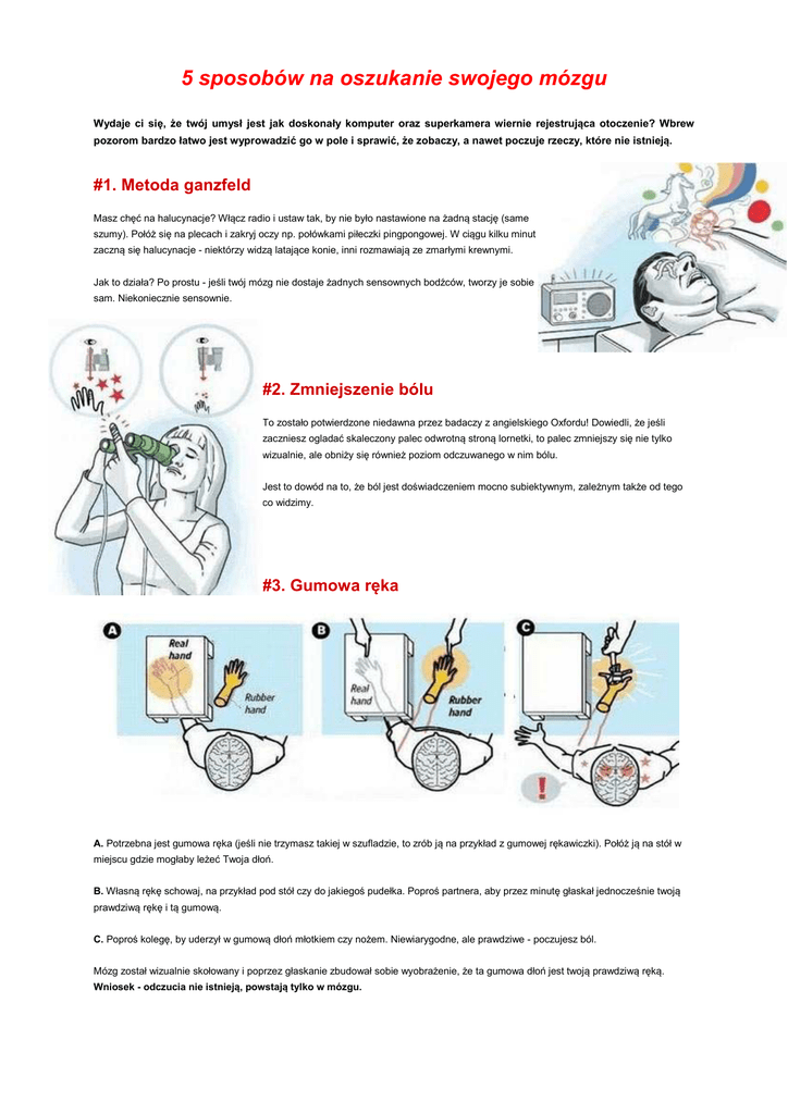 5 sposobów na oszukanie swojego mózgu Wydaje ci się, że twój umysł jest jak doskonały komputer oraz superkamera wiernie rejestrująca otoczenie? Wbrew pozorom bardzo łatwo jest wyprowadzić go w pole i sprawić, że zobaczy, a nawet poczuje rzeczy, które nie istnieją. #1. Metoda ganzfeld Masz chęć na halucynacje? Włącz radio i ustaw tak, by nie było nastawione na żadną stację (same szumy). Połóż się na plecach i zakryj oczy np. połówkami piłeczki pingpongowej. W ciągu kilku minut zaczną się halucynacje - niektórzy widzą latające konie, inni rozmawiają ze zmarłymi krewnymi. Jak to działa? Po prostu - jeśli twój mózg nie dostaje żadnych sensownych bodźców, tworzy je sobie sam. Niekoniecznie sensownie. #2. Zmniejszenie bólu To zostało potwierdzone niedawna przez badaczy z angielskiego Oxfordu! Dowiedli, że jeśli zaczniesz ogladać skaleczony palec odwrotną stroną lornetki, to palec zmniejszy się nie tylko wizualnie, ale obniży się również poziom odczuwanego w nim bólu. Jest to dowód na to, że ból jest doświadczeniem mocno subiektywnym, zależnym także od tego co widzimy. #3. Gumowa ręka A. Potrzebna jest gumowa ręka (jeśli nie trzymasz takiej w szufladzie, to zrób ją na przykład z gumowej rękawiczki). Połóż ją na stół w miejscu gdzie mogłaby leżeć Twoja dłoń. B. Własną rękę schowaj, na przykład pod stół czy do jakiegoś pudełka. Poproś partnera, aby przez minutę głaskał jednocześnie twoją prawdziwą rękę i tą gumową. C. Poproś kolegę, by uderzył w gumową dłoń młotkiem czy nożem. Niewiarygodne, ale prawdziwe - poczujesz ból. Mózg został wizualnie skołowany i poprzez głaskanie zbudował sobie wyobrażenie, że ta gumowa dłoń jest twoją prawdziwą ręką. Wniosek - odczucia nie istnieją, powstają tylko w mózgu. #4. Iluzja Pinokio Potrzebne są dwa krzesła ustawione jedno za drugim i przepaska na oczy. Człowiek z zawiązanymi oczami siada na krześle z tyłu, druga osoba siedzi z przodu. Osoba z zawiązanymi oczami wyciąga dłoń i kładzie ją na nosie siedzącego z przodu. Drugą dłoń kładzie na swój nos. Zarówno jedną jak i drugą dłonią gładzi nosy. W ciagu niecałej minuty pojawia się odczucie posiadania całkiem sporego nosa. #5. Zjawisko Purkinje Bardzo prosty i znany efekt. W słoneczny dzień zamknij oczy, zwróć twarz w kierunku słońca i powoli przesuwaj ręką przed oczami (zamkniętymi). Po jakimś czasie zaczniesz rozkoszować się różnokolorowymi kręgami zmieniającymi kolor i formę -ot takie LSD dla ubogich. Bierze się to, ze sposobu w jaki oko postrzega barwy. Autor: The Boston.com