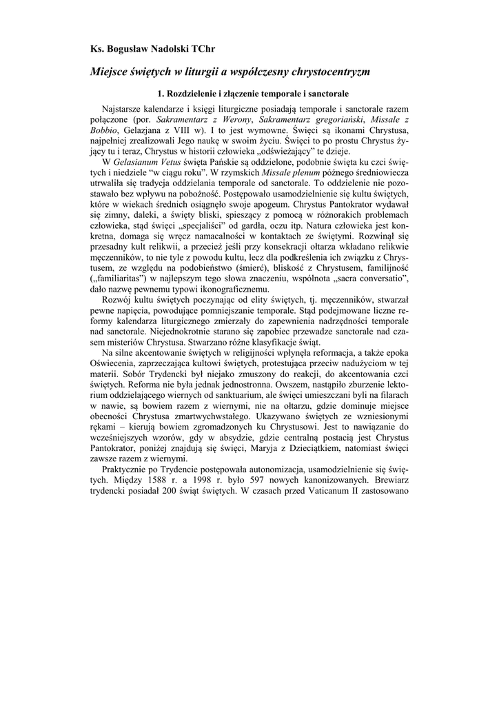 Ks. Bogusław Nadolski TChr Miejsce świętych w liturgii a współczesny chrystocentryzm 1. Rozdzielenie i złączenie temporale i sanctorale Najstarsze kalendarze i księgi liturgiczne posiadają temporale i sanctorale razem połączone (por. Sakramentarz z Werony, Sakramentarz gregoriański, Missale z Bobbio, Gelazjana z VIII w). I to jest wymowne. Święci są ikonami Chrystusa, najpełniej zrealizowali Jego naukę w swoim życiu. Święci to po prostu Chrystus żyjący tu i teraz, Chrystus w historii człowieka „odświeżający” te dzieje. W Gelasianum Vetus święta Pańskie są oddzielone, podobnie święta ku czci świętych i niedziele “w ciągu roku”. W rzymskich Missale plenum późnego średniowiecza utrwaliła się tradycja oddzielania temporale od sanctorale. To oddzielenie nie pozostawało bez wpływu na pobożność. Postępowało usamodzielnienie się kultu świętych, które w wiekach średnich osiągnęło swoje apogeum. Chrystus Pantokrator wydawał się zimny, daleki, a święty bliski, spieszący z pomocą w różnorakich problemach człowieka, stąd święci „specjaliści” od gardła, oczu itp. Natura człowieka jest konkretna, domaga się wręcz namacalności w kontaktach ze świętymi. Rozwinął się przesadny kult relikwii, a przecież jeśli przy konsekracji ołtarza wkładano relikwie męczenników, to nie tyle z powodu kultu, lecz dla podkreślenia ich związku z Chrystusem, ze względu na podobieństwo (śmierć), bliskość z Chrystusem, familijność („familiaritas”) w najlepszym tego słowa znaczeniu, wspólnota „sacra conversatio”, dało nazwę pewnemu typowi ikonograficznemu. Rozwój kultu świętych poczynając od elity świętych, tj. męczenników, stwarzał pewne napięcia, powodujące pomniejszanie temporale. Stąd podejmowane liczne reformy kalendarza liturgicznego zmierzały do zapewnienia nadrzędności temporale nad sanctorale. Niejednokrotnie starano się zapobiec przewadze sanctorale nad czasem misteriów Chrystusa. Stwarzano różne klasyfikacje świąt. Na silne akcentowanie świętych w religijności wpłynęła reformacja, a także epoka Oświecenia, zaprzeczająca kultowi świętych, protestująca przeciw nadużyciom w tej materii. Sobór Trydencki był niejako zmuszony do reakcji, do akcentowania czci świętych. Reforma nie była jednak jednostronna. Owszem, nastąpiło zburzenie lektorium oddzielającego wiernych od sanktuarium, ale święci umieszczani byli na filarach w nawie, są bowiem razem z wiernymi, nie na ołtarzu, gdzie dominuje miejsce obecności Chrystusa zmartwychwstałego. Ukazywano świętych ze wzniesionymi rękami – kierują bowiem zgromadzonych ku Chrystusowi. Jest to nawiązanie do wcześniejszych wzorów, gdy w absydzie, gdzie centralną postacią jest Chrystus Pantokrator, poniżej znajdują się święci, Maryja z Dzieciątkiem, natomiast święci zawsze razem z wiernymi. Praktycznie po Trydencie postępowała autonomizacja, usamodzielnienie się świętych. Między 1588 r. a 1998 r. było 597 nowych kanonizowanych. Brewiarz trydencki posiadał 200 świąt świętych. W czasach przed Vaticanum II zastosowano Ks. Bogusław Nadolski TChr 66 drobne retusze obchodów świętych. Generalnie zajął się problemem dopiero Sobór Watykański II1. 2. Prymat misterium paschalnego Stanowisko Soboru wyrażone zostało w Konstytucji o liturgii świętej, a następnie w dokumencie z 1969 r. Ogólne normy roku liturgicznego i kalendarza. Wspomniane dokumenty dają pierwszeństwo świętowaniu misterium Chrystusa. Nie powinno też być zbyt wiele obrazów świętych w kościele. Najważniejsze stwierdzenia podaje art. 104 KL podkreślając, że Kościół rozmieścił w ciągu roku wspomnienia męczenników i innych świętych, którzy dzięki łasce Bożej doszli do doskonałości, a osiągnąwszy już wieczne zbawienie, wyśpiewują Bogu w niebie doskonałą chwałę i wstawiają się za nas. W dniu ich śmierci, czyli w dniu narodzin dla nieba („dies natalis”) Kościół głosi misterium paschalne w świętych, którzy z Chrystusem współcierpieli i zostali w Nim współuwielbieni, przedstawia ich wiernym jako przykład pociągający wszystkich przez Chrystusa do Ojca, a przez ich zasługi wyjednywa Boże dobrodziejstwa. Jak wiadomo, reakcja na reformę kalendarza była często negatywna, co niewątpliwie świadczy o przywiązaniu wiernych do czci świętych. Jan Paweł II próbuje charakterystycznie łączyć pierwszeństwo misterium Chrystusa z kultem świętych. Święty bowiem wskazuje na Chrystusa, głosi możliwość realizacji nawet radykalizmu Ewangelii Chrystusa, a właściwie Chrystus działa w świętym. Świętując dni świętych, Kościół wychwala działanie Boga w nich, prymat tego działania, raduje się, że dokonała się wspaniała współpraca między łaską z Wysoka i danym świętym, że udała się „gra miłości”, że święty stał się doskonałym narzędziem Boga w budowaniu Bożego królestwa na ziemi. Papież jest mocno krytykowany za liczne kanonizacje i beatyfikacje. Uchodzi za papieża, który dokonał najwięcej kanonizacji i beatyfikacji. Patrzy on dalekosiężnie i wydaje się, że istnieją pewne owoce w ramach dialogu ekumenicznego. W 2000 r. opublikowano wynik współpracy między Kościołem katolickim i Zjednoczonym Kościołem Protestanckim Niemieckim (VELKD) pod znamiennym tytułem Communio sanctorum2. Wymowny jest także konkretny fakt wyrycia imienia św. Maksymiliana Kolbe na zewnętrznych murach Westminster Abbey3. 3. Istotne elementy kultu świętych w Kościele początków Kiedy pytamy o właściwy stosunek temporale i sanctorale, zajrzyjmy do najstarszych świadectw i zapytajmy, jak one ujmowały kult świętych? 1 A.Haquin, Le culte de saints dans la reforme liturgique de Vatican II, „La Maison-Dieu” nr 238 (2004) s. 91 ;zob. także P. Jounel, Le renouveau du culte des saints dans la liturgie romain, Rome 1986; tenże, Saints et saintet