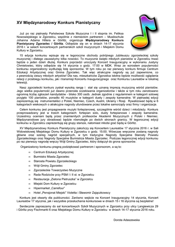 XV Międzynarodowy Konkurs Pianistyczny Już po raz piętnasty Państwowa Szkoła Muzyczna I i II stopnia im. Feliksa Nowowiejskiego w Zgorzelcu, wspólnie z niemieckim partnerem – Musikschule Johanna Adama Hillera w Görlitz, organizuje Międzynarodowy Konkurs Pianistyczny Zgorzelec / Görlitz. Odbędzie się on w dniach 14-17 stycznia 2016 r. w salach koncertowych partnerskich szkół muzycznych i Miejskim Domu Kultury w Zgorzelcu. 15 edycja konkursu wpisuje się w tegoroczne obchody potrójnego Jubileuszu zgorzeleckiej szkoły muzycznej i dlatego zauważymy kilka nowości. To muzyczne święto młodych pianistów w Zgorzelcu trwać będzie o jeden dzień dłużej. Konkurs poprzedzi uroczysty Koncert Inauguracyjny w wykonaniu Justyny Chmielowiec, który odbędzie się 14 stycznia o godz. 17:00 w MDK. Wraz ze wzrostem popularności konkursu organizatorzy wydłużają listę sponsorów. W tym roku po raz pierwszy konkurs firmuje Centrum Edukacji Artystycznej oraz Gmina Zgorzelec. Tak więc atrakcyjne nagrody są już zapewnione, co z pewnością cieszy młodych artystów! Dla nas, mieszkańców Zgorzelca istotna będzie możliwość oglądania relacji z przebiegu konkursu, jak i transmisji Koncertu Inauguracyjnego oraz Konkursu Laureatów w lokalnej telewizji. Nasz zgorzelecki konkurs zyskał wysoką rangę i stał się uznaną imprezą muzyczną wśród pianistów. Jego wielka popularność już dawno przerosła oczekiwania organizatorów i także w tym roku zanotowano ogromną liczbę zgłoszeń kandydatów - blisko 300 osób. Jednak zgodnie z regulaminem w kategorii solowej przyjęto 100 pianistów, ponadto 40 muzyków w kategorii duety i zespoły kameralne. W piętnastej edycji zaprezentują się instrumentaliści z Polski, Niemiec, Czech, Austrii, Ukrainy i Rosji. Rywalizować będą w 6 kategoriach wiekowych o atrakcyjne nagrody ufundowane przez lokalne samorządy oraz firmy i organizacje. Celem konkursu jest propagowanie muzyki fortepianowej, szczególnie wśród dzieci i młodzieży. Konkurs przeprowadzany jest w trzech kategoriach: fortepian solo, duety fortepianowe i zespoły kameralne. Uczestnicy oceniani będą przez znamienitych profesorów Akademii Muzycznych z Polski i Niemiec. Międzynarodowe jury obradować będzie równolegle po dwóch stronach granicy. W tegorocznej edycji konkursu w Zgorzelcu zaprezentują się grupy starsze, natomiast młodsi grać będą w Görlitz. XV Międzynarodowy Konkurs Pianistyczny zakończy się Koncertem Laureatów 17 stycznia 2016 r. w Sali Widowiskowej Miejskiego Domu Kultury w Zgorzelcu o godz. 15:00. Wówczas wręczone zostaną nagrody główne oraz szereg nagród specjalnych, w tym tradycyjne Nagrody Specjalne Starosty Powiatu Zgorzeleckiego oraz Nagrody Specjalne Burmistrza Miasta Zgorzelec. Podczas tegorocznej edycji konkursu po raz pierwszy nagrodę wręczy Wójt Gminy Zgorzelec, który dołączył do grona sponsorów. Organizatorzy konkursu pragną podziękować partnerom i sponsorom, a są to: • Centrum Edukacji Artystycznej • Burmistrz Miasta Zgorzelec • Starosta Powiatu Zgorzeleckiego • Wójt Gminy Zgorzelec • Zgorzeleckie Towarzystwo Muzyczne • Rada Rodziców przy PSM I i II st. w Zgorzelcu • Restauracja „Zielona Pietruszka” w Zgorzelcu • Miejski Dom Kultury w Zgorzelcu • Hipermarket „Carrefour” • Hotel „Pensjonat Miejski” Violetta i Sławomir Zajączkowscy Konkurs jest otwarty dla publiczności. Zarówno wejście na Koncert Inauguracyjny 14 stycznia, Koncert Laureatów 17 stycznia, jak i wszystkie przesłuchania konkursowe w dniach 15 i 16 stycznia są bezpłatne! Serdecznie zapraszamy do sal koncertowych Szkół Muzycznych w Zgorzelcu przy ulicy Langiewicza 29 i Görlitz przy Fischmarkt 6 oraz Miejskiego Domu Kultury w Zgorzelcu w dniach 14-17 stycznia 2016 roku. Dorota Adaszewska
