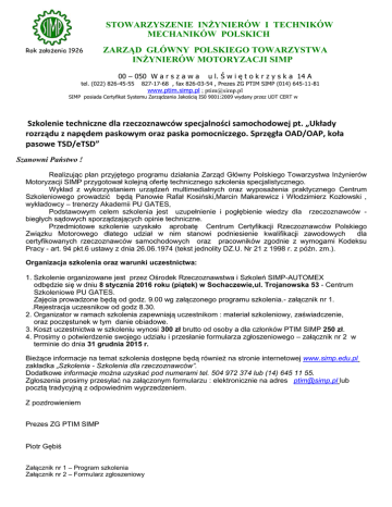 STOWARZYSZENIE INŻYNIERÓW I TECHNIKÓW MECHANIKÓW POLSKICH Rok założenia 1926 ZARZĄD GŁÓWNY POLSKIEGO TOWARZYSTWA INŻYNIERÓW MOTORYZACJI SIMP 00 – 050 W a r s z a w a tel. (022) 826-45-55 u l. Ś w i ę t o k r z y s k a 14 A 827-17-68 , fax 826-03-54 , Prezes ZG PTIM SIMP (014) 645-11-81 www.ptim.simp.pl ; [email protected] SIMP posiada Certyfikat Systemu Zarządzania Jakością IS0 9001:2009 wydany przez UDT CERT w Szkolenie techniczne dla rzeczoznawców specjalności samochodowej pt. „Układy rozrządu z napędem paskowym oraz paska pomocniczego. Sprzęgła OAD/OAP, koła pasowe TSD/eTSD” Szanowni Państwo ! Realizując plan przyjętego programu działania Zarząd Główny Polskiego Towarzystwa Inżynierów Motoryzacji SIMP przygotował kolejną ofertę technicznego szkolenia specjalistycznego. Wykład z wykorzystaniem urządzeń multimedialnych oraz wyposażenia praktycznego Centrum Szkoleniowego prowadzić będą Panowie Rafał Kosiński,Marcin Makarewicz i Włodzimierz Kozłowski , wykładowcy – trenerzy Akademii PU GATES, Podstawowym celem szkolenia jest uzupełnienie i pogłębienie wiedzy dla rzeczoznawców biegłych sądowych sporządzających opinie techniczne. Przedmiotowe szkolenie uzyskało aprobatę Centrum Certyfikacji Rzeczoznawców Polskiego Związku Motorowego dlatego udział w nim stanowi podniesienie kwalifikacji zawodowych dla certyfikowanych rzeczoznawców samochodowych oraz pracowników zgodnie z wymogami Kodeksu Pracy - art. 94 pkt.6 ustawy z dnia 26.06.1974 (tekst jednolity DZ.U. Nr 21 z 1998 r. z późn. zm.). Organizacja szkolenia oraz warunki uczestnictwa: 1. Szkolenie organizowane jest przez Ośrodek Rzeczoznawstwa i Szkoleń SIMP-AUTOMEX odbędzie się w dniu 8 stycznia 2016 roku (piątek) w Sochaczewie,ul. Trojanowska 53 - Centrum Szkoleniowe PU GATES. Zajęcia prowadzone będą od godz. 9.00 wg załączonego programu szkolenia.- załącznik nr 1. .Rejestracja uczesnikow od godz 8.30. 2. Organizator w ramach szkolenia zapewniają uczestnikom : materiał szkoleniowy, zaświadczenie, oraz poczęstunek w tym danie obiadowe. 3. Koszt uczestnictwa w szkoleniu wynosi 300 zł brutto od osoby a dla członków PTIM SIMP 250 zł. 4. Prosimy o potwierdzenie swojego udziału i przesłanie formularza zgłoszeniowego – załącznik nr 2 w terminie do dnia 31 grudnia 2015 r. Bieżące informacje na temat szkolenia dostępne będą również na stronie internetowej www.simp.edu.pl zakładka „Szkolenia - Szkolenia dla rzeczoznawców”. Dodatkowe informacje można uzyskać pod numerami tel. 504 972 374 lub (14) 645 11 55. Zgłoszenia prosimy przesyłać na załączonym formularzu : elektronicznie na adres [email protected] lub pocztą tradycyjną z odpowiednim wyprzedzeniem. Z pozdrowieniem Prezes ZG PTIM SIMP Piotr Gębiś Załącznik nr 1 – Program szkolenia Załącznik nr 2 – Formularz zgłoszeniowy Załącznik nr 1 PROGRAM SZKOLENIA Szkolenie techniczne dla rzeczoznawców specjalności samochodowej pt. „Układy rozrządu z napędem paskowym oraz paska pomocniczego. Sprzęgła OAD/OAP, koła pasowe TSD/eTSD” Teoria: - podstawowe cele stawiane układom rozrządu i paska pomocniczego - budowa paska rozrządu i paska wieloklinowego - sprzęgła OAD/OAP - napinacze, rolki, sprzęgiełka alternatora w napędzie paska wielorowkowego - typy i rodzaje napinaczy - pompy wody - koła pasowe TSD/eTSD - ogóle zalecenia montażowe wynikające z prawidłowości doboru i montażu paska do silnika - pojęcie i pomiar współosiowości elementów składowych układów paskowych - narzędzia serwisowe ( blokady…) Praktyka: - prawidłowy montaż pasków w silnikach z układem PD oraz CR (zalecenia montażowe, blokady, regulacja) grupy VW – praca na modelu - prawidłowy montaż pasków w silnikach koncernu FIAT- praca na modelu - silniki HDI oraz DCI, montaż i zalecenia serwisowe, blokady - samochody koreańskie, KIA, Hyundai. Zalecenia serwisowe oraz narzędzia potrzebne do prawidłowej wymiany paska,pasków. Praca na modelu - paskowe układy napędowe w silnikach wielocylindrowych w układzie V. Praca na modelu Umiejętności: - jak ocenić stopień zużycia paska wieloklinowego - jak ocenić przyczyny uszkodzeń pasków rozrządu i wielorowkowych - jak unikać często powtarzanych błędów montażowych - ocena przyczyny uszkodzenia, zerwania paska z winy ,,właściciela” samochodu – koncern Fiat - pojęcie ,,synchronizacji rozrządu” w pracy układu rozrządu w oparciu o wykorzystanie testera diagnostycznego Opracował : Rafał Kosiński Centrum Akademii PU GATES Załącznik nr 2 ... .…...................dnia.............................. Ośrodek Rzeczoznawstwa i Szkoleń SIMP SIMP-AUTOMEX 33-131 Tarnów – Łęg Tarnowski ul. Tarnowska 167 [email protected] fax : 014 645-00-42 tel/fax 014 645-11-55, tel kom 0504 972 374 FORMULARZ ZGŁOSZENIOWY na szkolenie pt. Szkolenie techniczne dla rzeczoznawców specjalności samochodowej pt. „Układy rozrządu z napędem paskowym oraz paska pomocniczego. Sprzęgła OAD/OAP, koła pasowe TSD/eTSD” Sochaczew, dnia 8 stycznia 2016 rok Prosimy o wypełnienie pismem drukowanym Imię i nazwisko:* Pesel: Adres zamieszkania : Nazwa firmy :** NIP :** Dokładny adres firmy :** nr telefonu kontaktowego: Adres e-mail: Forma zapłaty: gotówka / przelew – przedpłata *** Należność za szkolenie zobowiązuję się wpłacić przed rozpoczęciem szkolenia gotówką. lub dokonać przedpłaty na konto bankowe: SIMP- AUTOMEX , nr konta 85 1050 1562 1000 0092 1011 7884 Oświadczam, że jestem / nie jestem *** członkiem PTIM SIMP Oddział w …....................................... . .................................................................. / podpis i pieczęć osoby upoważnionej/ * W zgłoszeniu kilku osób z jednej firmy prosimy powielić w/w formularz ** Wypełniają tylko osoby zainteresowane otrzymaniem faktury VAT dla firmy *** Właściwe zaznaczyć