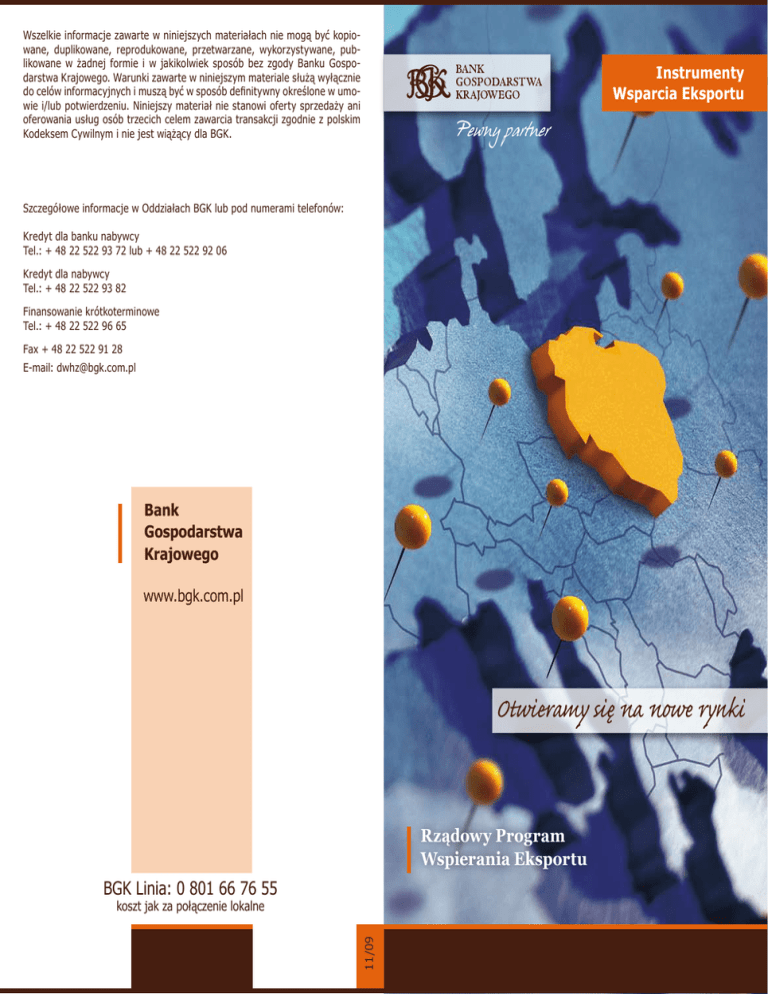 Wszelkie informacje zawarte w niniejszych materiałach nie mogą być kopiowane, duplikowane, reprodukowane, przetwarzane, wykorzystywane, publikowane w żadnej formie i w jakikolwiek sposób bez zgody Banku Gospodarstwa Krajowego. Warunki zawarte w niniejszym materiale służą wyłącznie do celów informacyjnych i muszą być w sposób definitywny określone w umowie i/lub potwierdzeniu. Niniejszy materiał nie stanowi oferty sprzedaży ani oferowania usług osób trzecich celem zawarcia transakcji zgodnie z polskim Kodeksem Cywilnym i nie jest wiążący dla BGK. Instrumenty Wsparcia Eksportu Pewny partner Szczegółowe informacje w Oddziałach BGK lub pod numerami telefonów: Kredyt dla banku nabywcy Tel.: + 48 22 522 93 72 lub + 48 22 522 92 06 Kredyt dla nabywcy Tel.: + 48 22 522 93 82 Finansowanie krótkoterminowe Tel.: + 48 22 522 96 65 Fax + 48 22 522 91 28 E-mail: [email protected] Bank Gospodarstwa Krajowego www.bgk.com.pl Otwieramy się na nowe rynki Rządowy Program Wspierania Eksportu BGK Linia: 0 801 66 76 55 11/09 koszt jak za połączenie lokalne Instrumenty wsparcia eksportu Rządowy Program Wspierania Eksportu Bank Gospodarstwa Krajowego jest jedynym w Polsce bankiem państwowym. Realizuje rządowe programy społeczno-gospodarcze, wspiera handel zagraniczny oraz konkurencyjność polskich przedsiębiorstw. W ramach swoich zadań BGK zajmuje się realizacją Rządowego Programu Wspierania Eksportu, poprzez udzielanie kredytów dla nabywców polskich towarów i usług lub ich banków z zapewnieniem ochrony ubezpieczeniowej Korporacji Ubezpieczeń Kredytów Eksportowych S.A. (KUKE S.A.). Cele Programu poprawa pozycji konkurencyjnej polskich eksporterów, zwiększenie wielkości polskiego eksportu poprzez ułatwienie importerom dostępu do finansowania zakupu polskich dóbr i usług inwestycyjnych. Produkty oferowane w ramach Programu przez BGK Finansowanie długoterminowe W ramach finansowania długoterminowego oferujemy: kredyt dla nabywcy lub banku nabywcy – finansowanie nabywców polskich towarów i usług lub ich banków. Okres spłaty Co najmniej 2 lata. Korzyści: możliwość realizacji kontraktów na rynkach o podwyższonym ryzyku, Warunki kredytu: udział kredytu BGK w finansowaniu kontraktu handlowego: do 85% jego wartości, wypłaty z kredytu realizowane bezpośrednio na rzecz eksportera, o kres spłaty: od 2 do nawet 12 lat (w zależności od kraju importera i sektora), o procentowanie: stałe – według stopy CIRR lub zmienne, oparte na stawkach EURIBOR / LIBOR (powiększonych o marżę na pokrycie ryzyka płynności BGK), j ednolita prowizja administracyjna (obecnie 0,5% p.a.). Warunki uzyskania kredytu: pozytywna ocena zdolności kredytowej kredytobiorcy, u zyskanie przez BGK polisy KUKE S.A. ubezpieczającej należności z kredytu. Finansowanie krótkoterminowe W ramach finansowania krótkoterminowego oferujemy: d yskonto należności z akredytywy eksportowej – wypłata eksporterowi przyszłego wpływu z akredytywy, pomniejszonego o wartość dyskonta, p ostfinansowanie akredytywy eksportowej – udzielenie kredytu bankowi zagranicznemu otwierającemu akredytywę na rzecz polskiego eksportera. Środki z kredytu zostają przekazane eksporterowi, a koszt kredytu ponosi importer. Korzyści: możliwość realizacji transakcji na rynkach o podwyższonym ryzyku, możliwość potwierdzenia akredytywy z krajów ryzyka nierynkowego, możliwość zaoferowania odroczonego terminu płatności, możliwość zdobywania nowych rynków zbytu, d ostęp do środków przed określonym w akredytywie terminem płatności – poprawa płynności firmy, możliwość zawierania kontraktów o wyższej wartości, u niezależnienie eksportera od ryzyka kontrahentów. przeniesienie ryzyka zapłaty za towar na BGK i KUKE S.A., m ożliwość zaoferowania swoim odbiorcom zapłaty z odroczoną płatnością, o trzymanie płatności za towar lub usługę tuż po dostawie (wykonaniu), p oprawa płynności firmy, długi termin spłaty kredytu, o bciążenie kosztami kredytu importera. Warunki kredytu: m ożliwość sfinansowania przez BGK do 100% wartości należności, o kres spłaty do 2 lat, oprocentowanie: oparte na stawkach EURIBOR / LIBOR, p rowizja 0,2 % wartości z akredytywy. Warunki uzyskania kredytu: pozytywna ocena zdolności kredytowej kredytobiorcy. INSTRUMENTY WsparciA eksportu