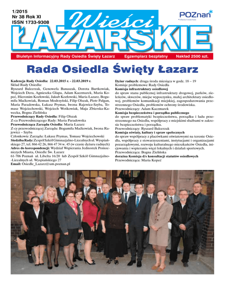 1/2015 Nr 38 Rok XI ISSN 1733-9308 Biuletyn Informacyjny Rady Osiedla Święty Łazarz Egzemplarz bezpłatny Nakład 2500 szt. Rada Osiedla Święty Łazarz Kadencja Rady Osiedla: 22.03.2015 r. - 22.03.2019 r. Skład Rady Osiedla: Ryszard Balcerzak, Genowefa Banaszak, Dorota Bartkowiak, Wojciech Dera, Agnieszka Glapa, Adam Kaczmarek, Maria Kopeć, Hieronim Kozłowski, Jakub Kozłowski, Maria Łazarz, Bogumiła Maćkowiak, Roman Modrzyński, Filip Olszak, Piotr Pałgan, Maria Paradowska, Łukasz Prymas, Iwona Rajewicz-Szyba, Tomasz Wojciechowski, Wojciech Wośkowiak, Maja Zbierska-Kawecka, Bogna Zielińska Przewodniczący Rady Osiedla: Filip Olszak Z-ca Przewodniczącego Rady: Maria Paradowska Przewodnicząca Zarządu Osiedla: Maria Łazarz Z-cy przewodniczącej Zarządu: Bogumiła Maćkowiak, Iwona Rajewicz – Szyba Członkowie Zarządu: Łukasz Prymas, Tomasz Wojciechowski Siedziba Rady: Zespół Szkół Gimnazjalno-Licealnych ul. Wyspiańskiego 27, tel. 866 42 26, 866 47 34 w. 45 (w czasie dyżuru radnych) Adres do korespondencji: Wydział Wspierania Jednostek Pomocniczych Miasta, Osiedle Św. Łazarz 61-706 Poznań ul. Libelta 16/20 lub Zespół Szkół Gimnazjalno-Licealnych ul. Wyspiańskiego 27 Email: [email protected] Dyżur radnych: druga środa miesiąca w godz. 18 – 19 Komisje problemowe Rady Osiedla Komisja infrastruktury osiedlowej do spraw stanu publicznej infrastruktury drogowej, parków, zieleńców, skwerów, miejsc wypoczynku, małej architektury osiedlowej, problemów komunikacji miejskiej, zagospodarowania przestrzennego Osiedla, problemów ochrony środowiska. Przewodniczący: Adam Kaczmarek Komisja bezpieczeństwa i porządku publicznego do spraw problematyki bezpieczeństwa, porządku i ładu przestrzennego na Osiedlu, współpracy z miejskimi służbami w zakresie bezpieczeństwa i porządku. Przewodniczący: Ryszard Balcerzak Komisja oświaty, kultury i spraw społecznych do spraw współpracy z placówkami oświatowymi na terenie Osiedla, współpracy z stowarzyszeniami, instytucjami i organizacjami pozarządowymi, rozwoju kulturalnego mieszkańców Osiedla, inicjowania i wspierania więzi lokalnych i działań sportowych. Przewodnicząca: Bogna Zielińska doraźna Komisja d/s konsultacji statutów osiedlowych Przewodnicząca: Maria Kopeć Centrum Warte Poznania na Łazarzu Idea rewitalizacji centrum miasta poprzez atrakcyjne i dostępne dla mieszkańców działania kulturalne, edukacyjne i społeczne, została zapoczątkowana w 2012 roku przez Komisję Rewitalizacji Rady Miasta. Jej celem jest wykorzystanie potencjału historycznych dzielnic Poznania: osiedla Stare Miasto, Ostrowa Tumskiego, Śródki, Jeżyc, Wildy i Św. Łazarza. Liczy się atrakcyjność pomysłu na wydarzenia kulturalne, artystyczne, edukacyjne i społeczne, kształtujące tożsamość kulturalną centrum miasta i zachęcające do aktywnego w nim udziału mieszkańców oraz turystów. Do tegorocznej edycji konkursu zgłoszono 91 koncepcji, z których dofinansowanych zostanie 19. Wyboru projektów dokonała komisja, którą stworzyli radni miejscy i osiedlowi oraz eksperci łączący wiedzę o rewitalizacji, edukacji i działaniach artystycznych. Osiedle Święty Łazarz można uznać za największego zwycięzcę tegorocznej edycji konkursu. Będzie ono głównym obszarem realizacji pomysłów : • Zumba w Parku Kasprowicza - zorganizowanie latem w każdą niedzielę zajęć zumby Zenon Kubiak: 1 420 zł • Tak dla fotografii w Poznaniu Andrzej Dobosz, Mariusz Forecki, Adrian Wykrota: 40 000 zł • Wirtualny Łazarz - ludzie, miasto, tradycja zatrzymane w fotografii - wystawa archiwalnych fotografii, cykl spotkań poświęconych łazarskim kulinariom Roman Modrzyński: 8 250 zł • Kinoogród - kino plenerowe w Parku Kasprowicza - 9 projekcji filmów Kolektyw Kąpielisko: 20 000 zł • Poezja jest tym co rodzi się z życia - kontynuacja projektu murali z tekstami poetyckimi, dwa na Dolnym Łazarzu i dwa na Starym Mieście Tomasz Genow, Joanna Pańczak: 20 055 zł • Fundacja Cukier Puder ubarwiła podróże tramwajami (łazarska linia nr 8) cyklem performensów Fundacja Cukier Puder kwota : 6 000 zł • Tańczenie Warte Poznania - Międzynarodowe Warsztaty Tańca Współczesnego - bezpłatne bilety na warsztaty i spektakle. Ewa Wycichowska: 35 000 zł • Warsztaty rzeźby w drewnie - kontynuacja projektu Galeria Raczej: 13 130 zł Maria Łazarz „Wirtualny Łazarz - ludzie, miasto, tradycja zatrzymane w fotografii” Wszystko zaczęło się od umieszczenia zdjęcia jednego z elementów kamienicy przy ul. Niegolewskich na portalu społecznościowym. Zawiązała się grupa pasjonatów chcących pokazać dawny i dzisiejszy Łazarz. Utworzono specjalny fanpage Wirtualny Łazarz. Rozpoczęła się akcja zbierania starych zdjęć i dokumentów. Projekt Wirtualny Łazarz dzięki zgłoszeniu do konkursu Centrum warte Poznania stał się realny. Dzięki zaangażowaniu wielu osób, a szczególnie Akademii Umiejętności udało się zorganizować wystawę zdjęć, pokazy kulinarne a także występ kapeli podwórkowej, konkursy dla dzieci. Bardzo chcemy, aby projekt trwał nadal, dlatego zachęcamy do przeglądania szuflad i albumów, dzielenia się swoją historią. Powstał pomysł napisania książki z łazarskimi przepisami kulinarnymi. Chętnych do podzielenia się swoimi wspomnieniami prosimy o kontakt z Radą Osiedla. Roman Modrzyński 2 Łazarz - Otwarta Strefa Kultury Główną ideą inicjatywy jest utworzenie Otwartej Strefy Kultury na terenie poznańskiego Łazarza, która będzie skupiała galerie sztuki, pracownie, organizacje, artystów, rzemieślników oraz towarzyszące im lokalne przedsiębiorstwa. Komitywa przeprowadziła akcje i konsultacje społeczne odnoszące się między innymi do Skweru przy Małeckiego. Dzięki wspólnym działaniom z Otwartą Strefą Kultury, Radą Osiedla, a także mieszkańcami, Komisja Rewitalizacji postanowiła przekazać środki na rewitalizacj