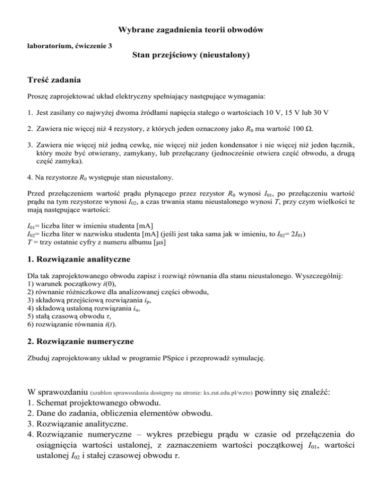 Wybrane zagadnienia teorii obwodów laboratorium, ćwiczenie 3 Stan przejściowy (nieustalony) Treść zadania Proszę zaprojektować układ elektryczny spełniający następujące wymagania: 1. Jest zasilany co najwyżej dwoma źródłami napięcia stałego o wartościach 10 V, 15 V lub 30 V 2. Zawiera nie więcej niż 4 rezystory, z których jeden oznaczony jako R0 ma wartość 100 Ω. 3. Zawiera nie więcej niż jedną cewkę, nie więcej niż jeden kondensator i nie więcej niż jeden łącznik, który może być otwierany, zamykany, lub przełączany (jednocześnie otwiera część obwodu, a drugą część zamyka). 4. Na rezystorze R0 występuje stan nieustalony. Przed przełączeniem wartość prądu płynącego przez rezystor R0 wynosi I01, po przełączeniu wartość prądu na tym rezystorze wynosi I02, a czas trwania stanu nieustalonego wynosi T, przy czym wielkości te mają następujące wartości: I01= liczba liter w imieniu studenta [mA] I02= liczba liter w nazwisku studenta [mA] (jeśli jest taka sama jak w imieniu, to I02= 2I01) T = trzy ostatnie cyfry z numeru albumu [µs] 1. Rozwiązanie analityczne Dla tak zaprojektowanego obwodu zapisz i rozwiąż równania dla stanu nieustalonego. Wyszczególnij: 1) warunek początkowy i(0), 2) równanie różniczkowe dla analizowanej części obwodu, 3) składową przejściową rozwiązania ip, 4) składową ustaloną rozwiązania iu, 5) stałą czasową obwodu τ, 6) rozwiązanie równania i(t). 2. Rozwiązanie numeryczne Zbuduj zaprojektowany układ w programie PSpice i przeprowadź symulację. W sprawozdaniu (szablon sprawozdania dostępny na stronie: ks.zut.edu.pl/wzto) powinny się znaleźć: 1. Schemat projektowanego obwodu. 2. Dane do zadania, obliczenia elementów obwodu. 3. Rozwiązanie analityczne. 4. Rozwiązanie numeryczne – wykres przebiegu prądu w czasie od przełączenia do osiągnięcia wartości ustalonej, z zaznaczeniem wartości początkowej I01, wartości ustalonej I02 i stałej czasowej obwodu τ.