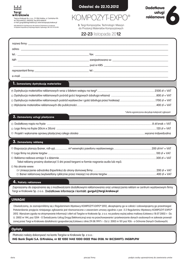 Odesłaç do 22.10.2012 Targi w Krakowie Sp. z o.o., 31-586 Kraków, ul. Centralna 41A tel. (012) 6441217, 6445932, fax (012) 6446141 e-mail: [email protected], www.kompozyty.krakow.pl KRS 0000192313 Sàd Rejonowy dla Krakowa ÂródmieÊcia w Krakowie XI Wydzia∏ Gospodarczy Krajowego Rejestru Sàdowego, NIP 676-10-50-090 KOMPOZYT-EXPO® 3. Targi Kompozytów, Technologii i Maszyn do Produkcji Materiałów Kompozytowych Dodatkowe usługi reklamowe 6 22-23 listopada 2012 nazwa firmy: __________________________________________________________________________________________________ adres: _______________________________________________________________________________________________________ tel.: __________________________________________________ fax: ___________________________________________________ NIP: __________________________________________________ zarejestrowano w: _______________________________________ _____________________________________________________ pod nr KRS _____________________________________________ reprezentant firmy: ______________________________________ tel.:____________________________________________________ e-mail: _______________________________________________________________________________________________________ 1. Zamawiamy dystrybucj´ materia∏ów Dystrybucja materiałów reklamowych wraz z biletem wstępu na targi*....................................................................................2500 z∏ + VAT Dystrybucja materiałów reklamowych pośród gości targowych (obsługa własna) ..................................................................800 z∏ + VAT Dystrybucja materia∏ów reklamowych poÊród wystawców i goÊci (obsługa przez hostessę) ....................................................1700 z∏ + VAT Wy∏o˝enie materia∏ów reklamowych dla publicznoÊci....................................................................................................................400 z∏ + VAT *oferta ograniczona-decyduje kolejnoúç zg≥oszeƒ 2. Zamawiamy us∏ugi plastyczne Dodatkowy napis na fryzie ..........................................................................................................................................................8 z∏/znak + VAT Logo firmy na fryzie (30cm x 30cm) ..................................................................................................................................................120 z∏ + VAT Projekt i wykonanie oprawy plastycznej ca∏ego stoiska ................................................................................................wycena indywidualna 3. Zamawiamy reklam´ Ekspozycja planszy (baner, roll-up)................... m2 wewnàtrz pawilonu wystawowego........................................................200 z∏/m2 + VAT Logo firmy na planie targów ..............................................................................................................................................................100 z∏ + VAT Reklama radiowa emisja 5 x dziennie..............................................................................................................................................300 z∏ + VAT Tekst reklamy prosimy dostarczyç 5 dni przed targami w formie nagrania audio lub mp3. Na stronie www: Umieszczenie odnoÊnika (hiperlinku) do strony domowej firmy .............................................................................................200 z∏ + VAT Baner reklamowy (wyÊwietlany cyklicznie przez miesiàc) na stronie targów ........................................................................400 z∏ + VAT 4. Pakiety reklamowe Zapraszamy do zapoznania si´ z mo˝liwoÊciami dodatkowymi reklamowania oraz umieszczenia reklam w centrum wystawowym firmy Targi w Krakowie Sp. z o.o.. D od at k ow e in f o r ma cj e i ko nt akt : [email protected] UWAGA! OÊwiadczamy, ˝e zaznajomiliÊmy si´ z Regulaminem Wystawcy KOMPOZYT-EXPO® 2012, akceptujemy go w ca∏oÊci i zobowiπzujemy go przestrzegaç. Potwierdzenie przyjÍcia niniejszego zg≥oszenia jest równoznaczne z zawarciem umowy zgodnie z par. 2.2 Regulaminu Wystawcy KOMPOZYT-EXPO® 2012. Wyraam zgodę na otrzymywanie Informacji i ofert od Targów w Krakowie Sp. z o.o. na podany wyej adres mailowy (Ustawa z 18.07.2002 r - Dz. U. 2002 nr 144, poz 1204 - O Świadczeniu Usług Drogą Elektroniczną) oraz na przechowywanie i przetwarzanie danych osobowych w zakresie prowadzonej przez Targi w Krakowie działalności gospodarczej (Ustawa z dnia 29.08.1997 r - Dz.U. 2002 nr 101 poz 926 - o Ochronie Danych Osobowych). Op∏aty P∏atnoÊci nale˝y dokonywaç na konto Targów w Krakowie Sp. z o.o.: ING Bank Âlàski S.A. O/Kraków, nr 82 1050 1445 1000 0022 9166 0138. Nr BIC(SWIFT): INGBPLPW data piecz´ç firmy podpis osoby upowa˝nionej do zawierania umów