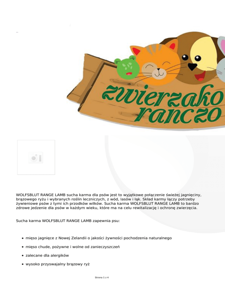 WOLFSBLUT RANGE LAMB sucha karma dla psów jest to wyjątkowe połączenie świeżej jagnięciny, brązowego ryżu i wybranych roślin leczniczych, z wód, lasów i łąk. Skład karmy łączy potrzeby żywieniowe psów z tymi ich przodków wilków. Sucha karma WOLFSBLUT RANGE LAMB to bardzo zdrowe jedzenie dla psów w każdym wieku, które ma na celu rewitalizację i ochronę zwierzęcia. Sucha karma WOLFSBLUT RANGE LAMB zapewnia psu: mięso jagnięce z Nowej Zelandii o jakości żywności pochodzenia naturalnego mięso chude, pożywne i wolne od zanieczyszczeń zalecane dla alergików wysoko przyswajalny brązowy ryż Strona 1 z 4 unikalna kombinacja ziół z wód, łąk i lasów wyśmienity smak lekkostrawne jedzenie nie zawiera zbóż nie zawiera oleju słonecznikowego i tapioki bez cukru, soi, wybielaczy, witaminy K3 bez dodatków wzmacniających kolor i smak bez sztucznych konserwantów Mięso jagnięce z Nowej Zelandii w jakości żywności pochodzenia naturalnego. Nasza jagnięcina pochodzi z Nowej Zelandii, gdzie niekończące się zielone pastwiska zapewniają doskonałe warunki do hodowli zwierząt. W Nowej Zelandii jagnięta swobodnie poruszają się po dużych pastwiskach i żywią głównie trawami i koniczyną białą z wysoką zawartością azotu, jest to jeden z sekretów sukcesu nowozelandzkich rolników. Mięso jest bardzo chude i pożywne i wolne od zanieczyszczeń. Nowa Zelandia wyznacza światowy standard dla bezpieczeństwa żywności. Całe mięso jest monitorowane zgodnie z surowymi zasadami higieny w Nowej Zelandii dla przetwórstwa mięsa i uznane międzynarodowe systemów kontroli. Mięso wysoce przyswajalne Sucha karma dla psów WOLFSBLUT RANGE LAMB jest produkowana ze specjalnej świeżej jagnięciny na podstawie jej składu hipoalergicznego jeszcze lepiej przyswajalne dla psów o bardzo poważnych reakcji alergicznych. Jagnięcina jest jednym z niewielu źródeł mięsa zwierząt, które są dobrze tolerowane przez większość psów alergików. Unikalne połączenie ziół z wód, łąk i lasów WOLFSBLUT RANGE LAMB to unikalny suchy pokarm. Receptura karmy WOLFSBLUT RANGE LAMB łączy potrzeby pokarmowe naszych psów z tymi ich przodków wilków. Menu przodków naszych psów składające się głównie z mięsa i ryb było uzupełniane owocami lasu i stepu. Karma WOLFSBLUT RANGE LAMB łączy w sobie wysoką zawartość mięsa z kombinacją ziół, z wód, łąk i lasów i innych składników prozdrowotnych. Tak więc, bardzo zdrowa, sucha karma WOLFSBLUT RANGE LAMB jednocześnie chroni i ożywia ciało i umysł zwierzęcia. Zawiera wszystkie niezbędne składniki odżywcze, witaminy i minerały. Oto wybrane składniki: Ryż- wzmacnia śledzionę, trzustkę i żołądek. Wspomaga oczyszczanie z toksyn i wzmacnia energię ciała. Nie uczula. Dzięki witaminom z grupy B wzmacnia układ nerwowy. leczy i koi jelita. Strona 2 z 4 Ryż kiełki - zawierają więcej witamin i składników mineralnych niż ziarna ryżu. Ich regularne spożywanie wzmacnia system odpornościowy. Yucca Schidigera (ekstrakt) „drzewo życia” to niezwykła roślina o właściwościach oczyszczających oraz wspomagających odporność. FOS (fruktooligosacharydy ) - stymulujące prawidłową pracę jelit i tworzenie zdrowej flory jelitowej. Wspomagają zmniejszanie liczby patogennych bakterii. MOS (mannooligosacharydy), wiążą bakterie chorobotwórcze w celu bezpiecznego wydalania z kałem i tym samym zapobiegają przywieraniu ich do ściany jelita. Olej z łososia zawiera substancje stosowane zapobiegawczo przeciwko świądowi, zapobiega pęknięciom na łapach, łupieżowi; wpływa na lśnienie sierści Majeranek efekty lecznicze między innymi przewodu pokarmowego, działanie rozkurczowe, właściwości antybakteryjne i przeciwzapalne. Jagody czarnego bzu wzmacniają układ odpornościowy. Jagody aronii są bogate w flawonoidy, witaminy i minerały, takie jak żelazo i kwas foliowy. Mech irlandzki zawiera wiele składników mineralnych, takich jak jod, cynk, beta-karoten, wapń, żelazo, magnez, mangan, fosfor, selen, pektyna itp. Pokrzywa wzmacnia układ immunologiczny. Żurawina zawiera wiele witamin, ma działanie antybakteryjne i chroni przed infekcjami pęcherza. Mniszek lekarski, bogaty w substancje gorzkie, witaminy i minerały. Ma stymulujący wpływ na cały metabolizm komórek. Stymuluje pracę wątroby, pobudza produkcję hormonów i jest zalecany dla wspomagania wątroby i pęcherzyka żółciowego. Uwaga: Ilości stosowanych w suchej karmie WOLFSBLUT RANGE LAMB jagód, rośliny leczniczych z wód, łąk i lasów są optymalnie zbilansowane. Często ich zawartość liczona jest jedynie w miligramach zgodnie z zasadą: CZASAMI MNIEJ ZNACZY WIĘCEJ ! Proces starzenia WOLFSBLUT RANGE LAMB zawiera niezbędne witaminy i minerały spowalniające proces starzenia się w ilościach znacznie przekraczających przeciętną. Lśniąca sierść Ze względu na zrównoważonych i wysoki poziom kwasów tłuszczowych Omega 3 i Omega-6 po krótkim czasie można zobaczyć wartość wyściółki skóry i zdrowej, lśniącej sierści swojego psa. Lekkostrawna Strona 3 z 4 Sucha karma dla psa WOLFSBLUT RANGE LAMB jest niezwykle lekkostrawna. Poprawia krążenie krwi. Sprawia to unikalna kombinacja mięsa jagnięcego, roślin leczniczych z lasów, łąk i jezior. Nie zawiera zbóż Psy są mięsożerne dlatego karmy WOLFSBLUT są wolne od ziaren zbóż. Karmy WOLFSBLUT nie zawierają Sucha karma dla psa WOLFSBLUT RANGE LAMB jest wolna od ziaren zbóż lecz także od cukru, soi, pszenicy, witaminy K 3, polepszaczy zapachu, koloru i smaku oraz sztucznych konserwantów. Zalecana dla alergików Sucha karma dla psa WOLFSBLUT RANGE LAMB jest odpowiednia dla psów wrażliwych i podatnych na alergie. Właściwości składników karm WOLFSBLUT RANGE LAMB mogą przeciwdziałać nietolerancjom pokarmowym. Strona 4 z 4