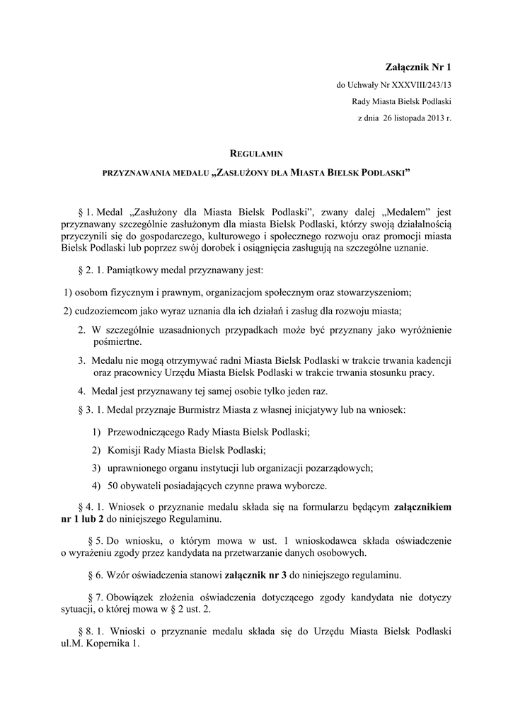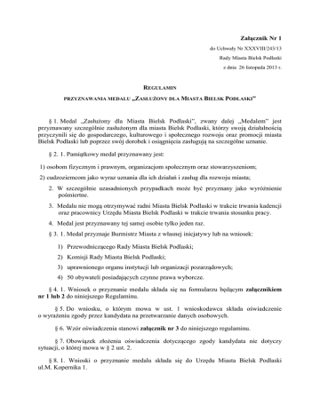 Załącznik Nr 1 do Uchwały Nr XXXVIII/243/13 Rady Miasta Bielsk Podlaski z dnia 26 listopada 2013 r. REGULAMIN PRZYZNAWANIA MEDALU „ZASŁUŻONY DLA MIASTA BIELSK PODLASKI” § 1. Medal „Zasłużony dla Miasta Bielsk Podlaski”, zwany dalej „Medalem” jest przyznawany szczególnie zasłużonym dla miasta Bielsk Podlaski, którzy swoją działalnością przyczynili się do gospodarczego, kulturowego i społecznego rozwoju oraz promocji miasta Bielsk Podlaski lub poprzez swój dorobek i osiągnięcia zasługują na szczególne uznanie. § 2. 1. Pamiątkowy medal przyznawany jest: 1) osobom fizycznym i prawnym, organizacjom społecznym oraz stowarzyszeniom; 2) cudzoziemcom jako wyraz uznania dla ich działań i zasług dla rozwoju miasta; 2. W szczególnie uzasadnionych przypadkach może być przyznany jako wyróżnienie pośmiertne. 3. Medalu nie mogą otrzymywać radni Miasta Bielsk Podlaski w trakcie trwania kadencji oraz pracownicy Urzędu Miasta Bielsk Podlaski w trakcie trwania stosunku pracy. 4. Medal jest przyznawany tej samej osobie tylko jeden raz. § 3. 1. Medal przyznaje Burmistrz Miasta z własnej inicjatywy lub na wniosek: 1) Przewodniczącego Rady Miasta Bielsk Podlaski; 2) Komisji Rady Miasta Bielsk Podlaski; 3) uprawnionego organu instytucji lub organizacji pozarządowych; 4) 50 obywateli posiadających czynne prawa wyborcze. § 4. 1. Wniosek o przyznanie medalu składa się na formularzu będącym załącznikiem nr 1 lub 2 do niniejszego Regulaminu. § 5. Do wniosku, o którym mowa w ust. 1 wnioskodawca składa oświadczenie o wyrażeniu zgody przez kandydata na przetwarzanie danych osobowych. § 6. Wzór oświadczenia stanowi załącznik nr 3 do niniejszego regulaminu. § 7. Obowiązek złożenia oświadczenia dotyczącego zgody kandydata nie dotyczy sytuacji, o której mowa w § 2 ust. 2. § 8. 1. Wnioski o przyznanie medalu składa się do Urzędu Miasta Bielsk Podlaski ul.M. Kopernika 1. § 9. Formularz zgłoszeniowy jest udostępniany na stronie internetowej Urzędu Miasta Bielsk Podlaski. § 10. Prowadzeniem spraw związanych z nadaniem medalu zajmuje się Referat Obsługi Burmistrza i Rady Miasta. W referacie dokonywana jest weryfikacja pod względem formalnym i pod względem spełnienia warunków określonych w § 2 Regulaminu. § 11. Medal przyznaje Burmistrz Miasta Bielsk Podlaski po uzyskaniu opinii Kapituły Medalu Zasłużony dla Miasta Bielsk Podlaski, zwanej dalej „Kapitułą”. § 12. 1. Kapitułę i jej członków powołuje i odwołuje Burmistrz Miasta, który określa również skład Kapituły oraz czas jej trwania. § 13. W skład Kapituły wchodzą trzej radni Rady Miasta, których wybór następuje w formie uchwały Rady Miasta Bielsk Podlaski oraz przedstawiciele środowisk gospodarczych, kulturalnych, społecznych i innych. § 14. 1. Ceremonii wręczenia przyznanego medalu dokonuje Burmistrz Miasta Bielsk Podlaski podczas uroczystej sesji Rady Miasta, w czasie obchodów Dni Bielska Podlaskiego lub w innych okolicznościach uzasadniających jego wręczenie. § 15. Wraz z medalem wręcza się Akt Przyznania Medalu „Zasłużony dla Miasta Bielsk Podlaski”. § 16. Uhonorowana osoba dokonuje wpisu w pamiątkowej księdze – „Zasłużony dla Miasta Bielsk Podlaski”. § 17. 1.Ewidencję wniosków i przyznanych medali prowadzi Referat Obsługi i Burmistrza Miasta. § 18. Wykaz osób wyróżnionych medalem wraz z przedstawieniem sylwetki umieszcza się na stronie internetowej Urzędu Miasta Bielsk Podlaski.