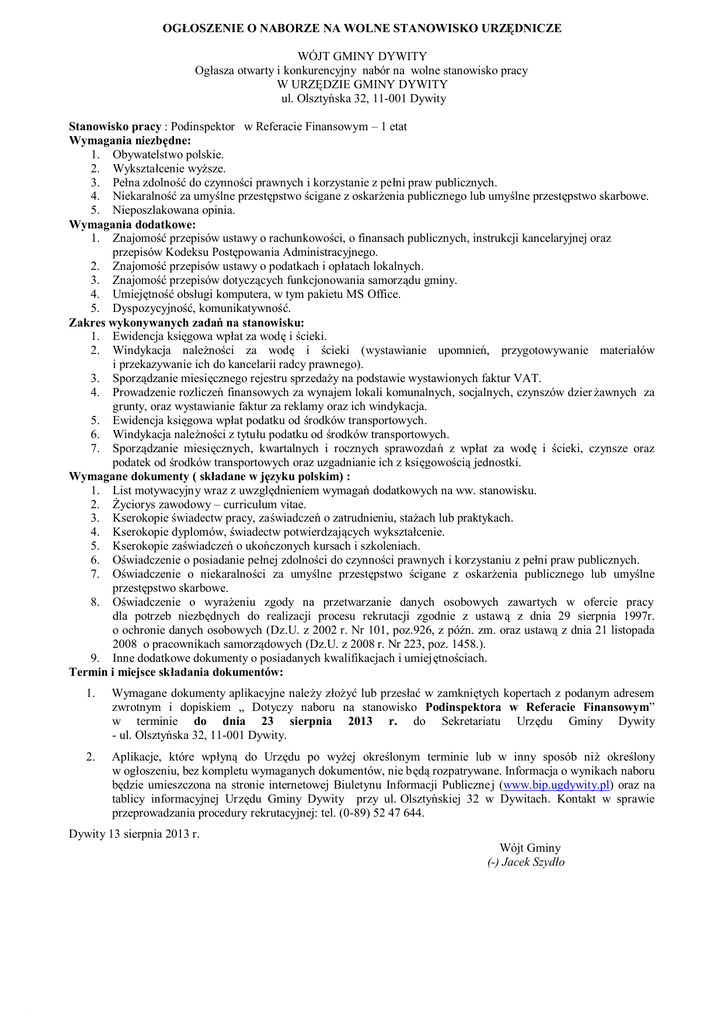 OGŁOSZENIE O NABORZE NA WOLNE STANOWISKO URZĘDNICZE WÓJT GMINY DYWITY Ogłasza otwarty i konkurencyjny nabór na wolne stanowisko pracy W URZĘDZIE GMINY DYWITY ul. Olsztyńska 32, 11-001 Dywity Stanowisko pracy : Podinspektor w Referacie Finansowym – 1 etat Wymagania niezbędne: 1. Obywatelstwo polskie. 2. Wykształcenie wyższe. 3. Pełna zdolność do czynności prawnych i korzystanie z pełni praw publicznych. 4. Niekaralność za umyślne przestępstwo ścigane z oskarżenia publicznego lub umyślne przestępstwo skarbowe. 5. Nieposzlakowana opinia. Wymagania dodatkowe: 1. Znajomość przepisów ustawy o rachunkowości, o finansach publicznych, instrukcji kancelaryjnej oraz przepisów Kodeksu Postępowania Administracyjnego. 2. Znajomość przepisów ustawy o podatkach i opłatach lokalnych. 3. Znajomość przepisów dotyczących funkcjonowania samorządu gminy. 4. Umiejętność obsługi komputera, w tym pakietu MS Office. 5. Dyspozycyjność, komunikatywność. Zakres wykonywanych zadań na stanowisku: 1. Ewidencja księgowa wpłat za wodę i ścieki. 2. Windykacja należności za wodę i ścieki (wystawianie upomnień, przygotowywanie materiałów i przekazywanie ich do kancelarii radcy prawnego). 3. Sporządzanie miesięcznego rejestru sprzedaży na podstawie wystawionych faktur VAT. 4. Prowadzenie rozliczeń finansowych za wynajem lokali komunalnych, socjalnych, czynszów dzier żawnych za grunty, oraz wystawianie faktur za reklamy oraz ich windykacja. 5. Ewidencja księgowa wpłat podatku od środków transportowych. 6. Windykacja należności z tytułu podatku od środków transportowych. 7. Sporządzanie miesięcznych, kwartalnych i rocznych sprawozdań z wpłat za wodę i ścieki, czynsze oraz podatek od środków transportowych oraz uzgadnianie ich z księgowością jednostki. Wymagane dokumenty ( składane w języku polskim) : 1. List motywacyjny wraz z uwzględnieniem wymagań dodatkowych na ww. stanowisku. 2. Życiorys zawodowy – curriculum vitae. 3. Kserokopie świadectw pracy, zaświadczeń o zatrudnieniu, stażach lub praktykach. 4. Kserokopie dyplomów, świadectw potwierdzających wykształcenie. 5. Kserokopie zaświadczeń o ukończonych kursach i szkoleniach. 6. Oświadczenie o posiadanie pełnej zdolności do czynności prawnych i korzystaniu z pełni praw publicznych. 7. Oświadczenie o niekaralności za umyślne przestępstwo ścigane z oskarżenia publicznego lub umyślne przestępstwo skarbowe. 8. Oświadczenie o wyrażeniu zgody na przetwarzanie danych osobowych zawartych w ofercie pracy dla potrzeb niezbędnych do realizacji procesu rekrutacji zgodnie z ustawą z dnia 29 sierpnia 1997r. o ochronie danych osobowych (Dz.U. z 2002 r. Nr 101, poz.926, z późn. zm. oraz ustawą z dnia 21 listopada 2008 o pracownikach samorządowych (Dz.U. z 2008 r. Nr 223, poz. 1458.). 9. Inne dodatkowe dokumenty o posiadanych kwalifikacjach i umiejętnościach. Termin i miejsce składania dokumentów: 1. Wymagane dokumenty aplikacyjne należy złożyć lub przesłać w zamkniętych kopertach z podanym adresem zwrotnym i dopiskiem „ Dotyczy naboru na stanowisko Podinspektora w Referacie Finansowym” w terminie do dnia 23 sierpnia 2013 r. do Sekretariatu Urzędu Gminy Dywity - ul. Olsztyńska 32, 11-001 Dywity. 2. Aplikacje, które wpłyną do Urzędu po wyżej określonym terminie lub w inny sposób niż określony w ogłoszeniu, bez kompletu wymaganych dokumentów, nie będą rozpatrywane. Informacja o wynikach naboru będzie umieszczona na stronie internetowej Biuletynu Informacji Publiczne j (www.bip.ugdywity.pl) oraz na tablicy informacyjnej Urzędu Gminy Dywity przy ul. Olsztyńskiej 32 w Dywitach. Kontakt w sprawie przeprowadzania procedury rekrutacyjnej: tel. (0-89) 52 47 644. Dywity 13 sierpnia 2013 r. Wójt Gminy (-) Jacek Szydło