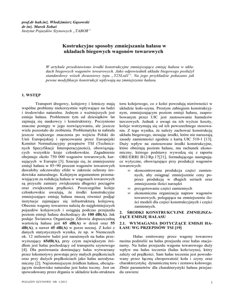 prof.dr hab.inż. Włodzimierz Gąsowski dr inż. Marek Sobaś Instytut Pojazdów Szynowych „TABOR” Kostrukcyjne sposoby zmniejszania hałasu w układach biegowych wagonów towarowych W artykule przedstawiono środki konstrukcyjne zmniejszające emisję hałasu w układach biegowych wagonów towarowych. Jako odpowiednik układu biegowego posłużył standardowy wózek dwuosiowy typu „Y25Lsd1”. Na jego przykładzie pokazano jak pewne modyfikacje konstrukcji wpływają na zmniejszenie hałasu. 1. WSTĘP Transport drogowy, kolejowy i lotniczy mają wspólne problemy niekorzystnie wpływające na ludzi i środowisko naturalne. Jednym z ważniejszych jest emisja hałasu. Problemem tym od dziesiątków lat zajmują się naukowcy i konstruktorzy. Poczyniono znaczne postępy w jego rozwiązywaniu, ale jeszcze wiele pozostało do zrobienia. Problematyka ta nabrała jeszcze większego znaczenia po wejściu Polski do Unii Europejskiej i opracowaniu przez Europejski Komitet Normalizacyjny przepisów TSI (Technicznych Specyfikacji Interoperacyjności), obowiązujących wszystkie kraje członkowskie. Zagadnienie obejmuje około 750 000 wagonów towarowych, kursujących w Europie [3]. Szacuje się, że zmniejszenie emisji hałasu w 85÷90 procent wagonów towarowych dawałoby odczuwalny efekt w zakresie ochrony środowiska naturalnego. Kolejnym argumentem przemawiającym za redukcją hałasu w wagonach towarowych są przyszłe zamiary zwiększenia długości pociągów oraz zwiększenia prędkości. Poszczególne koleje członkowskie uważają, że środki konstrukcyjne zmniejszające emisję hałasu muszą również podjąć instytucje zajmujące się infrastrukturą kolejową. Obecnie wagony towarowe należą do najgłośniejszych pojazdów kolejowych i osiągają podczas przejazdu poziom emisji hałasu dochodzący do 100 dB(A). Jak podaje Światowa Organizacja Zdrowia dopuszczalną wartością hałasu jest 65 dB(A) w dzień oraz 55 dB(A), a nawet 45 dB(A) w porze nocnej. Z kolei z danych statystycznych wynika, że np. w Niemczech ok. 12 milionów ludzi jest narażonych na hałas przewyższający 65dB(A), przy czym największym źródłem jest hałas pochodzący od transportu szynowego [4]. Dla porównania dominujący hałas wytwarzany przez lokomotywy powstaje przy małych prędkościach oraz przy dużych prędkościach jako hałas aerodynamiczny [2]. Najistotniejszym źródłem hałasu, obciążającym środowisko naturalne jest hałas toczny. Jest on spowodowany przez drgania w układzie koło-struktura POJAZDY SZYNOWE NR 1/2013 toru kolejowego, co z kolei powodują nierówności w układzie koło-szyna. Prostym zabiegiem konstrukcyjnym, zmniejszającym poziom emisji hałasu, zaaprobowanym przez UIC jest zastosowanie hamulców tarczowych. Jednak z uwagi na ich wyższe koszty, koleje wstrzymują się od ich powszechnego stosowania. Z tego wynika, że należy zachować konstrukcję układu biegowego, stosując środki, które nie naruszają zasady zamienności zgodnie z kartą UIC 510-1 [13]. Duży wpływ na zastosowane środki konstrukcyjne, które obniżają poziom hałasu, ma rachunek ekonomiczny, którego podstawy wywodzą się z raportu ORE/ERRI B12/Rp.17[21], formułującego następujące wytyczne, obowiązujące przy produkcji wagonów towarowych: • skoncentrowana produkcja części zamiennych, aby osiągnąć zmniejszenie ceny poprzez produkcję w długich seriach oraz zmniejszenie ilości narzędzi • przygotowanie części zamiennych • ekonomiczna organizacja napraw wagonów towarowych, polegająca na zmniejszeniu ilości modeli dla części konstrukcyjnych i części zamiennych. 2. ŚRODKI KONSTRUKCYJNE ZMNIEJSZAJĄCE EMISJĘ HAŁASU 2.1. WYMAGANIA DOTYCZĄCE EMISJI HAŁASU WG PRZEPISÓW TSI [19] Hałas emitowany przez wagony towarowe można podzielić na hałas przejazdu oraz hałas stacjonarny. Na hałas przejazdu wagonu towarowego duży wpływ ma hałas toczenia (hałas koło/szyna), który zależy od prędkości. Sam hałas toczenia jest powodowany przez łączną chropowatość koła i szyny oraz charakterystykę dynamiczną toru i zestawu kołowego. Zbiór parametrów dla charakterystyki hałasu przejazdu zawiera: 1 Wartości dopuszczalne Lp,Aeq,Tp dla hałasu przejazdu wagonów towarowych L.p. 1 2 3 4 5 6 Wagony Nowe wagony o średniej liczbie osi na jednostkę długości (o/d) do 0,15 m-1 przy prędkości 80 km/h Odnowione lub zmodernizowane wagony zgodnie z art.14 ust.3 dyrektywy 2001/16/WE o średniej liczbie osi na jednostkę długości (o/d) do 0,15 m-1przy prędkości 80 km/h Nowe wagony o średniej liczbie osi na jednostkę (o/d) od powyżej 0,15m-1 do 0,275 m-1 przy prędkości 80 km/h Odnowione lub zmodernizowane wagony zgodnie z art.14.ust.3 dyrektywy 2001/16/WE o średniej liczbie osi na jednostkę długości (o/d) od powyżej 0,15 m-1 do 0,275 m-1 przy prędkości 80 km/h Nowe wagony o średniej liczbie osi na jednostkę długości (o/d) powyżej 0,275 m-1 przy prędkości 80 km/h Odnowione lub zmodernizowane wagony zgodne z art.14 ust.3 dyrektywy 2001/16/WE o średniej liczbie osi na jednostkę długości (o/d) do powyżej 0,275 m-1 przy prędkości 80 km/h Tabela1 Lp,Aeq,Tp ≤82 dB (A) ≤84 dB (A) ≤83 dB(A) ≤85 dB(A) ≤85 dB (A) ≤87 dB (A) o-liczba osi [-] d-długość między zderzakami [m]. • poziom ciśnienia akustycznego, zgodnego z metodą pomiaru • położenie mikrofonu pomiarowego • prędkość wagonu • chropowatość szyny • dynamiczne zachowanie toru. Hałas stacjonarny wagonu towarowego jest istotny jedynie wówczas, jeżeli wagon towarowy jest wyposażony w urządzenia pomocnicze takie jak grzejniki, generatory, układy chłodzenia. Dotyczy to głównie wagonów-chłodni. Zbiór parametrów dla charakterystyki hałasu stacjonarnego wagonu towarowego zawiera: • poziom ciśnienia akustycznego, zgodnie z określoną metodą pomiaru oraz położenia mikrofonu • warunki eksploatacji. Wartości dopuszczalne hałasu przejazdu mi