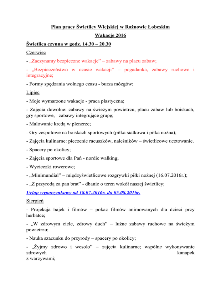 Plan pracy Świetlicy Wiejskiej w Rożnowie Łobeskim Wakacje 2016 Świetlica czynna w godz. 14.30 – 20.30 Czerwiec - „Zaczynamy bezpieczne wakacje” – zabawy na placu zabaw; - „Bezpieczeństwo w czasie wakacji” – pogadanka, zabawy ruchowe i integracyjne; - Formy spędzania wolnego czasu - burza mózgów; Lipiec - Moje wymarzone wakacje - praca plastyczna; - Zajęcia dowolne: zabawy na świeżym powietrzu, placu zabaw lub boiskach, gry sportowe, zabawy integrujące grupę; - Malowanie kredą w plenerze; - Gry zespołowe na boiskach sportowych (piłka siatkowa i piłka nożna); - Zajęcia kulinarne: pieczenie racuszków, naleśników – świetlicowe ucztowanie. - Spacery po okolicy; - Zajęcia sportowe dla Pań - nordic walking; - Wycieczki rowerowe; - „Minimundial” – międzyświetlicowe rozgrywki piłki nożnej (16.07.2016r.); - „Z przyrodą za pan brat” - dbanie o teren wokół naszej świetlicy; Urlop wypoczynkowy od 18.07.2016r. do 05.08.2016r. Sierpień - Projekcja bajek i filmów – pokaz filmów animowanych dla dzieci przy herbatce; - „W zdrowym ciele, zdrowy duch” – luźne zabawy ruchowe na świeżym powietrzu; - Nauka szacunku do przyrody – spacery po okolicy; - „Żyjmy zdrowo i wesoło” – zajęcia kulinarne; wspólne wykonywanie zdrowych kanapek z warzywami; - Świetlicowy „Mam Talent”- prezentowanie przez dzieci swoich umiejętności artystycznych; - Zabawy ruchowo-sportowe w plenerze; - Wyprawy po kłosy zboża do wieńca dożynkowego; - Udział w Żniwowaniu w Łobżanach – 13.08.2016r. - Kalambury – zabawy z wykorzystaniem dramy; - Wycieczki rowerowe do pobliskiej świetlicy; - Gry stolikowe i karciane; - Przygotowywanie się do dożynek (wyplatanie wieńca dożynkowego); - Gry zespołowe na boiskach sportowych (piłka nożna i siatkowa); - Zabawy oraz zajęcia sportowe na świeżym powietrzu; - Zajęcia sportowe dla Pań - nordic walking; - Towarzyskie mecze piłki nożnej; - „Moja niezwykła przygoda wakacyjna” – konkurs rysunkowy, prezentacja rysunków na tablicy świetlicowej; - Organizacja wspólnego ogniska oraz pieczenie kiełbasek. Zajęcia będą realizowane w zależności od warunków pogodowych. Opracowała: młodszy instruktor Jolanta Lisik