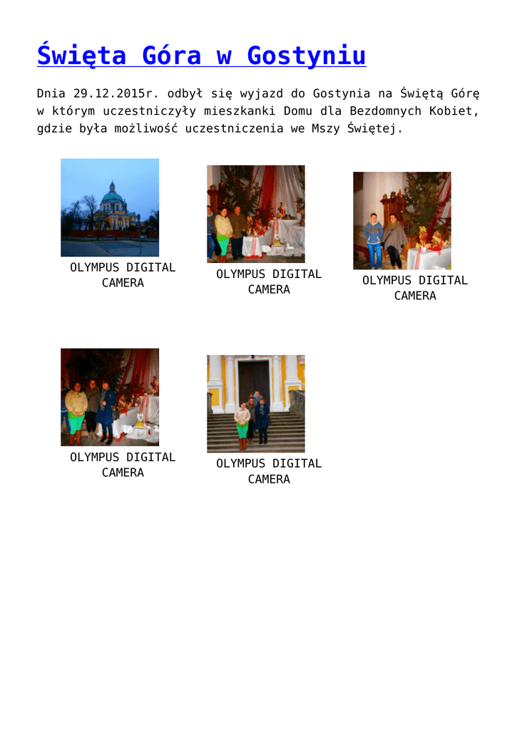 Święta Góra w Gostyniu Dnia 29.12.2015r. odbył się wyjazd do Gostynia na Świętą Górę w którym uczestniczyły mieszkanki Domu dla Bezdomnych Kobiet, gdzie była możliwość uczestniczenia we Mszy Świętej. OLYMPUS DIGITAL CAMERA OLYMPUS DIGITAL CAMERA OLYMPUS DIGITAL CAMERA OLYMPUS DIGITAL CAMERA OLYMPUS DIGITAL CAMERA