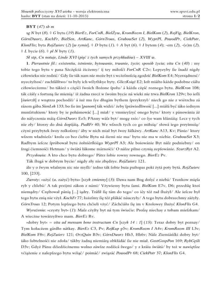 Słownik polszczyzny XVI wieku - wersja elektroniczna hasło: BYT (stan na dzień: 11-10-2015) www.spxvi.edu.pl strona 1/2 BYT (47) sb m sg N byt (8). ◊ G bytu (19) BierEz, ForCnR, BielŻyw, KromRozm I, BielKom (2), RejFig, BielKron, GórnDworz, KochFr, BielSen, ArtKanc, GórnTroas, GrabowSet (2), WyprPl, PowodPr, CiekPotr, KlonFlis; byta RejZwierc (2) [w rymie]. ◊ D bytu (1). ◊ A byt (6). ◊ I bytem (4); -em (2), -(e)m (2). ◊ L bycie (6). ◊ pl N byty (1). Sł stp, Cn notuje, Linde XVI (pięć z tych samych przykładów) ‒ XVIII w. 1. Pierwotnie fil.: existentia, istnienie, bytowanie, trwanie, życie; sposób życia; vita Cn (40) : my tobie tego bytu v pana Sżcżęſciá żicżemy/ ij tey miłoſći ForCnR C2v; Lepyeyby ſie ſnadź nigdy cżłowieku nie rodzić/ Gdy ſie ták nam nie może byt s wcżeſnoſcią zgodzić BielKom E4; Nyerządnosć/ nyecżyſtosć/ zuchfálſtwo/ to były ich wſſythkye byty. GliczKsiąż E2; Ieſt miáſto káżde podobne ciáłu cżłowiecżemu/ bo tákież s cżęśći ſwoich ſłożone ſpołu/ á káżda cżęść roznego bytu. BielKron 108; ták cżáſy s fortuną ſie mienią/ iż żadna rzecż w ſwoim bycie ná wieki nie trwa BielKron 129v; bo ieſli [świerzb] z wnątrza pochodźi/ á iuż mu ſye długim bythem ſprzykrzył/ niech go nie z wiérzchu zá rázem gába SienLek 133; bo ſie im [panom] ták widzi/ żeby ſpráwiedliwość [...] miáłá być iáko iednym munſztukiem/ ktory by ie pohámowáć [...] miał/ y vmnieyſzyć onego bytu/ ktory s pánowánia áż do náſyczenia máią GórnDworz Ee5; PAnny wáſz byt/ mogę rzéc/ co ſye wam kłániáią: Lecz y tych nie zły/ ktorzy do dná dopijáią. PudłFr 40; We wſzech tych co go miłuią/ słowá iego przyimuią/ cżyni przybytek ſwoy roſkoſzny/ áby w nich miał byt ſwoy łáſkáwy. ArtKanc A13, Kv; Pánie/ ktory wſzem władnieſz/ krolu co bez ćiebie Bytu ná źiemi nie ma/ bytu nie ma w niebie. GrabowSet X3; Radbym ieſcze ſpróbował bytu żołniérſkiégo WyprPl A3; Ale boiowánie Byt náſz podniebny/ on ſrogi ćiemnośći Hetman/ y świátá łákome márnośći/ O náſze pilno czynią zepſowánie. SzarzRyt A2. Przysłowia: A kto chce bytu dobrego/ Pátrz ſobie rowny rownego. BierEz Pv. Ták ſługá w dobrym bycie/ nigdy zły nie zbędzye. RejZwierz 121. ále y o ſwym właſnym nic nie myſli/ iedno ták ſobie buia puſtopas poki żytá poty bytá. RejZwierc 100, [233]. Zwroty: »użyć (a. zażyć) bytu« [szyk zmienny] (5): Dawa nam Bog doſyć z niebá/ Trunkow mięſa ryb y chlebá/ A tak przijmi zákon z námi/ Vżywiemy bytu ſami. BielKom E7v, D6; przedśię ktoś niemądry/ Częſtował pánią [...] iądry. Tráfił ſię tám do tego/ co iéy téż rad ſłużył/ Ale ieſcze był tego bytu znią nie vżył. KochFr 77; Iużeſmy ſię téż płákáć náuczyły/ A tego bytu dobrzechmy záżyły. GórnTroas 12; Potym lepſzego bytu chćieli vżyć/ Záchćiáło ſię im v Krolowey ſłużyć KlonFlis G4. Wyrażenia: »czysty byt« (1): Maſz cżyſty byt ná tym świećie: Proſzę niechay z tobam mieſzkam/ A wiecżne towárzyſtwo mam. BierEz Rv. »dobry byt« = vita ad mensam bene instructam Cn [szyk 14 : 1] (15): Teraz dobry byt poznay/ Tym kołacżem gárdło nátkay. BierEz C3, Pv; RejKup p5v; KromRozm I A4v; KromRozm III L3v; BielKom F8v; RejZwierz 121; OrzQuin B3v; GórnDworz Hh3, Hh6v; Náſz Ziemiáńſki dobry byt/ iáko ſubtelnośći nie zdoła/ tákby żadną niemiárą obkłádáć ſie nie miał. GostGospPon 169; RybGęśli D3v; Gdyż Pánu dźiedźicżnemu wolno záwſze rodźicá ſwego/ y z kráiu świátá/ by też w nawiętſze vćiążenie z nalepſzego bytu wźiąć/ poimáć/ związáć PowodPr 68; CiekPotr 37; KlonFlis G4. Słownik polszczyzny XVI wieku - wersja elektroniczna hasło: BYT (stan na dzień: 11-10-2015) www.spxvi.edu.pl strona 2/2 »byt dostateczny« (1): Koſztowne potráwy iádły. A gdy táko hoynie żyłá/ Myſz ſie wieśna zádziwiłá: Chwaląc ten byt doſtátecżny/ Ieſliby też był prześpiecżny. BierEz M3v. »osobny byt« = subsistentia (1): że Perſoná to ſłowo znácży w ſobie rzecż tháką w ſwym oſobnym bycie álbo ſthanie/ ktora tym co ieſt vſtáwicżnie/ ieſt/ á nieodmiennie SarnUzn B5v. »byt wieczny« = nieśmiertelność [szyk 1 : 1] (2): dyabli ſą żywi cicho, [...] ducha cirpiącego, ciała powietrznego, bytu wiecżnego BielŻyw 91; ArtKanc T10v. 2. Miejsce pobytu (7) : RejFig Aa3; Hic ego moror, Tu ya mieſzkam/ tu yeſt móy byt. Mącz 232d. bytem skąd = zamieszkały (1): SOlon mędrzec ieden z ſiedmi mędrczow rodem y bytem z Aten. BielŻyw 5. Fraza: »nie tu [czyjego] bytu« = nie ma tu (dla kogoś) miejsca, wynoś się! (1): Y z źiemie precż wyciągay/ nie tu twego bytu BielSen 6. Zwroty: »bytem być« (1): Commorari apud Pelorum, Mieſzkáć/ bytem być. Mącz 233a. »mieć swoj byt« (1): Moror ... Aliquando significat, Mieſzkam/ mam ſwóy byt. Mącz 232d. »[gdzie] bytem mieszkać« (1): wszak ia w Polscze bytem nie mięszkąm, nie zawadzę ni komu ActReg 159. Synonim: 1. stan. Cf [BOŻYBYT], BYCIE, BYTNOŚĆ, BYTO BC