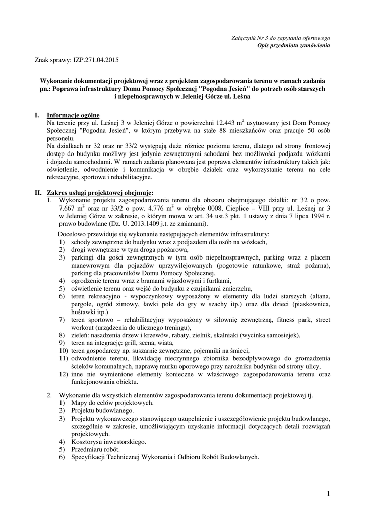 Załącznik Nr 3 do zapytania ofertowego Opis przedmiotu zamówienia Znak sprawy: IZP.271.04.2015 Wykonanie dokumentacji projektowej wraz z projektem zagospodarowania terenu w ramach zadania pn.: Poprawa infrastruktury Domu Pomocy Społecznej "Pogodna Jesień" do potrzeb osób starszych i niepełnosprawnych w Jeleniej Górze ul. Leśna I. Informacje ogólne Na terenie przy ul. Leśnej 3 w Jeleniej Górze o powierzchni 12.443 m2 usytuowany jest Dom Pomocy Społecznej "Pogodna Jesień", w którym przebywa na stałe 88 mieszkańców oraz pracuje 50 osób personelu. Na działkach nr 32 oraz nr 33/2 występują duże różnice poziomu terenu, dlatego od strony frontowej dostęp do budynku możliwy jest jedynie zewnętrznymi schodami bez możliwości podjazdu wózkami i dojazdu samochodami. W ramach zadania planowana jest poprawa elementów infrastruktury takich jak: oświetlenie, odwodnienie i komunikacja w obrębie działek oraz wykorzystanie terenu na cele rekreacyjne, sportowe i rehabilitacyjne. II. Zakres usługi projektowej obejmuje: 1. Wykonanie projektu zagospodarowania terenu dla obszaru obejmującego działki: nr 32 o pow. 7.667 m2 oraz nr 33/2 o pow. 4.776 m2 w obrębie 0008, Cieplice – VIII przy ul. Leśnej nr 3 w Jeleniej Górze w zakresie, o którym mowa w art. 34 ust.3 pkt. 1 ustawy z dnia 7 lipca 1994 r. prawo budowlane (Dz. U. 2013.1409 j.t. ze zmianami). Docelowo przewiduje się wykonanie następujących elementów infrastruktury: 1) schody zewnętrzne do budynku wraz z podjazdem dla osób na wózkach, 2) drogi wewnętrzne w tym droga ppożarowa, 3) parkingi dla gości zewnętrznych w tym osób niepełnosprawnych, parking wraz z placem manewrowym dla pojazdów uprzywilejowanych (pogotowie ratunkowe, straż pożarna), parking dla pracowników Domu Pomocy Społecznej, 4) ogrodzenie terenu wraz z bramami wjazdowymi i furtkami, 5) oświetlenie terenu oraz wejść do budynku z czujnikami zmierzchu, 6) teren rekreacyjno - wypoczynkowy wyposażony w elementy dla ludzi starszych (altana, pergole, ogród zimowy, ławki pole do gry w szachy itp.) oraz dla dzieci (piaskownica, huśtawki itp.) 7) teren sportowo – rehabilitacyjny wyposażony w siłownię zewnętrzną, fitness park, street workout (urządzenia do ulicznego treningu), 8) zieleń: nasadzenia drzew i krzewów, rabaty, zielnik, skalniaki (wycinka samosiejek), 9) teren na integrację: grill, scena, wiata, 10) teren gospodarczy np. suszarnie zewnętrzne, pojemniki na śmieci, 11) odwodnienie terenu, likwidację nieczynnego zbiornika bezodpływowego do gromadzenia ścieków komunalnych, naprawę murku oporowego przy narożniku budynku od strony ulicy, 12) inne nie wymienione elementy konieczne w właściwego zagospodarowania terenu oraz funkcjonowania obiektu. 2. Wykonanie dla wszystkich elementów zagospodarowania terenu dokumentacji projektowej tj. 1) Mapy do celów projektowych. 2) Projektu budowlanego. 3) Projektu wykonawczego stanowiącego uzupełnienie i uszczegółowienie projektu budowlanego, szczególnie w zakresie, umożliwiającym uzyskanie informacji dotyczących detali rozwiązań projektowych. 4) Kosztorysu inwestorskiego. 5) Przedmiaru robót. 6) Specyfikacji Technicznej Wykonania i Odbioru Robót Budowlanych. 1 III. Wymagania dotyczące przedmiotu zamówienia: 1. Dokumentacja projektowa, przedmiar, specyfikacja techniczna wykonania i odbioru robót budowlanych mają być opracowane zgodnie z Ustawą z dnia 7 lipca 1994 r. Prawo budowlane (Dz.U.2013.1409 j.t. z póź.zm) oraz Rozporządzenia Ministra Infrastruktury z dnia 2 września 2004 r w sprawie szczegółowego zakresu i formy dokumentacji projektowej, specyfikacji technicznych wykonania i odbioru robót budowlanych oraz programu funkcjonalno-użytkowego (Dz.U.2013.1129 j.t.) ; 2. Kosztorys Inwestorski - który służyć ma ustaleniu planowanych kosztów robót budowlanych, opracowany zgodnie z zasadami określonymi w Rozporządzeniu Ministra Infrastruktury z dnia 18 maja 2004 w sprawie określenia metod i podstaw sporządzania kosztorysu inwestorskiego, obliczania planowanych kosztów prac projektowych oraz planowanych kosztów robót budowlanych określonych w programie funkcjonalno-użytkowym (Dz. U.2004.130.1389). 3. Dokumentacja projektowa ma zostać wykonana w formie papierowej w następujących ilościach: b) Prace przedprojektowe (mapa, inwentaryzacja, uzgodnienia) - w 1 egzemplarzu; c) Koncepcja w II wariantach - po 2 egzemplarze; d) Projekt budowlany - w 5 egzemplarzach; e) Projekt wykonawczy - w 4 egzemplarzach f) STWiORB - w 3 egzemplarzach; g) Przedmiar robót - w 2 egzemplarzach; h) Kosztorys Inwestorski - w 2 egzemplarzach. do kompletu dokumentacji należy dołączyć płytę CD-R/RW zawierającą opisy techniczne i specyfikacje techniczne w sformatowanym pliku tekstowym (nazwa_pliku.doc), kosztorys Inwestorski w formacie arkusza kalkulacyjnego (nazwa_pliku.xls), wszystkie pliki graficzne dokumentacji (wykonane programem pozwalającym zapisać pliki graficzne z rozszerzeniem nazwa_pliku.dwg). Ponadto wszystkie pliki należy zapisać w formacie pdf. IV. Informacje dodatkowe: 1. Strony ustalają, że obowiązującą formą wynagrodzenia jest cena ryczałtowa zawierająca również wynagrodzenie za czynności związane z robotami przygotowawczymi, które Wykonawca musi wykonać własnym staraniem. Wszelkie koszty związane z uzyskaniem materiałów wyjściowych do projektowania ponosi Wykonawca. 2. Przedmiot objęty niniejszym zamówieniem, będzie w następstwie podstawą wyłonienia wykonawcy robót budowlanych, w związku z czym dokumentacja powinna zostać opracowana w sposób umożliwiający dokonanie opisu przedmiotu zamówienia na roboty budowlane zgodnie z zapisem art. 29, 30 oraz 31 ustawy z dnia 29 stycznia 2004 r. prawo zamówień publicznych (tekst jednolity Dz. U. z 2013, poz. 907 z późn. zm.). 3. Zgodnie z treścią art. 29 ustawy Prawo zamówień publicznych (tekst jednolity Dz. U. z 2013, poz. 907 z późn. zm.): ust.1. Przedm
