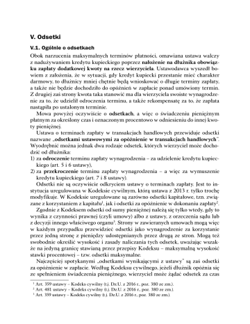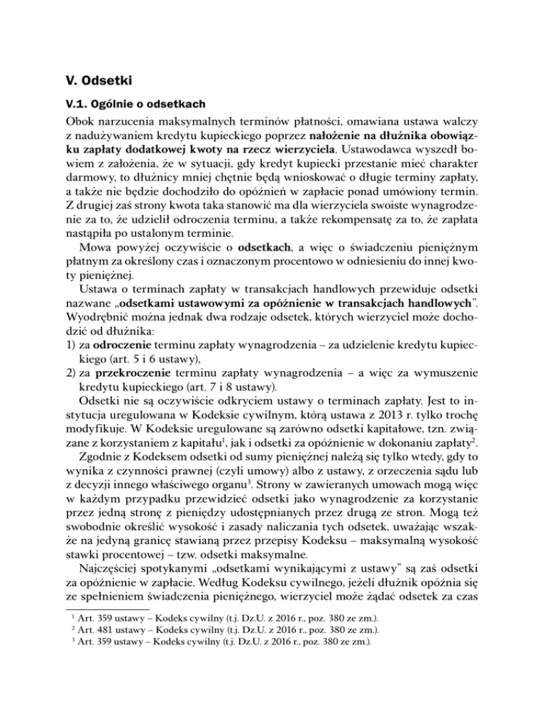 V. Odsetki V.1. Ogólnie o odsetkach Obok narzucenia maksymalnych terminów płatności, omawiana ustawa walczy z nadużywaniem kredytu kupieckiego poprzez nałożenie na dłużnika obowiązku zapłaty dodatkowej kwoty na rzecz wierzyciela. Ustawodawca wyszedł bowiem z założenia, że w sytuacji, gdy kredyt kupiecki przestanie mieć charakter darmowy, to dłużnicy mniej chętnie będą wnioskować o długie terminy zapłaty, a także nie będzie dochodziło do opóźnień w zapłacie ponad umówiony termin. Z drugiej zaś strony kwota taka stanowić ma dla wierzyciela swoiste wynagrodzenie za to, że udzielił odroczenia terminu, a także rekompensatę za to, że zapłata nastąpiła po ustalonym terminie. Mowa powyżej oczywiście o odsetkach, a więc o świadczeniu pieniężnym płatnym za określony czas i oznaczonym procentowo w odniesieniu do innej kwoty pieniężnej. Ustawa o terminach zapłaty w transakcjach handlowych przewiduje odsetki nazwane „odsetkami ustawowymi za opóźnienie w transakcjach handlowych”. Wyodrębnić można jednak dwa rodzaje odsetek, których wierzyciel może dochodzić od dłużnika: 1) za odroczenie terminu zapłaty wynagrodzenia – za udzielenie kredytu kupieckiego (art. 5 i 6 ustawy), 2) za przekroczenie terminu zapłaty wynagrodzenia – a więc za wymuszenie kredytu kupieckiego (art. 7 i 8 ustawy). Odsetki nie są oczywiście odkryciem ustawy o terminach zapłaty. Jest to instytucja uregulowana w Kodeksie cywilnym, którą ustawa z 2013 r. tylko trochę modyfikuje. W Kodeksie uregulowane są zarówno odsetki kapitałowe, tzn. związane z korzystaniem z kapitału1, jak i odsetki za opóźnienie w dokonaniu zapłaty2. Zgodnie z Kodeksem odsetki od sumy pieniężnej należą się tylko wtedy, gdy to wynika z czynności prawnej (czyli umowy) albo z ustawy, z orzeczenia sądu lub z decyzji innego właściwego organu3. Strony w zawieranych umowach mogą więc w każdym przypadku przewidzieć odsetki jako wynagrodzenie za korzystanie przez jedną stronę z pieniędzy udostępnianych przez drugą ze stron. Mogą też swobodnie określić wysokość i zasady naliczania tych odsetek, uważając wszakże na jedyną granicę stawianą przez przepisy Kodeksu – maksymalną wysokość stawki procentowej – tzw. odsetki maksymalne. Najczęściej spotykanymi „odsetkami wynikającymi z ustawy” są zaś odsetki za opóźnienie w zapłacie. Według Kodeksu cywilnego, jeżeli dłużnik opóźnia się ze spełnieniem świadczenia pieniężnego, wierzyciel może żądać odsetek za czas 1 Art. 359 ustawy – Kodeks cywilny (t.j. Dz.U. z 2016 r., poz. 380 ze zm.). Art. 481 ustawy – Kodeks cywilny (t.j. Dz.U. z 2016 r., poz. 380 ze zm.). 3 Art. 359 ustawy – Kodeks cywilny (t.j. Dz.U. z 2016 r., poz. 380 ze zm.). 2 opóźnienia, chociażby nie poniósł żadnej szkody i chociażby opóźnienie było następstwem okoliczności, za które dłużnik odpowiedzialności nie ponosi4. Odsetki za opóźnienie, których domagać się może wierzyciel na podstawie ustawy o terminach zapłaty, są dokładnie takimi odsetkami. Ustawa ta szczegółowo określa jednak, od kiedy należą się odsetki, a także przewiduje ich minimalną wysokość. Poruszając kwestię odsetek na potrzeby omówienia ustawy o terminach zapłaty w transakcjach handlowych, wskazać należy na następujące rodzaje odsetek: 1) odsetki umowne, 2) odsetki ustawowe, 3) odsetki maksymalne, 4) odsetki ustawowe za opóźnienie w rozumieniu Kodeksu cywilnego, 5) odsetki maksymalne za opóźnienie, 6) odsetki ustawowe za opóźnienie w transakcjach handlowych, 7) odsetki za zwłokę od zaległości podatkowych, 8) odsetki ustawowe za opóźnienie w płatnościach w rozumieniu dyrektywy 2011/7/UE. Poszczególne rodzaje wskazanych odsetek zostaną omówione w kolejnym rozdziale, gdzie między innymi przedstawiony zostanie najistotniejszy element odsetek, czyli ich wysokość. 4 Art. 481 ustawy – Kodeks cywilny (t.j. Dz.U. z 2016 r., poz. 380 ze zm.).