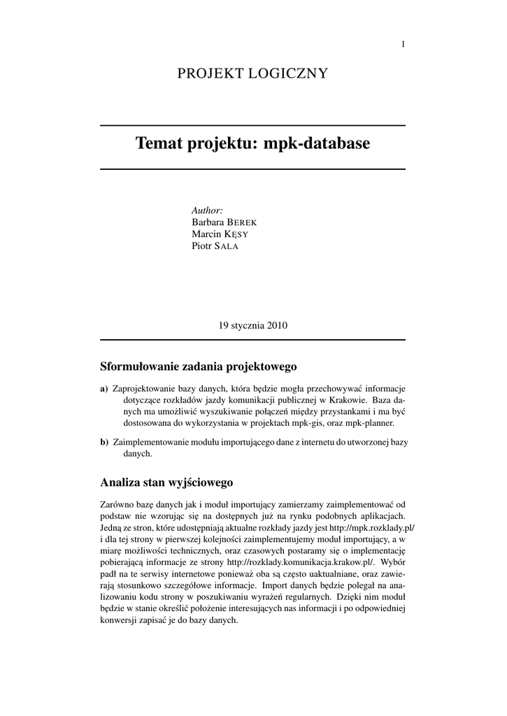 ˛ rozkładów jazdy komunikacji publicznej w Krakowie. Baza danych ma umożliwić wyszukiwanie połaczeń