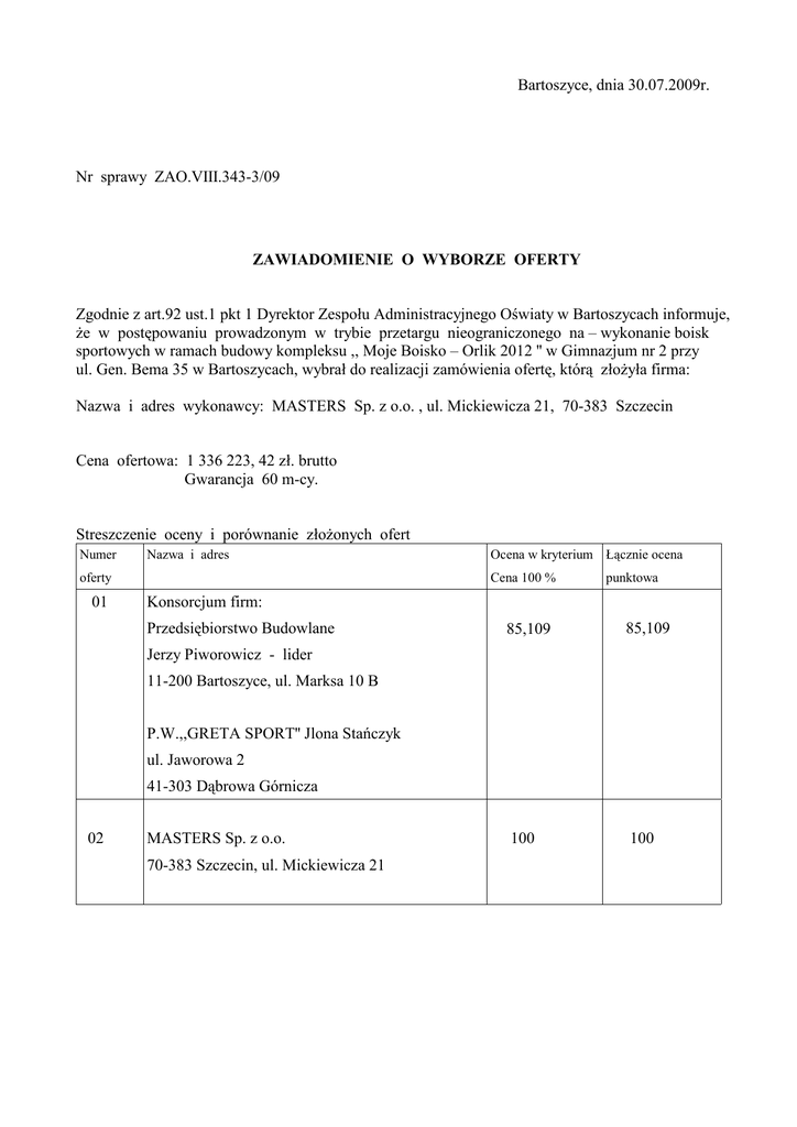 Bartoszyce, dnia 30.07.2009r. Nr sprawy ZAO.VIII.343-3/09 ZAWIADOMIENIE O WYBORZE OFERTY Zgodnie z art.92 ust.1 pkt 1 Dyrektor Zespołu Administracyjnego Oświaty w Bartoszycach informuje, Ŝe w postępowaniu prowadzonym w trybie przetargu nieograniczonego na – wykonanie boisk sportowych w ramach budowy kompleksu ,, Moje Boisko – Orlik 2012 '' w Gimnazjum nr 2 przy ul. Gen. Bema 35 w Bartoszycach, wybrał do realizacji zamówienia ofertę, którą złoŜyła firma: Nazwa i adres wykonawcy: MASTERS Sp. z o.o. , ul. Mickiewicza 21, 70-383 Szczecin Cena ofertowa: 1 336 223, 42 zł. brutto Gwarancja 60 m-cy. Streszczenie oceny i porównanie złoŜonych ofert Numer Nazwa i adres oferty 01 Ocena w kryterium Łącznie ocena Cena 100 % punktowa Konsorcjum firm: Przedsiębiorstwo Budowlane 85,109 85,109 100 100 Jerzy Piworowicz - lider 11-200 Bartoszyce, ul. Marksa 10 B P.W.,,GRETA SPORT'' Jlona Stańczyk ul. Jaworowa 2 41-303 Dąbrowa Górnicza 02 MASTERS Sp. z o.o. 70-383 Szczecin, ul. Mickiewicza 21 03 Konsorcjum firm: ,, EKOBUD'' Sp. z o.o. - lider 94,04 94,04 14-100 Ostróda, ul. Przemysłowa 8 MEDIA STADION Sp. z o.o. BUDOWNICTWO SPORTOWE - partner 71-010 Szczecin, ul. Białowieska 2 UpowaŜniony do reprezentowania wykonawcy przedstawiciel ma obowiązek stawić się w dniu 10 .08. 2009r w siedzibie zamawiającego z potwierdzonym wniesieniem zabezpieczenia naleŜytego wykonania umowy w celu podpisania umowy. Od niniejszej decyzji przysługują środki ochrony prawnej określone w ustawie z dnia 29 stycznia 2004 roku Prawo zamówień publicznych – dział VI ,, Środki ochrony prawnej ''. Starszy Inspektor ds. Technicznych i BHP Bogdan Mroczek