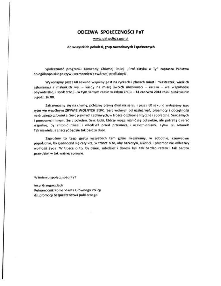 ODEZWA SPOŁECZNOŚCI PaT www.pat.poliqa.ROv.pl do wszystkich pokoleń, grup zawodowych i społecznych Społeczność programu Komendy Głównej Policji „Profilaktyka a Ty" zaprasza Państwa do ogólnopolskiego zrywu wzmocnienia twórczej profilaktyki. Wykonajmy przez 60 sekund wspólny gest na rynkach i placach miast i miasteczek, wielkich aglomeracji i maleńkich wsi - każdy na miarę swoich możliwości - razem - we wspólnocie obywatelskiej i społecznej - w tym samym czasie w całym kraju - 14 czerwca 2014 roku punktualnie ogodz. 16.00. Zatrzymajmy się na chwilę, połóżmy prawą dłoń na sercu i przez 60 sekund wybijajmy jego rytm we wspólnym ZRYWIE WOLNYCH SERC. Serc wolnych od uzależnień, przemocy i obojętności na drugiego człowieka. Serc pięknych i zdrowych, w trosce o zdrowie fizyczne i społeczne. Serc silnych i pomocnych innym. Serc pokoleń. Serc ludzi, którzy mogą różnić się od siebie, ale potrafią działać wspólnie, by chronić dzieci i młodzież przed przemocą i uzależnieniami. Tylko 60 sekund! Tak niewiele, a znaczyć będzie tak bardzo dużo. Zaprośmy to tego gestu wszystkich tam gdzie mieszkamy, w sobotnie, czerwcowe popołudnie, by zjednoczył się cały kraj w trosce o to, aby narkotyki, alkohol i przemoc nie odbierały wolnośd życia. W trosce o to, by dzieci, młodzież i dorośli byli tak bardzo razem i tak bardzo prawdziwi w tak ważnej sprawie. W imieniu społeczności PaT insp. Grzegorz Jach Pełnomocnik Komendanta Głównego Policji ds. promocji bezpieczeństwa publicznego