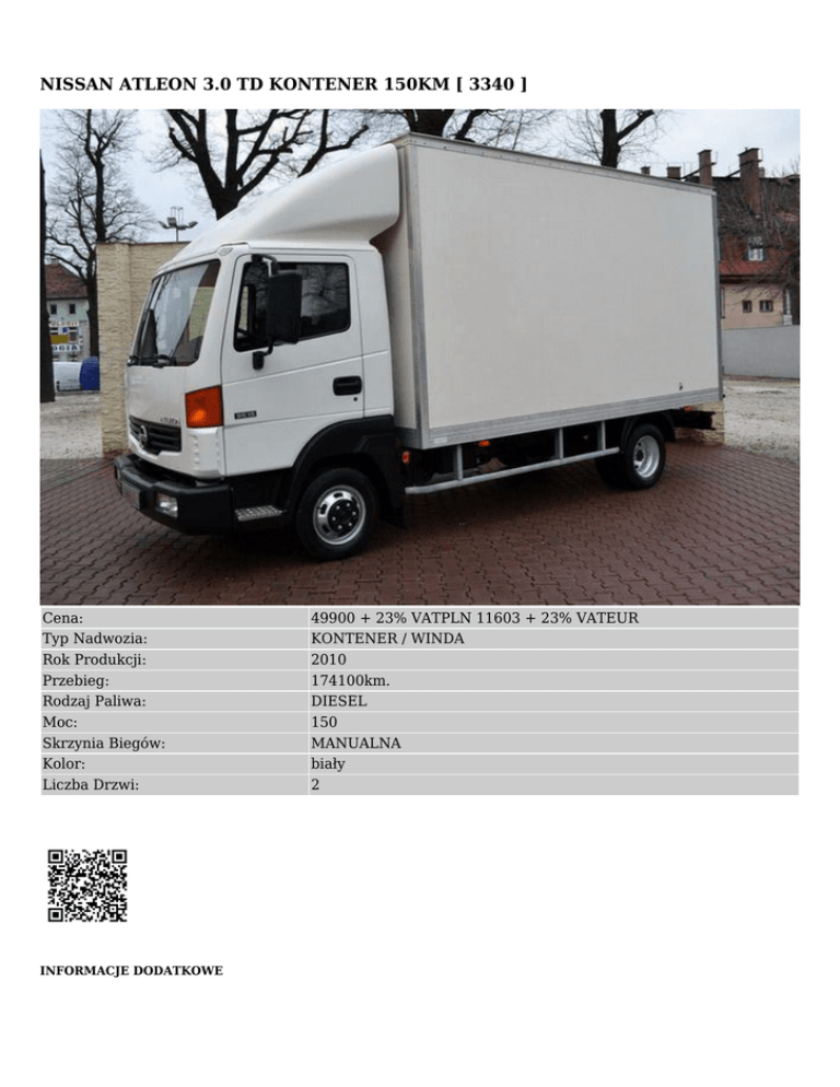 NISSAN ATLEON 3.0 TD KONTENER 150KM [ 3340 ] Cena: Typ Nadwozia: Rok Produkcji: Przebieg: Rodzaj Paliwa: Moc: Skrzynia Biegów: Kolor: Liczba Drzwi: INFORMACJE DODATKOWE 49900 + 23% VATPLN 11603 + 23% VATEUR KONTENER / WINDA 2010 174100km. DIESEL 150 MANUALNA biały 2 ● ● ● ● bezwypadkowy sprowadzony zarejestrowany w polsce stan bardzo dobry WYPOSAŻENIE ● ● ● ● ● ● centralny zamek elektryczne lusterka immobiliser radio / cd wspomaganie kierownicy elektryczne szyby OPIS NUMER OFERTY- 3340 Nissan Atleon kontener. Rok produkcji 2010, kolor biały. Auto bezwypadkowe, sprawne w 100% w bardzo dobrym stanie technicznym i wizualnym. Wnętrze czyste, zadbane i przestronne. Powłoka lakiernicza w idealnym stanie. Wzorowa praca silnika, skrzyni biegów i zawieszenia. Nissan nie wymaga wkładu finansowego. Auto posiada silnik 3.0 TD o mocy 150KM. Świetnie się prezentuje i prowadzi. Solidne auto do ciężkiej pracy. Polecam. Wyposażenie: - centralny zamek - wspomaganie kierownicy - regulacja kierownicy - elektryczne szyby - elektryczne lusterka - podgrzewane lusterka - radio CD - 5 biegów - 3 miejsca - bliźniacze koła - wymiary powierzchni ładunkowej: długość /420 cm/ szerokość /207 cm/ wysokość /230 cm/ -Podana cena jest CENĄ NETTO!!. Wystawiamy Fakturę VAT. -MOŻLIWOŚĆ KREDYTOWANIA LUB LEASINGOWANIA, 100% WARTOŚCI AUTA, PROCEDURA UPROSZCZONA, WYMAGANE DOKUMENTY NIP, REGON, WPIS DO EWIDENCJI, DOWÓD OSOBISTY. -WIĘCEJ INFORMACJI NA STRONIE WWW.AUTO-PLUS.COM.PL -NINIEJSZE OGŁOSZENIE JEST WYŁĄCZNIE INFORMACJĄ HANDLOWĄ I NIE STANOWI OFERTY W MYŚL art. 66, § 1. KODEKSU CYWILNEGO. SPRZEDAJĄCY NIE ODPOWIADA ZA EWENTUALNE BŁĘDY LUB NIEAKTUALNOŚĆ OGŁOSZENIA.