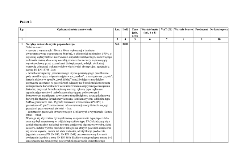 Pakiet 3 Lp. 1 1 Opis przedmiotu zamówienia 2 J.m. Ilość 3 Sterylny zestaw do szycia poporodowego Szt. Skład zestawu: - serweta o wymiarach 150cm x 90cm wykonanej z laminatu dwuwarstwowego o gramaturze 56gr/m2, o chłonności minimalnej 570%, o wysokiej wytrzymałości na zrywanie, antyelektrostatycznego, stanowiącego całkowita barierę dla cieczy na całej powierzchni serwety, zapewniający wysoką ochronę przed czynnikami biologicznymi, a dzięki delikatnej warstwie ochronnej wykazuje dobre właściwości absorpcyjne, zgodność z normą PE EN 13795 -3szt - fartuch chirurgiczny jednorazowego użytku posiadającego przedłużone poły umożliwiające wiązanie najpierw na „brudno” , a następnie na „czysto”; fartuch złożony w sposób „book folded” umożliwiający samodzielne, aseptyczne założenie; w pasie fartuch wiązany na 4 troki; troki zewnętrzne zabezpieczone kartonikiem w celu umożliwienia aseptycznego zawiązania fartucha; przy szyi fartuch zapinany na rzep; rękawy typu raglan nie ograniczające ruchów i zakończone niepylącym, poliestrowym i bezszwowym mankietem; szwy zszyte ultradźwiękowo tworzą dodatkową barierę dla płynów; fartuch sterylizowany tlenkiem etylenu, włóknina typu SMS o gramaturze min. 35g/m2; barierowe wzmocnienie (PE+PP) o gramaturze 40 g/m2 zamocowane od zewnętrznej strony fartucha na jego przodzie i przy rękawach do łokci – 1szt - kompresów gazowych 16warstwowych 17nitkowych o wymiarach 10cm x 10cm – 40szt Wymaga się aby zestaw był zapakowany w opakowanie typu papier-folia oraz aby był zaopatrzony w trójdzielną etykietę typu TAG składającą się z części nieusuwalnej na której powinna znajdować się: nazwa wyrobu, skład zestawu, indeks wyrobu oraz dwie naklejki na których powinien znajdować się indeks wyrobu, numer lot, data ważności, identyfikacja producenta (zgodnie z normą PN EN 980, PN EN 1041) oraz oznakowany kierunek otwierania (zgodnie z norą PN EN 868). Etykiety samoprzylepne muszą być umieszczone na zewnętrznej powierzchni opakowania jednostkowego 4 3200 Cena jedn. netto 5 Wartość netto VAT (%) Wartość brutto Producent Nr katalogowy (kol. 4 x 5) 6 7 8 9 10 2 Sterylny zestaw do porodu Szt. Skład zestawu: - serweta o wymiarach 113 cm x 90 cm z kieszenią na płyny z laminatu dwuwarstwowego o gramaturze 56gr/m2, o chłonności minimalnej 570%, o wysokiej wytrzymałości na zrywanie, antyelektrostatycznego, stanowiącego całkowita barierę dla cieczy na całej powierzchni serwety, zapewniający wysoką ochronę przed czynnikami biologicznymi, a dzięki delikatnej warstwie ochronnej wykazuje dobre właściwości absorpcyjne, zgodność z normą PE EN 13795 - 1szt -osłona na kończynę pacjentki o wymiarze min. 120 cm x 75cm- 2 szt. - fartuch chirurgiczny jednorazowego użytku posiadającego przedłużone poły umożliwiające wiązanie najpierw na „brudno” , a następnie na „czysto”; fartuch złożony w sposób „book folded” umożliwiający samodzielne, aseptyczne założenie; w pasie fartuch wiązany na 4 troki; troki zewnętrzne zabezpieczone kartonikiem w celu umożliwienia aseptycznego zawiązania fartucha; przy szyi fartuch zapinany na rzep; rękawy typu raglan nie ograniczające ruchów i zakończone niepylącym, poliestrowym i bezszwowym mankietem; szwy zszyte ultradźwiękowo tworzą dodatkową barierę dla płynów; fartuch sterylizowany tlenkiem etylenu, włóknina typu SMS o gramaturze min. 35g/m2; barierowe wzmocnienie (PE+PP) o gramaturze 40 g/m2 zamocowane od zewnętrznej strony fartucha na jego przodzie i przy rękawach do łokci – 1szt - serwetki do rąk o wymiarze 20cm x 10cm - 2szt - wykonanych z włókniny kompresowej - 4szt - kompresy gazowe 16 warstwowe 17 nitkowe o wymiarach 10cm x 10cm – 5szt - kompresy włókninowe 4 warstwowe 40cm x 20cm o minimalnej gramaturze 40g/m2 -2szt - podkład higieniczny z wkładem chłonnym, wykonanym z pulpy celulozowej, zabezpieczonego włókniną hydrofilową, bibułą, folią izolacyjną. Folia izolacyjna biała z nadrukiem, antypoślizgowa. Wymiary całkowite podkładu 90cm x 60cm. Minimalne rozmiary wkładu chłonnego 82cm x 58cm. Tolerancja ± 1 cm. Masa minimalna podkładu 96,4g, a chłonność 1750g, zgodnie z ISO 11948-1 -1szt - czapeczka dla noworodka wykonana ze 100% bawełny – 1szt - flanelowy kocyk dla noworodka wykonanego ze 100% bawełny o rozmiarze 160cm x 75cm -1szt -włóknina kompresowa o gramaturze 40g/m2 do owinięcia noworodka w rozmiarze 120cm x 60cm-1szt. 3600 3 4 Wymaga się aby zestaw był zapakowany w opakowanie typu papier-folia oraz aby był zaopatrzony w trójdzielną etykietę typu TAG składającą się z części nieusuwalnej na której powinna znajdować się: nazwa wyrobu, skład zestawu, indeks wyrobu oraz dwie naklejki na których powinien znajdować się indeks wyrobu, numer lot, data ważności, identyfikacja producenta (zgodnie z normą PN EN 980, PN EN 1041) oraz oznakowany kierunek otwierania (zgodnie z norą PN EN 868). Etykiety samoprzylepne muszą być umieszczone na zewnętrznej powierzchni opakowania jednostkowego Sterylne serwetki do osuszania rąk z włókniny kompresowej w rozmiarze Szt. 30cm x 30cm pakowane po 1szt, gramatura minimum 40g/m2; wymaga się aby serwetka była zapakowana w opakowanie typu papier-folia oraz aby opakowanie jednostkowe było zaopatrzone w trójdzielną etykietę typu TAG składającą się z części nieusuwalnej na której powinna znajdować się: nazwa wyrobu, skład zestawu, indeks wyrobu oraz dwie naklejki na których powinien znajdować się indeks wyrobu, numer lot, data ważności, identyfikacja producenta (zgodnie z normą PN EN 980, PN EN 1041) oraz oznakowany kierunek otwierania (zgodnie z norą PN EN 868). Etykiety samoprzylepne muszą być umieszczone na zewnętrznej powierzchni opakowania jednostkowego Sterylne serwety w kolorze niebieskim pod strzykawki o wymiarach 27cm x Szt. 18 cm złożone w sposób formujący kieszonkę