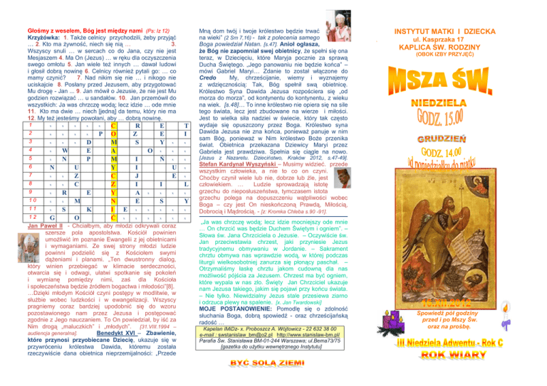 Głośmy z weselem, Bóg jest między nami (Ps: Iz 12) Krzyżówka: 1. Także celnicy przychodzili, żeby przyjąć … 2. Kto ma żywność, niech się nią … 3. Wszyscy snuli … w sercach co do Jana, czy nie jest Mesjaszem 4. Ma On (Jezus) … w ręku dla oczyszczenia swego omłotu 5. Jan wiele też innych … dawał ludowi i głosił dobrą nowinę 6. Celnicy również pytali go: … co mamy czynić? 7. Nad nikim się nie … i nikogo nie uciskajcie 8. Posłany przed Jezusem, aby przygotować Mu drogę - Jan ... 9. Jan mówił o Jezusie, że nie jest Mu godzien rozwiązać … u sandałów. 10. Jan przemówił do wszystkich: Ja was chrzczę wodą; lecz idzie … ode mnie 11. Kto ma dwie … niech [jedną] da temu, który nie ma 12. My też jesteśmy powołani, aby … dobrą nowinę. 1 x x x x x 2 x x x x P 3 x x x 4 x 5 x W N D E P 6 N 7 x x 8 x x 9 x R 10 x x 11 x S 12 G U Z C E M K O C R O Z M S A M I Y I C J Z I Y A N E I E x x Ć x O E E Y T I x x x x x Ń x x U E x I x x x L x S x Y x x x x x x x x Jan Paweł II - Chciałbym, aby młodzi odkrywali coraz szersze pola apostolstwa. Kościół powinien umożliwić im poznanie Ewangelii z jej obietnicami i wymaganiami. Ze swej strony młodzi ludzie powinni podzielić się z Kościołem swymi dążeniami i planami. „Ten dwustronny dialog, który winien przebiegać w klimacie serdeczności, otwarcia się i odwagi, ułatwi spotkanie się pokoleń i wymianę pomiędzy nimi, zaś dla Kościoła i społeczeństwa będzie źródłem bogactwa i młodości”[8]. …Dzięki młodym Kościół czyni postępy w modlitwie, w służbie wobec ludzkości i w ewangelizacji. Wszyscy pragniemy coraz bardziej upodobnić się do wzoru pozostawionego nam przez Jezusa i postępować zgodnie z Jego nauczaniem. To On powiedział, by iść za Nim drogą „maluczkich” i „młodych”. [31.VIII.1994 – audiencja generalna]. Benedykt XVI – Zbawienie, które przynosi przyobiecane Dziecię, ukazuje się w przywróceniu królestwa Dawida, któremu została rzeczywiście dana obietnica nieprzemijalności: „Przede Mną dom twój i twoje królestwo będzie trwać na wieki” (2 Sm 7,16) - tak z polecenia samego Boga powiedział Natan. [s.47]. Anioł ogłasza, że Bóg nie zapomniał swej obietnicy, że spełni się ona teraz, w Dziecięciu, które Maryja pocznie za sprawą Ducha Świętego. „Jego panowaniu nie będzie końca” – mówi Gabriel Maryi… Zdanie to został włączone do Credo My, chrześcijanie, wiemy i wyznajemy z wdzięcznością: Tak, Bóg spełnił swą obietnicę. Królestwo Syna Dawida Jezusa rozpościera się „od morza do morza”, od kontynentu do kontynentu, z wieku na wiek. [s.48]… To inne królestwo nie opiera się na sile tego świata, lecz jest zbudowane na wierze i miłości. Jest to wielka siła nadziei w świecie, który tak często wydaje się opuszczony przez Boga. Królestwo syna Dawida Jezusa nie zna końca, ponieważ panuje w nim sam Bóg, ponieważ w Nim królestwo Boże przenika świat. Obietnica przekazana Dziewicy Maryi przez Gabriela jest prawdziwa. Spełnia się ciągle na nowo. INSTYTUT MATKI I DZIECKA . ul. Kasprzaka 17 KAPLICA ŚW. RODZINY (OBOK IZBY PRZYJĘĆ) [Jezus z Nazaretu. Dzieciństwo, Kraków 2012, s.47-49]. Stefan Kardynał Wyszyński – Musimy widzieć. przede wszystkim człowieka, a nie to co on czyni. Choćby czynił wiele lub nie, dobrze lub źle, jest człowiekiem. … Ludzie sprowadzają istotę grzechu do nieposłuszeństwa, tymczasem istota grzechu polega na dopuszczeniu wątpliwości wobec Boga – czy jest On nieskończoną Prawdą, Miłością, Dobrocią i Mądrością. - [z: Kromka Chleba s.90 -91]. „Ja was chrzczę wodą; lecz idzie mocniejszy ode mnie … On chrzcić was będzie Duchem Świętym i ogniem”. – Słowa św. Jana Chrzciciela o Jezusie. – Oczywiście św. Jan przeciwstawia chrzest, jaki przyniesie Jezus tradycyjnemu obmywaniu w Jordanie. – Sakrament chrztu obmywa nas wprawdzie wodą, w której podczas liturgii wielkosobotniej zanurza się płonący paschał. – Otrzymaliśmy łaskę chrztu jakom cudowną dla nas możliwość pójścia za Jezusem. Chrzest ma być ogniem, które wypala w nas zło. Święty Jan Chrzciciel ukazuje nam Jezusa takiego, jakim się pojawi przy końcu świata. – Nie tylko. Niewidzialny Jezus stale przesiewa ziarno i odrzuca plewy na spalenie. [x. Jan Twardowski] MOJE POSTANOWIENIE: Pomodlę się o zdolność słuchania Boga, dobrą spowiedź - oraz chrześcijańską radość … Kapelan IMiDz- x. Proboszcz A. Wójtowicz - 22 632 38 00 e-mail : [email protected] http://www.stanislaw-bm.pl/ Parafia Św. Stanisława BM-01-244 Warszawa; ul.Bema73/75 [gazetka do użytku wewnętrznego Instytutu] Spowiedź pół godziny przed i po Mszy Św. oraz na prośbę. Duch Pana Boga nade mną, posłał mnie głosić dobrą nowinę ubogim. (Iz 61,1) Łk 3,10-18 - Pytały go tłumy: Cóż więc mamy czynić? On im odpowiadał: Kto ma dwie suknie, niech [jedną] da temu, który nie ma; a kto ma żywność, niech tak samo czyni. Przychodzili także celnicy, żeby przyjąć chrzest, i pytali go: Nauczycielu, co mamy czynić? On im odpowiadał: Nie pobierajcie nic więcej ponad to, ile wam wyznaczono. Pytali go też i żołnierze: A my, co mamy czynić? On im odpowiadał: Nad nikim się nie znęcajcie i nikogo nie uciskajcie, lecz poprzestawajcie na swoim żołdzie. Gdy więc lud oczekiwał z napięciem i wszyscy snuli domysły w sercach co do Jana, czy nie jest Mesjaszem, on tak przemówił do wszystkich: Ja was chrzczę wodą; lecz idzie mocniejszy ode mnie, któremu nie jestem godzien rozwiązać rzemyka u sandałów. On chrzcić was będzie Duchem Świętym i ogniem. Ma On wiejadło w ręku dla oczyszczenia swego omłotu: pszenicę zbierze do spichlerza, a plewy spali w ogniu nieugaszonym. Wiele też innych napomnień dawał ludowi i głosił dobrą nowinę. - Uporczywe wołanie Jana Chrzciciela … może stworzyć wrażenie, że nawrócenie jest c