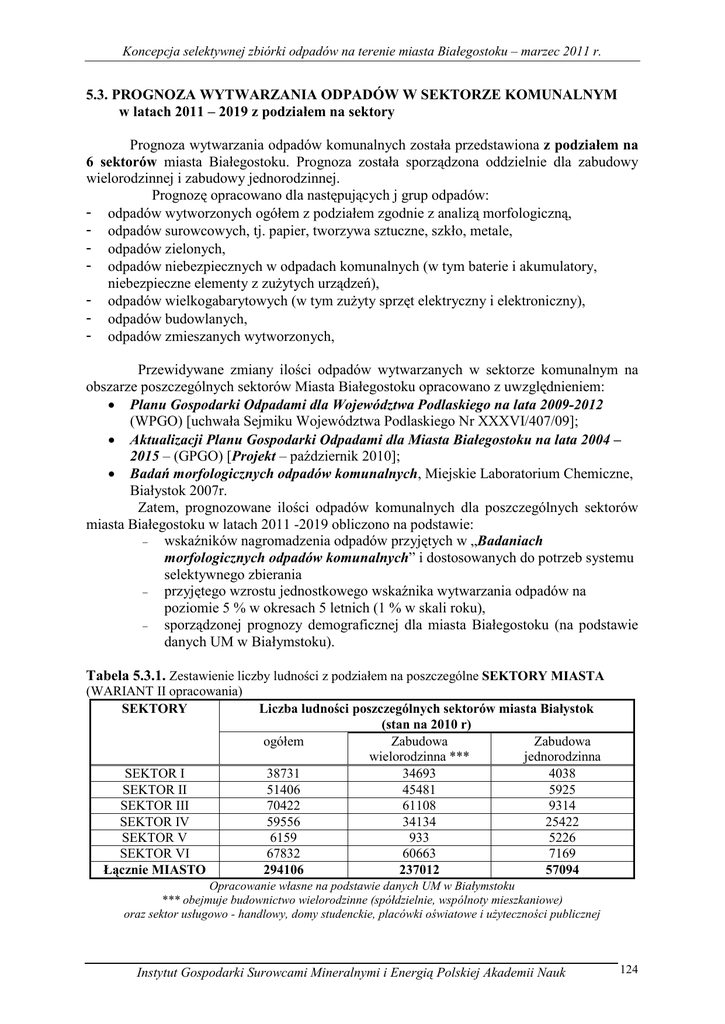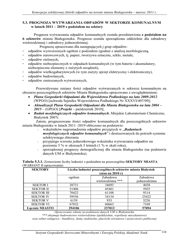 Koncepcja selektywnej zbiórki odpadów na terenie miasta Białegostoku – marzec 2011 r. 5.3. PROGNOZA WYTWARZANIA ODPADÓW W SEKTORZE KOMUNALNYM w latach 2011 – 2019 z podziałem na sektory Prognoza wytwarzania odpadów komunalnych została przedstawiona z podziałem na 6 sektorów miasta Białegostoku. Prognoza została sporządzona oddzielnie dla zabudowy wielorodzinnej i zabudowy jednorodzinnej. Prognozę opracowano dla następujących j grup odpadów: - odpadów wytworzonych ogółem z podziałem zgodnie z analizą morfologiczną, - odpadów surowcowych, tj. papier, tworzywa sztuczne, szkło, metale, - odpadów zielonych, - odpadów niebezpiecznych w odpadach komunalnych (w tym baterie i akumulatory, niebezpieczne elementy z zuŜytych urządzeń), - odpadów wielkogabarytowych (w tym zuŜyty sprzęt elektryczny i elektroniczny), - odpadów budowlanych, - odpadów zmieszanych wytworzonych, Przewidywane zmiany ilości odpadów wytwarzanych w sektorze komunalnym na obszarze poszczególnych sektorów Miasta Białegostoku opracowano z uwzględnieniem: • Planu Gospodarki Odpadami dla Województwa Podlaskiego na lata 2009-2012 (WPGO) [uchwała Sejmiku Województwa Podlaskiego Nr XXXVI/407/09]; • Aktualizacji Planu Gospodarki Odpadami dla Miasta Białegostoku na lata 2004 – 2015 – (GPGO) [Projekt – październik 2010]; • Badań morfologicznych odpadów komunalnych, Miejskie Laboratorium Chemiczne, Białystok 2007r. Zatem, prognozowane ilości odpadów komunalnych dla poszczególnych sektorów miasta Białegostoku w latach 2011 -2019 obliczono na podstawie: − wskaźników nagromadzenia odpadów przyjętych w „Badaniach morfologicznych odpadów komunalnych” i dostosowanych do potrzeb systemu selektywnego zbierania − przyjętego wzrostu jednostkowego wskaźnika wytwarzania odpadów na poziomie 5 % w okresach 5 letnich (1 % w skali roku), − sporządzonej prognozy demograficznej dla miasta Białegostoku (na podstawie danych UM w Białymstoku). Tabela 5.3.1. Zestawienie liczby ludności z podziałem na poszczególne SEKTORY MIASTA (WARIANT II opracowania) SEKTORY SEKTOR I SEKTOR II SEKTOR III SEKTOR IV SEKTOR V SEKTOR VI Łącznie MIASTO Liczba ludności poszczególnych sektorów miasta Białystok (stan na 2010 r) ogółem Zabudowa Zabudowa wielorodzinna *** jednorodzinna 38731 34693 4038 51406 45481 5925 70422 61108 9314 59556 34134 25422 6159 933 5226 67832 60663 7169 294106 237012 57094 Opracowanie własne na podstawie danych UM w Białymstoku *** obejmuje budownictwo wielorodzinne (spółdzielnie, wspólnoty mieszkaniowe) oraz sektor usługowo - handlowy, domy studenckie, placówki oświatowe i uŜyteczności publicznej Instytut Gospodarki Surowcami Mineralnymi i Energią Polskiej Akademii Nauk 124 Koncepcja selektywnej zbiórki odpadów na terenie miasta Białegostoku – marzec 2011 r. Udział procentowy ludności zamieszkującej w zabudowie wielorodzinnej i jednorodzinnej oszacowano na podstawie danych udostępnionych przez DOS UM w Białymstoku. Do zabudowy wielorodzinnej włączono studentów uczelni wyŜszych oraz ludność zamieszkującą we wspólnotach mieszkaniowych. Szacowaną liczbę studentów włączono do sektora I oraz sektora VI. 5.3.1. ODPADY KOMUNALNE OGÓŁEM W tabelach przedstawiono prognozowane ilości odpadów komunalnych wytworzonych ogółem na terenach zabudowy wielorodzinnej i jednorodzinnej w poszczególnych sektorach w latach 2011 – 2019. SEKTOR I Z danych przedstawionych wynika, Ŝe prognozowana ilość odpadów komunalnych wytwarzana na terenie sektora I kształtuje się od 14136,9 Mg w 2011 roku do 15221,8 Mg w roku 2019. Ilość odpadów komunalnych wytwarzana w 2011 składa się z 12614,5 Mg powstających odpadów w zabudowie wielorodzinnej i 1522,4 Mg w zabudowie jednorodzinnej. SEKTOR II Z danych przedstawionych wynika, Ŝe prognozowana ilość odpadów komunalnych wytwarzana na terenie sektora II kształtuje się od 18770,8 Mg w 2011 roku do 20211,4 Mg w roku 2019. Ilość odpadów komunalnych wytwarzana w 2011 składa się z 16537,1 Mg powstających odpadów w zabudowie wielorodzinnej i 2233,8 Mg w zabudowie jednorodzinnej SEKTOR III Prognozowana ilość odpadów komunalnych wytwarzana na terenie sektora III kształtuje się od 25502,3 Mg w 2011 roku do 27705,3 Mg w roku 2019. Ilość odpadów komunalnych wytwarzana w 2011 składa się z 22219,1 Mg powstających odpadów w zabudowie wielorodzinnej i 3511,5 Mg w zabudowie jednorodzinnej. SEKTOR IV Prognozowana ilość odpadów komunalnych wytwarzana na terenie sektora IV kształtuje się od 21995,6 Mg w 2011 roku do 23683,6 Mg w roku 2019. Ilość odpadów komunalnych wytwarzana w 2011 składa się z 12411,3 Mg powstających odpadów w zabudowie wielorodzinnej i 9584, 3Mg w zabudowie jednorodzinnej. SEKTOR V Prognozowana ilość odpadów komunalnych wytwarzana na terenie sektora V kształtuje się od 2309,5Mg w 2011 roku do 2486,7 Mg w roku 2019. Ilość odpadów komunalnych wytwarzana w 2011 składa się z 339,2 Mg powstających odpadów w zabudowie wielorodzinnej i 1970,2 Mg w zabudowie jednorodzinnej. SEKTOR VI Prognozowana ilość odpadów komunalnych wytwarzana na terenie sektora VI kształtuje się od 24760,1 Mg w 2011 roku do 26660,3 Mg w roku 2019. Ilość odpadów Instytut Gospodarki Surowcami Mineralnymi i Energią Polskiej Akademii Nauk 125 Koncepcja selektywnej zbiórki odpadów na terenie miasta Białegostoku – marzec 2011 r. komunalnych wytwarzana w 2011 składa się z 22057,3 Mg powstających odpadów w zabudowie wielorodzinnej i 2702,8 Mg w zabudowie jednorodzinnej Tabela 5.3.2. Zestawienie prognoz wytwarzania odpadów komunalnych ogółem [Mg/rok] w latach 2011 – 2019 dla WSZYSTKICH SEKTORÓW (WARIANT II opracowania) SEKTORY SEKTOR I SEKTOR II SEKTOR III SEKTOR IV SEKTOR V SEKTOR VI Łącznie MIASTO Prognoza wytwarzania odpadów komunalnych ogółem rok 2011 [Mg] rok 2019 [Mg] 14136,9 18770,8 25502,3 21995,6 2309,5 24760,1 107 475 15221,8 20211,4 27705,3 2368