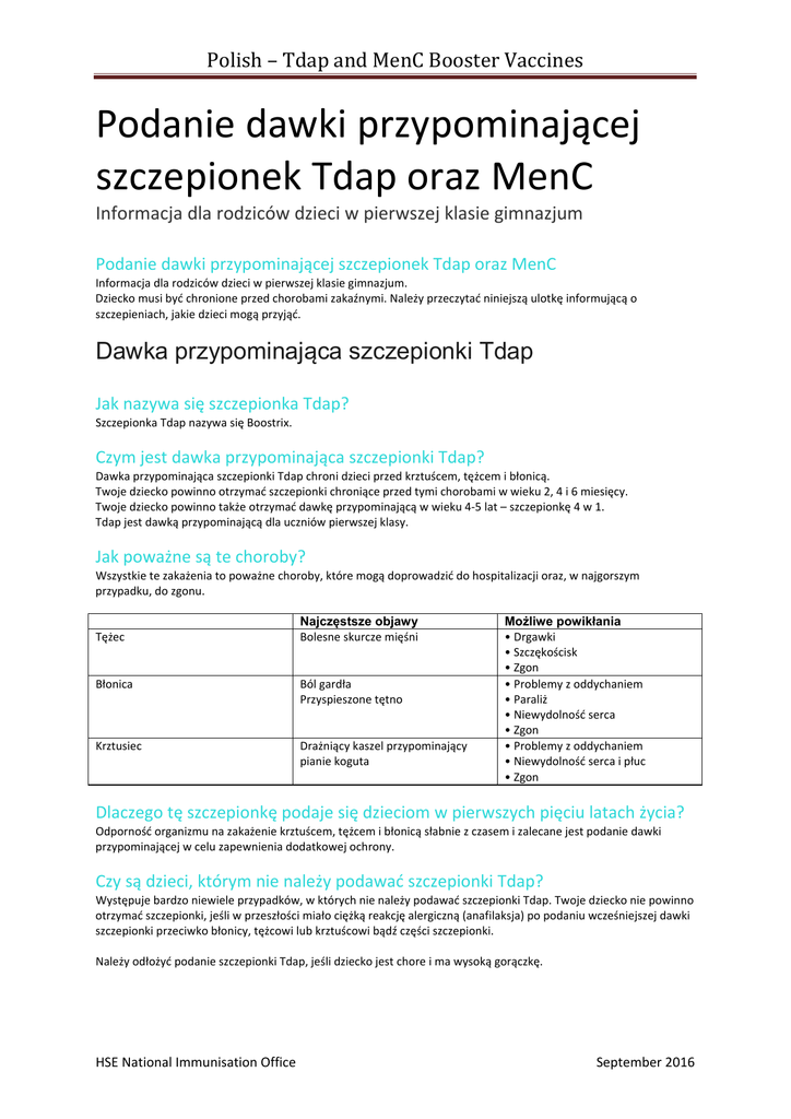 Polish–TdapandMenCBoosterVaccines Podanie dawki przypominającej szczepionek Tdap oraz MenC Informacja dla rodziców dzieci w pierwszej klasie gimnazjum Podanie dawki przypominającej szczepionek Tdap oraz MenC Informacja dla rodziców dzieci w pierwszej klasie gimnazjum. Dziecko musi być chronione przed chorobami zakaźnymi. Należy przeczytać niniejszą ulotkę informującą o szczepieniach, jakie dzieci mogą przyjąć. Dawka przypominająca szczepionki Tdap Jak nazywa się szczepionka Tdap? Szczepionka Tdap nazywa się Boostrix. Czym jest dawka przypominająca szczepionki Tdap? Dawka przypominająca szczepionki Tdap chroni dzieci przed krztuścem, tężcem i błonicą. Twoje dziecko powinno otrzymać szczepionki chroniące przed tymi chorobami w wieku 2, 4 i 6 miesięcy. Twoje dziecko powinno także otrzymać dawkę przypominającą w wieku 4‐5 lat – szczepionkę 4 w 1. Tdap jest dawką przypominającą dla uczniów pierwszej klasy. Jak poważne są te choroby? Wszystkie te zakażenia to poważne choroby, które mogą doprowadzić do hospitalizacji oraz, w najgorszym przypadku, do zgonu. Tężec Najczęstsze objawy Bolesne skurcze mięśni Błonica Ból gardła Przyspieszone tętno Krztusiec Drażniący kaszel przypominający pianie koguta Możliwe powikłania • Drgawki • Szczękościsk • Zgon • Problemy z oddychaniem • Paraliż • Niewydolność serca • Zgon • Problemy z oddychaniem • Niewydolność serca i płuc • Zgon Dlaczego tę szczepionkę podaje się dzieciom w pierwszych pięciu latach życia? Odporność organizmu na zakażenie krztuścem, tężcem i błonicą słabnie z czasem i zalecane jest podanie dawki przypominającej w celu zapewnienia dodatkowej ochrony. Czy są dzieci, którym nie należy podawać szczepionki Tdap? Występuje bardzo niewiele przypadków, w których nie należy podawać szczepionki Tdap. Twoje dziecko nie powinno otrzymać szczepionki, jeśli w przeszłości miało ciężką reakcję alergiczną (anafilaksja) po podaniu wcześniejszej dawki szczepionki przeciwko błonicy, tężcowi lub krztuścowi bądź części szczepionki. Należy odłożyć podanie szczepionki Tdap, jeśli dziecko jest chore i ma wysoką gorączkę. HSE National Immunisation Office September 2016 Polish–TdapandMenCBoosterVaccines Podanie dawki przypominającej szczepionki MenC Jak nazywa się szczepionka MenC? Szczepionka MenC nazywa się Menjugate. Czym jest dawka przypominająca szczepionki MenC? Dawka przypominająca szczepionki MenC chroni dziecko przed infekcją meningokowym zapaleniem opon mózgowych typu C. Państwa dziecko powinno otrzymać szczepionkę MenC w wieku 2, 4 i 6 miesięcy. Czym jest meningokowe zapalenie opon mózgowych typu C? Zakażenie bakteriami meningokowymi jest poważną chorobą mogącą prowadzić do zapalenia opon mózgowo‐ rdzeniowych, posocznicy (zatrucia krwi) oraz śmierci. Rozwój choroby meningokokowej może być bardzo szybki. Choroba objawia się między innymi: gorączką, zesztywnieniem karku, bólem głowy, bólem stawów oraz wysypką. Choroba może wystąpić w różnym wieku, jednak najczęściej występuje u dzieci poniżej 5. roku życia. Najbardziej zagrożone są niemowlęta poniżej pierwszego roku życia. Występuje również często u nastolatków w wieku 15‐19 lat. Dlaczego tę szczepionkę podaje się dzieciom w pierwszych pięciu latach życia? Odporność organizmu na chorobę meningokokową słabnie z czasem i zalecane jest podanie dawki przypominającej w celu zapewnienia dodatkowej ochrony. Czy są dzieci, którym nie należy podawać szczepionki MenC? Występuje bardzo niewiele przypadków, w których nie należy podawać szczepionki MenC. Szczepionki nie należy podawać dzieciom, które wykazały reakcje alergiczne (anafilaksja) na wcześniejsze szczepionki MenC lub któryś ze składników szczepionki. Należy przełożyć podanie szczepionki MenC, jeżeli dziecko jest chore i ma wysoką gorączkę. Czy szczepionki Tdap lub MenC wywołują działania niepożądane? U większości dzieci nie występują problemy po podaniu szczepionek Tdap lub MenC. Czasami po podaniu zastrzyku dzieci źle się czują lub mdleją. Należy zalecić dzieciom siedzenie przez 15 minut po podaniu szczepionki, aby uniknąć omdleń. U jednego na cztery dzieci może wystąpić lekki ból, opuchlizna i zaczerwienienie w okolicy ukłucia, które zazwyczaj mijają po jednym lub dwóch dniach. Może u nich wystąpić ból głowy, nudności lub gorączka. W takiej sytuacji można podać dziecku paracetamol lub ibuprofen. Ciężkie reakcje alergiczne na szczepionki są bardzo rzadkie. Czy szczepionki Tdap i MenC można podawać jednocześnie? Szczepionki Tdap i MenC mogą być bezpiecznie podane jednocześnie. Czy szczepionka Tdap lub MenC może być podawana w tym samym czasie, co szczepionka przeciwko wirusowi HPV? HSE National Immunisation Office September 2016 Polish–TdapandMenCBoosterVaccines Szczepionki Tdap i MenC mogą być podawane w tym samym czasie, co szczepionka przeciwko wirusowi HPV (brodawczaka ludzkiego), która jest podawana dziewczętom. W przypadku wyrażenia zgody na podanie tych szczepionek zostaną one podane w oba ramiona. Jak można uzyskać te szczepienia dla swojego dziecka? Te szczepienia są częścią szkolnego programu szczepień. Te szczepienia są oferowane uczniom w pierwszej klasie gimnazjum. Otrzymają Państwo szczegółowe informacje oraz formularz zgody przed zaszczepieniem dziecka. Nie można otrzymać tych szczepionek od lekarza rodzinnego w ramach programu szkolnego. Czy moje dziecko otrzyma potwierdzenie zaszczepienia? Po podaniu szczepionek dziecko otrzyma kartę szczepień. Jeżeli dziecko już posiada kartę szczepień, może ona zostać uzupełniona, jeżeli dziecko przyniesie ją do szkoły w dniu szczepień. Co się stanie, gdy dziecka nie będzie w szkole w dniu podawania szczepień? Dziecko nadal może zostać zaszczepione. HSE zaoferuje zaszczepienie dziecka w k