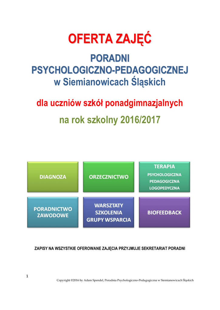 OFERTA ZAJĘĆ PORADNI PSYCHOLOGICZNO-PEDAGOGICZNEJ w Siemianowicach Śląskich dla uczniów szkół ponadgimnazjalnych na rok szkolny 2016/2017 ZAPISY NA WSZYSTKIE OFEROWANE ZAJĘCIA PRZYJMUJE SEKRETARIAT PORADNI 1 Copyright ©2016 by Adam Spendel, Poradnia Psychologiczno-Pedagogiczna w Siemianowicach Śląskich ZAJĘCIA INDYWIDUALNE NOWOŚĆ!!! Terapia zaburzeń tikowych u dzieci Dla kogo: Uczniowie zmagający się z problemem tików oraz ich rodzice Korzyści: Proponowane zajęcia terapeutyczne opierają się na autorskim programie psychopedagogicznej terapii zaburzeń tikowych „OWAT” stworzonym przez Agnieszkę Sobiegałę, cenioną specjalistkę w tej dziedzinie. Zakłada on współpracę z dzieckiem oraz jego rodzicami, mającą na celu wypracowanie sposobów radzenia sobie z tikami oraz trudnościami jakie stwarzają one w sytuacji emocjonalnej, rodzinnej i społecznej dziecka. Kiedy: Środa 13 - 18, czwartek 14 - 19 Prowadząca: Anna Mierzwa Konsultacje psychologiczne dla młodzieży zagrożonej uzależnieniem Dla kogo: Konsultacje przeznaczone są dla młodzieży eksperymentującej z narkotykami lub innymi używkami, a także młodzieży zagrożonej innymi uzależnieniami, takimi jak: uzależnienie od komputera, telefonu, TV, zakupów, jedzenia i innych. Spotkania przeznaczone są również dla rodziców zaniepokojonych o swoje dzieci lub zauważających niepokojące symptomy. 2 Copyright ©2016 by Adam Spendel, Poradnia Psychologiczno-Pedagogiczna w Siemianowicach Śląskich Korzyści: Konsultacje pomogą określić jak poważny jest problem oraz jakie niezbędne kroki należy podjąć aby nie doszło do pogorszenia sytuacji. Na spotkaniu rodzice otrzymają niezbędne informacje dotyczące profilaktyki oraz sposobów poradzenia sobie z problemem. Kiedy: Wtorki 9.00 – 14.00, środy 13.00- 18.00. Prowadząca: Anna Rusiniak. Badania i terapia centralnego przetwarzania słuchowego z wykorzystaniem screeningowego audiometru tonalnego Dla kogo: Uczniowie szkół ponadgimnazjalnych. Korzyści: Usprawnianie centralnego przetwarzania słuchowego. Kiedy: Terminy do ustalenia w sekretariacie Poradni. Prowadzący: Blanka Kamińska, Aleksandra Nowak. Zajęcia terapeutyczne metodą Warnkego Dla kogo: Zajęcia przeznaczone dla uczniów szkół średnich z deficytami centralnego przetwarzania spostrzeżeń (m.in. ze specyficznymi trudnościami w uczeniu się i zaburzeniami procesów słuchowych. 3 Copyright ©2016 by Adam Spendel, Poradnia Psychologiczno-Pedagogiczna w Siemianowicach Śląskich Korzyści: wytrenowanie automatyzacji spostrzeżeń w obszarze słuchu, wzroku i zdolności motorycznych, usprawnienie umiejętności czytania i pisania. Kiedy: Środa 13.00 – 17.30 prowadząca Aleksandra Nowak Wtorek 12.30 – 17.00 lub w zależności od możliwości ucznia prowadząca Blanka Kamińska Terapia indywidualna krótko i długoterminowa Dla kogo: Dla uczniów, u których w życiu codziennym wystąpiło wiele trudnych sytuacji, z którymi nie potrafią sobie poradzić. Problemy szkolne, fobie społeczne czy reakcje psychosomatyczne mogą być wynikiem przeżyć emocjonalnych dziecka związanych z trudną sytuacją rodzinną lub odwrotnie, trudności szkolne mogą powodować kłopoty w życiu rodzinnym i osobistym dziecka. Korzyści: Spotkania terapeutyczne pozwolą na przeanalizowanie i przepracowanie własnych problemów z pomocą specjalisty. Bezpieczna relacja terapeutyczna umożliwi i ułatwi pacjentowi otwarcie się na własne potrzeby i uczucia. Przy uważnej obserwacji i wsparciu terapeuty, dziecko może szukać własnej drogi, mówić o tym, co jest dla niego ważne, co je trapi. Praca terapeutyczna pomaga w ujawnieniu, nazwaniu i zrozumieniu własnych emocji. Głębsze poznanie siebie może pozytywnie wpłynąć na relacje rodzinne i kontakty społeczne, a świadomość własnych możliwości i ograniczeń ułatwi osiąganie sukcesów. 4 Copyright ©2016 by Adam Spendel, Poradnia Psychologiczno-Pedagogiczna w Siemianowicach Śląskich Kiedy: Wtorek 12.00-17.00, środa 11.00-16.00, czwartek 12.00-17.00, Prowadząca: Ewa Bulska – Mazur. Poniedziałek 13.00- 18.00, wtorek 9.00-14.00, środa 13.00-18.00, Prowadząca Anna Rusiniak. Coaching osobisty Dla kogo: Indywidualne sesje coachingowe przeznaczone dla uczniów szkół ponadgimnazjalnych w celu udzielenia wsparcia do wprowadzenia zmian w swo im życiu. Korzyści: Coaching osobisty (life coaching) jest doskonałym wsparciem dla wszystkich osób, które czują gotowość do wprowadzenia zmian w swoim życiu. Coaching osobisty daje klientowi możliwość całkowitego spojrzenia na swoje życie, zastanowienia się dokąd zmierza, przemyślenia, w jakich obszarach najbardziej potrzebuje zmian. Coaching osobisty może dotyczyć: rozwoju osobistego (odkrywanie własnych pragnień, motywowanie siebie, budowanie pewności siebie, zwiększanie wiary we własne możliwości) poprawy relacji w rodzinie, pracy i szkole realizowania własnych pasji radzenia sobie ze stresem. Kiedy: Terminy do ustalenia w sekretariacie Poradni. Prowadząca: Renata Jaroń – Guzy. 5 Copyright ©2016 by Adam Spendel, Poradnia Psychologiczno-Pedagogiczna w Siemianowicach Śląskich Biofeedback Dla kogo: Uczniowie szkół ponadgimnazjalnych. Korzyści: Metoda EEG biofeedback pozwala na ustalenie harmonii czynności fal mózgowych na zasadzie bioregulacji i uczenia się mózgu. Zalecana jest w przypadku trudności w nauce, dysleksji, dysgrafii, nadpobudliwości psychoruchowej, problemów z koncentracją uwagi, zapamiętywaniem oraz w przypadku dzieci intensywnie uczących się. Treningi mają charakter wyciszający i relaksujący przy jednoczesnej aktywizacji procesów myślenia i koncentracji uwagi. Badania wykazały, że metoda jest zupełnie bezpieczna, nie daje żadnych skutków ubocznych, a jej skuteczność ocenia się na 85% - 95% przypadków w zależności od stopnia złożoności problemu. Cykl terapeutyczny składa się z 10 spotkań odbywających s