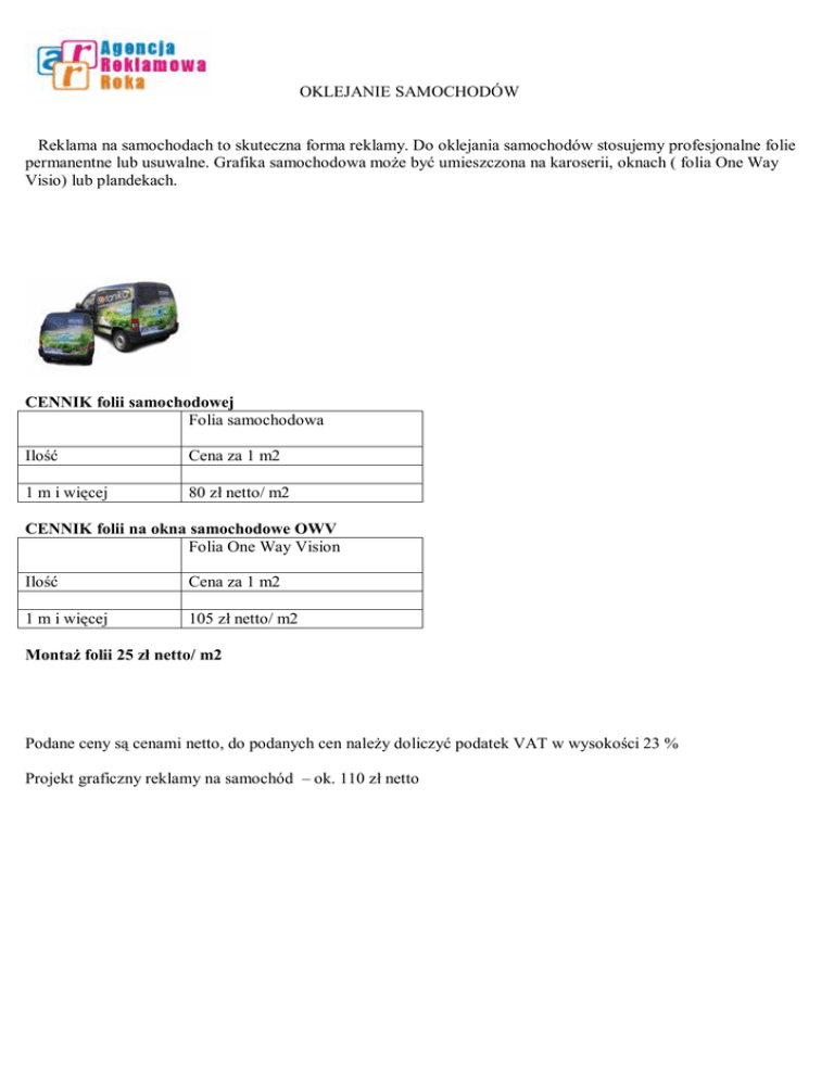 OKLEJANIE SAMOCHODÓW Reklama na samochodach to skuteczna forma reklamy. Do oklejania samochodów stosujemy profesjonalne folie permanentne lub usuwalne. Grafika samochodowa może być umieszczona na karoserii, oknach ( folia One Way Visio) lub plandekach. CENNIK folii samochodowej Folia samochodowa Ilość Cena za 1 m2 1 m i więcej 80 zł netto/ m2 CENNIK folii na okna samochodowe OWV Folia One Way Vision Ilość Cena za 1 m2 1 m i więcej 105 zł netto/ m2 Montaż folii 25 zł netto/ m2 Podane ceny są cenami netto, do podanych cen należy doliczyć podatek VAT w wysokości 23 % Projekt graficzny reklamy na samochód – ok. 110 zł netto