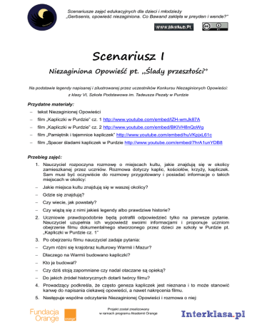 Scenariusze zajęć edukacyjnych dla dzieci i młodzieży „Gerbsenis, opowieść niezaginiona. Co Bawand zaklęła w preyden i wende?” Scenariusz I Niezaginiona Opowieść pt. „Ślady przeszłości” Na podstawie legendy napisanej i zilustrowanej przez uczestników Konkursu Niezaginionych Opowieści: z klasy VI, Szkoła Podstawowa im. Tadeusza Pezały w Purdzie Przydatne materiały: tekst Niezaginionej Opowieści film „Kapliczki w Purdzie” cz. 1 http://www.youtube.com/embed/lZH-wmJk87A film „Kapliczki w Purdzie” cz. 2 http://www.youtube.com/embed/BKIVH8nQoWg film „Pamiętnik i tajemnice kapliczek” http://www.youtube.com/embed/huVKpjxL61c film „Spacer śladami kapliczek w Purdzie http://www.youtube.com/embed/7hrA1unYDB8 Przebieg zajęć: 1. Nauczyciel rozpoczyna rozmowę o miejscach kultu, jakie znajdują się w okolicy zamieszkanej przez uczniów. Rozmowa dotyczy kaplic, kościołów, krzyży, kapliczek. Sam musi być oczywiście do rozmowy przygotowany i posiadać informacje o takich miejscach w okolicy: Jakie miejsca kultu znajdują się w waszej okolicy? Gdzie się znajdują? Czy wiecie, jak powstały? Czy wiążą się z nimi jakieś legendy albo prawdziwe historie? 2. Uczniowie prawdopodobnie będą potrafili odpowiedzieć tylko na pierwsze pytanie. Nauczyciel uzupełnia ich wypowiedź swoimi informacjami i proponuje uczniom obejrzenie filmu dokumentalnego stworzonego przez dzieci ze szkoły w Purdzie pt. „Kapliczki w Purdzie cz. 1” 3. Po obejrzeniu filmu nauczyciel zadaje pytania: Czym różni się krajobraz kulturowy Warmii i Mazur? Dlaczego na Warmii budowano kapliczki? Kto je budował? Czy dziś stoją zapomniane czy nadal otaczane są opieką? Do jakich źródeł historycznych dotarli twórcy filmu? 4. Prowadzący podkreśla, że często geneza kapliczek jest nieznana i to może stanowić kanwę do napisania ciekawej opowieści, a nawet nakręcenia filmu. 5. Następuje wspólne odczytanie Niezaginionej Opowieści i rozmowa o niej: Projekt został zrealizowany w ramach programu Akademii Orange Scenariusze zajęć edukacyjnych dla dzieci i młodzieży „Gerbsenis, opowieść niezaginiona. Co Bawand zaklęła w preyden i wende?” W jaki sposób tekst wiąże się z obejrzanym filmem? Jaka jest forma tekstu? (w tym miejscu warto przypomnieć cechy pamiętnika) Jak można ocenić nastrój tego tekstu? Jak oceniacie zakończenie i czy jest ono dla was wystarczające? Co zrobilibyście na miejscu Rozalii? 6. Uczniowie powinni odpowiedzieć, że należy odnaleźć zaginione zapiski czarownicy z Butryn i tu zaczyna się ich rola. 7. Na podstawie własnej wiedzy i informacji przekazanych przez nauczyciela mają dopisać dalszy ciąg historii. 8. Warunki są następujące: Uczniowie zostają podzieleni na grupy w ilości odpowiadającej ilości miejsc wskazanych na początku zajęć (chyba, że jest ich mało, wtedy o ilości grup decyduje nauczyciel) Przedstawiciele grup losują wspomniane miejsca kultu (jeśli miejsc takich jest mało, można większej ilości grup przydzielić jedno miejsce) Zadaniem grupy jest napisanie pamiętnika, w którym znajdzie się wyjaśnienie, w jaki sposób zapiski czarownicy z Butryn zostały ukryte i odnalezione w wylosowanym miejscu. 9. Dopiero po wykonaniu prac i zamieszczeniu ich na stronie internetowej na zajęciach podsumowujących, na których wyniki prac zostaną zaprezentowane można zorganizować pokaz filmu „Pamiętnik i tajemnice kapliczek”. Linki do pozostałych filmów mówiących o kapliczkach w Purdzie można przekazać po zakończeniu zajęć jako materiał uzupełniający, który może być wykorzystany podczas pisania pamiętnika Projekt został zrealizowany w ramach programu Akademii Orange