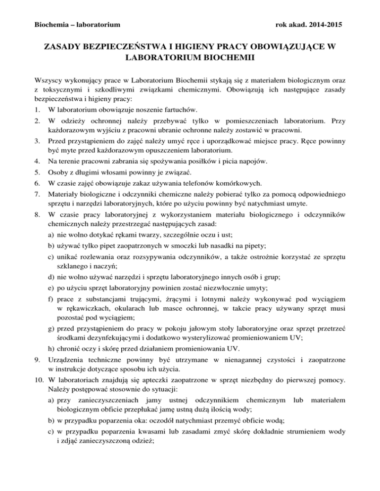 Biochemia – laboratorium rok akad. 2014-2015 ZASADY BEZPIECZEŃSTWA I HIGIENY PRACY OBOWIĄZUJĄCE W LABORATORIUM BIOCHEMII Wszyscy wykonujący prace w Laboratorium Biochemii stykają się z materiałem biologicznym oraz z toksycznymi i szkodliwymi związkami chemicznymi. Obowiązują ich następujące zasady bezpieczeństwa i higieny pracy: 1. W laboratorium obowiązuje noszenie fartuchów. 2. W odzieży ochronnej należy przebywać tylko w pomieszczeniach laboratorium. Przy każdorazowym wyjściu z pracowni ubranie ochronne należy zostawić w pracowni. 3. Przed przystąpieniem do zajęć należy umyć ręce i uporządkować miejsce pracy. Ręce powinny być myte przed każdorazowym opuszczeniem laboratorium. 4. Na terenie pracowni zabrania się spożywania posiłków i picia napojów. 5. Osoby z długimi włosami powinny je związać. 6. W czasie zajęć obowiązuje zakaz używania telefonów komórkowych. 7. Materiały biologiczne i odczynniki chemiczne należy pobierać tylko za pomocą odpowiedniego sprzętu i narzędzi laboratoryjnych, które po użyciu powinny być natychmiast umyte. 8. W czasie pracy laboratoryjnej z wykorzystaniem materiału biologicznego i odczynników chemicznych należy przestrzegać następujących zasad: a) nie wolno dotykać rękami twarzy, szczególnie oczu i ust; b) używać tylko pipet zaopatrzonych w smoczki lub nasadki na pipety; c) unikać rozlewania oraz rozsypywania odczynników, a także ostrożnie korzystać ze sprzętu szklanego i naczyń; d) nie wolno używać narzędzi i sprzętu laboratoryjnego innych osób i grup; e) po użyciu sprzęt laboratoryjny powinien zostać niezwłocznie umyty; f) prace z substancjami trującymi, żrącymi i lotnymi należy wykonywać pod wyciągiem w rękawiczkach, okularach lub masce ochronnej, w takcie pracy używany sprzęt musi pozostać pod wyciągiem; g) przed przystąpieniem do pracy w pokoju jałowym stoły laboratoryjne oraz sprzęt przetrzeć środkami dezynfekującymi i dodatkowo wysterylizować promieniowaniem UV; h) chronić oczy i skórę przed działaniem promieniowania UV. 9. Urządzenia techniczne powinny być utrzymane w nienagannej czystości i zaopatrzone w instrukcje dotyczące sposobu ich użycia. 10. W laboratoriach znajdują się apteczki zaopatrzone w sprzęt niezbędny do pierwszej pomocy. Należy postępować stosownie do sytuacji: a) przy zanieczyszczeniach jamy ustnej odczynnikiem chemicznym biologicznym obficie przepłukać jamę ustną dużą ilością wody; lub materiałem b) w przypadku poparzenia oka: oczodół natychmiast przemyć obficie wodą; c) w przypadku poparzenia kwasami lub zasadami zmyć skórę dokładnie strumieniem wody i zdjąć zanieczyszczoną odzież; Biochemia – laboratorium rok akad. 2014-2015 d) w przypadku skaleczenia ranę przemyć wodą i założyć opatrunek. e) o każdym wypadku natychmiast powiadomić prowadzącego zajęcia. 11. W przypadku awarii sprzętu i wypadku do których zalicza się także zbicie naczynia szklanego, rozsypanie lub rozlanie odczynnika na stół, podłogę lub ubranie natychmiast powiadomić prowadzącego. 12. Po zakończeniu zajęć należy uporządkować miejsce pracy: a) Umyć sprzęt i wyłączyć z sieci aparaturę; b) Przetrzeć blat stołu wodą i wytrzeć do sucha; c) Zdjąć ubranie ochronne i umyć ręce. 13. W PRZYPADKU JAKICHKOLWIEK WĄTPLIWOŚCI PODCZAS WYKONYWANIA ZAJĘĆ – PYTAĆ PROWADZĄCEGO. 14. PODCZAS WYKONYWANIA WSZYSTKIM MYŚLEĆ! CZYNNOŚCI LABORATORYJNYCH – PRZEDE