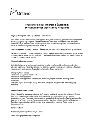 Program Pomocy Ofiarom i Świadkom � (Victim/Witness Assistance Program) � Czym jest Program Pomocy Ofiarom i Świadkom? � Jeśli jesteś ofiarą lub świadkiem przestępstwa z uŜyciem przemocy, prawdopodobnie będziesz musiał(a) pojawić się w sądzie. MoŜe to okazać się dla Ciebie doświadczeniem trudnym i dezorientującym. MoŜesz mieć róŜne wątpliwości co do działania wymiaru sprawiedliwości a takŜe co do tego, czego się od Ciebie oczekuje. Celem Programu Pomocy Ofiarom i Świadkom jest pomoc w przezwycięŜeniu tych trudności. Będziemy rozmawiać z Tobą i zapewnimy pomoc, jakiej wymaga Twoja konkretna sytuacja oraz potrzeby. Nasze usługi rozpoczynają się z chwilą wniesienia oskarŜenia przez policję i trwają aŜ do zakończenia sprawy w sądzie. Kto moŜe otrzymać pomoc? Usługi świadczone są w pierwszej kolejności wraŜliwym ofiarom i świadkom przestępstw z uŜyciem przemocy , takich jak przemoc w rodzinie, napastowanie dzieci, przemoc seksualna, napastowanie osób starszych, zabójstwa i przestępstwa z nienawiści. Oferujemy takŜe pomoc: • ofiarom o specjalnych potrzebach • rodzinom ofiar zabójstwa • rodzinom ofiar wypadków śmiertelnych, skutkujących postawieniem sprawcy w stan oskarŜenia. Dostępne są teŜ informacje i usługi dla dzieci, specjalnie przygotowane dla danej grupy wiekowej. Jak moŜna otrzymać pomoc? Ofiary i świadków przestępstw kieruje do Programu policja lub oskarŜyciel publiczny (Crown Attorney), po wniesieniu oskarŜenia. Jeśli jesteś ofiarą przestępstwa moŜesz równieŜ skontaktować się z Programem bezpośrednio lub zwrócić się do kogoś w Twojej społeczności by zrobił to w Twoim imieniu. Nasz personel dołoŜy wszelkich starań, by skontaktować się z Tobą jak najszybciej, by udzielić pomocy oraz reagować na wszelkie Twoje obawy o bezpieczeństwo. Ile to kosztuje? Nasze usługi są bezpłatne w całym Ontario. Jakie rodzaje pomocy są dostępne? Program Pomocy Ofiarom i Świadkom moŜe: • Udzielić odpowiedzi na pytania, dotyczące wymiaru sprawiedliwości, procedur sądowych i Twojej roli w sądzie • Pomóc Ci zrozumieć czego się spodziewać w trakcie kolejnych rozpraw i pomóc w przygotowaniu do wystąpienia w sądzie • Dostarczyć kopie dokumentów sądowych, takich jak warunki poręczenia czy ustanowienie kuratora sądowego • Skontaktować się w Twoim imieniu z oskarŜycielem publicznym (Crown attorney) lub policjantem, prowadzącym daną sprawę • Zaoferować wsparcie emocjonalne w całym toku postępowania sądowego • Skierować do odpowiedniej agencji społecznej, w której otrzymasz inne usługi, jak doradztwo lub planowanie bezpieczeństwa • Zapewnić tłumacza w sprawach o przemoc domową oraz/lub zaspokoić inne specjalne potrzeby • Pomóc w zrozumieniu i wypełnieniu Oświadczenia o PrzeŜytym Wstrząsie. (Victim Impact Statement). Program nie moŜe: • • • • przyjmować i omawiać z Tobą dowodów w sprawie wycofać oskarŜenia zorganizować opieki nad dziećmi zapewnić transport do lub z sądu. Jak skontaktować się z Programem? Program Pomocy Ofiarom i Świadkom jest oferowany przez Prokuraturę Generalną (Attorney General) we wszystkich 54 okręgach sądowych. Aby znaleźć najbliŜsze biuro Programu zadzwoń na Línię Pomocy Ofiarom Przestępstwa linia darmowa 18885792888 albo 4163142447 w obszarze metropolii torontońskiej (Greater Toronto Area) lub teŜ odwiedź stronę www.ontario.ca/victimservices (Polish)