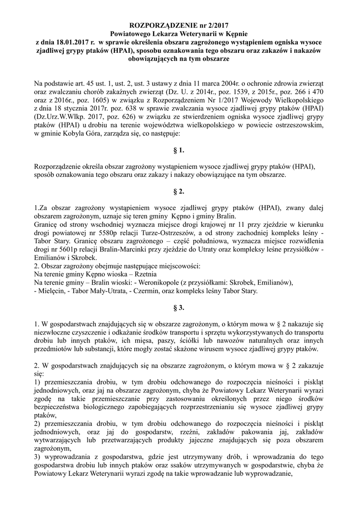 ROZPORZĄDZENIE nr 2/2017 Powiatowego Lekarza Weterynarii w Kępnie z dnia 18.01.2017 r. w sprawie określenia obszaru zagrożonego wystąpieniem ogniska wysoce zjadliwej grypy ptaków (HPAI), sposobu oznakowania tego obszaru oraz zakazów i nakazów obowiązujących na tym obszarze Na podstawie art. 45 ust. 1, ust. 2, ust. 3 ustawy z dnia 11 marca 2004r. o ochronie zdrowia zwierząt oraz zwalczaniu chorób zakaźnych zwierząt (Dz. U. z 2014r., poz. 1539, z 2015r., poz. 266 i 470 oraz z 2016r., poz. 1605) w związku z Rozporządzeniem Nr 1/2017 Wojewody Wielkopolskiego z dnia 18 stycznia 2017r. poz. 638 w sprawie zwalczania wysoce zjadliwej grypy ptaków (HPAI) (Dz.Urz.W.Wlkp. 2017, poz. 626) w związku ze stwierdzeniem ogniska wysoce zjadliwej grypy ptaków (HPAI) u drobiu na terenie województwa wielkopolskiego w powiecie ostrzeszowskim, w gminie Kobyla Góra, zarządza się, co następuje: § 1. Rozporządzenie określa obszar zagrożony wystąpieniem wysoce zjadliwej grypy ptaków (HPAI), sposób oznakowania tego obszaru oraz zakazy i nakazy obowiązujące na tym obszarze. § 2. 1.Za obszar zagrożony wystąpieniem wysoce zjadliwej grypy ptaków (HPAI), zwany dalej obszarem zagrożonym, uznaje się teren gminy Kępno i gminy Bralin. Granicę od strony wschodniej wyznacza miejsce drogi krajowej nr 11 przy zjeździe w kierunku drogi powiatowej nr 5580p relacji Turze-Ostrzeszów, a od strony zachodniej kompleks leśny Tabor Stary. Granicę obszaru zagrożonego – część południowa, wyznacza miejsce rozwidlenia drogi nr 5601p relacji Bralin-Marcinki przy zjeździe do Utraty oraz kompleksy leśne przysiółków Emilianów i Skrobek. 2. Obszar zagrożony obejmuje następujące miejscowości: Na terenie gminy Kępno wioska – Rzetnia Na terenie gminy – Bralin wioski: - Weronikopole (z przysiółkami: Skrobek, Emilianów), - Mielęcin, - Tabor Mały-Utrata, - Czermin, oraz kompleks leśny Tabor Stary. § 3. 1. W gospodarstwach znajdujących się w obszarze zagrożonym, o którym mowa w § 2 nakazuje się niezwłoczne czyszczenie i odkażanie środków transportu i sprzętu wykorzystywanych do transportu drobiu lub innych ptaków, ich mięsa, paszy, ściółki lub nawozów naturalnych oraz innych przedmiotów lub substancji, które mogły zostać skażone wirusem wysoce zjadliwej grypy ptaków. 2. W gospodarstwach znajdujących się na obszarze zagrożonym, o którym mowa w § 2 zakazuje się: 1) przemieszczania drobiu, w tym drobiu odchowanego do rozpoczęcia nieśności i piskląt jednodniowych, oraz jaj na obszarze zagrożonym, chyba że Powiatowy Lekarz Weterynarii wyrazi zgodę na takie przemieszczanie przy zastosowaniu określonych przez niego środków bezpieczeństwa biologicznego zapobiegających rozprzestrzenianiu się wysoce zjadliwej grypy ptaków, 2) przemieszczania drobiu, w tym drobiu odchowanego do rozpoczęcia nieśności i piskląt jednodniowych, oraz jaj do gospodarstw, rzeźni, zakładów pakowania jaj, zakładów wytwarzających lub przetwarzających produkty jajeczne znajdujących się poza obszarem zagrożonym, 3) wyprowadzania z gospodarstwa, gdzie jest utrzymywany drób, i wprowadzania do tego gospodarstwa drobiu lub innych ptaków oraz ssaków utrzymywanych w gospodarstwie, chyba że Powiatowy Lekarz Weterynarii wyrazi zgodę na takie wprowadzanie lub wyprowadzanie, 4) wywożenia lub rozrzucania ściółki lub nawozów naturalnych, chyba że Powiatowy Lekarz Weterynarii wyrazi zgodę na takie wywożenie lub rozrzucanie, 5) organizowania targów, wystaw, pokazów lub konkursów, gdzie są gromadzone drób lub inne ptaki oraz polowań i odłowów ptactwa dzikiego, 6) targowiskowej sprzedaży drobiu, mięsa drobiowego, mięsa ptaków łownych oraz jaj konsumpcyjnych. § 4. 1. Nakazuje się oznakowanie obszaru zagrożonego, o którym mowa w § 2, poprzez ustawienie na zewnętrznej granicy obszaru tablic ostrzegawczych o następującej treści: „GRYPA PTAKÓW – OBSZAR ZAGROŻONY. WPROWADZANIE I WYPROWADZANIE ZWIERZĄT WZBRONIONE”. 2. Tablica i napisy na niej ma mieć takie wymiary, aby była czytelna z odległości co najmniej 100 metrów. 3. Tablice należy umieścić na drogach publicznych i prywatnych. § 5. Nakazy i zakazy, o których mowa w § 3 obowiązują, do momentu ich odwołania, wszystkich mieszkańców oraz osoby przebywające czasowo na obszarach, o których mowa w § 2. § 6. Wykonanie rozporządzenia powierza się: Powiatowemu Lekarzowi Weterynarii w Kępnie, Staroście Kępińskiemu, Burmistrzowi Miasta i Gminy Kępno oraz Wójtowi Gminy Bralin, Komendantowi Powiatowemu Policji w Kępnie, Komendantowi Państwowej Powiatowej Straży Pożarnej w Kępnie, Powiatowemu Zarządowi Dróg w Kępnie, Państwowemu Powiatowemu Inspektorowi Sanitarnemu w Kępnie i właściwym terytorialnie nadleśnictwom. § 7. Rozporządzenie wchodzi w życie z dniem podania do wiadomości publicznej w sposób zwyczajowo przyjęty na danym terenie i podlega ogłoszeniu w Dzienniku Urzędowym Województwa Wielkopolskiego. Z-ca Powiatowego Lekarza Weterynarii w Kępnie Lek. wet. Jadwiga Sielecka UZASADNIENIE Powiatowy Lekarz Weterynarii w Kępnie wydał rozporządzenie w sprawie zwalczania wysoce zjadliwej grypy ptaków (HPAI) na terenie powiatu kępińskiego w związku ze stwierdzeniem przypadku choroby u drobiu w miejscowości Bierzów (gm. Kobyla Góra) w powiecie ostrzeszowskim, województwo wielkopolskie w dniu 17 stycznia 2017r. Załącznik do Rozporządzenia nr 2/2017 Powiatowego Lekarza Weterynarii w Kępnie z dnia 17 stycznia 2017 r. Tablica