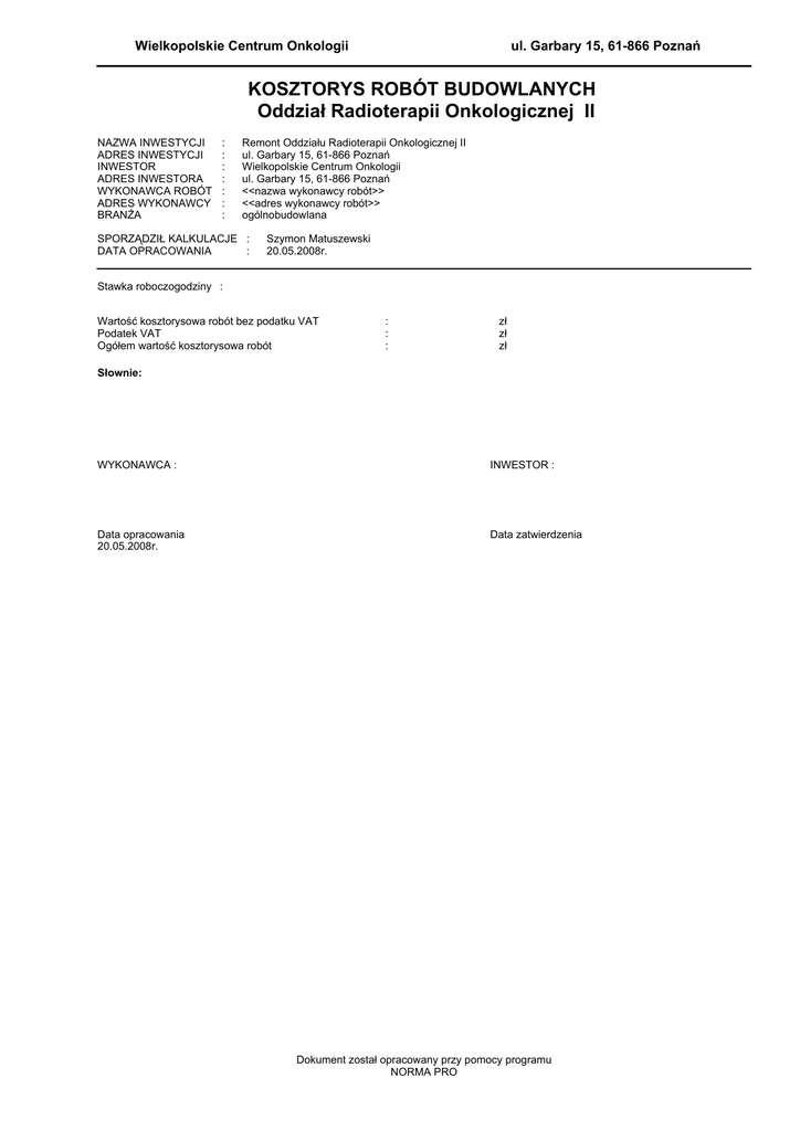 KOSZTORYS ROBÓT BUDOWLANYCH Oddział Radioterapii