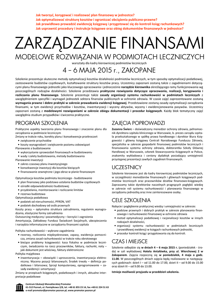 Jak tworzyć, korygować i realizować plan finansowy w jednostce? Jak optymalizować strukturę kosztów i ograniczać obciążenia publiczno-prawne? Jak prawidłowo prowadzić ewidencję księgową i przygotować się do kontroli ksiąg rachunkowych? Jak usprawnić procedury i instrukcje księgowe oraz obieg dokumentów finansowych w jednostce? ZARZĄDZANIE FINANSAMI MODELOWE ROZWIĄZANIA W PODMIOTACH LECZNICZYCH warsztaty dla kadry kierowniczej podmiotów leczniczych 4 – 6 MAJA 2015 r., ZAKOPANE Szkolenie prezentuje skuteczne metody optymalizacji kosztów działalności podmiotów leczniczych, w tym sposoby optymalizacji podatkowej, zastosowanie budżetów cząstkowych, kształtowanie struktury kosztów pracy. Uczestnicy zapoznani zostaną także z zagadnieniami dotyczącymi planu finansowego jednostki jako kluczowego opracowania i jednocześnie narzędzie kierownika określającego ramy funkcjonowania wg poszczególnych rodzajów działalności. Szkolenie przedstawia praktyczne rozwiązania dotyczące opracowania, realizacji, korygowania i rozliczania planu finansowego. Szkolenie prezentuje także zasady organizacji systemu rachunkowości w podmiotach leczniczych z uwzględnieniem specyfiki i wymagań jednostek sektora finansów publicznych w ochronie zdrowia. W czasie zajęć zaprezentowane zostaną wymagania prawne i dobre praktyki w zakresie prowadzania ewidencji księgowej. Przedstawione zostaną zasady optymalizacji zarządzania finansami, w tym ewidencji przychodów i kosztów, inwentaryzacji i wyceny aktywów, wyceny i ewidencjonowania pasywów. Uczestnicy zapoznani zostaną z modelowymi rozwiązaniami w zakresie obiegu dokumentacji i procedur księgowych. Każdy blok tematyczny zajęć uwzględnia studium przypadków i ćwiczenia praktyczne. PROGRAM SZKOLENIA ZAJĘCIA POPROWADZI Praktyczne aspekty tworzenia planu finansowego i znaczenie planu dla zarządzania w podmiocie leczniczym Zmiany w trakcie roku, korekty planu i konsekwencje przekroczeń • zwiększenie przychodów • koszty wynagrodzeń i zwiększenie poziomu zobowiązań Planowanie a budżetowanie • wykorzystanie sprawozdań finansowych w budżetowaniu • wady i zalety budżetowania, metody budżetowania Planowanie inwestycji • zakres czasowy planu inwestycyjnego • konsekwencje inwestycji dla kosztów bieżących • finansowanie zewnętrzne i jego obraz w planie finansowym Zuzanna Świerc – doświadczony menedżer ochrony zdrowia, pełnomocnik dyrektora szpitala klinicznego w Warszawie, b. prezes zarządu szpitala przekształconego w spółkę prawa handlowego i dyrektor Biura Księgowości i główny księgowy Centrali Narodowego Funduszu Zdrowia, specjalistka w zakresie gospodarki finansowej podmiotów leczniczych i finansowania systemu ochrony zdrowia, doktorantka Szkoły Głównej Handlowej w Warszawie, członek Stowarzyszenia Księgowych w Polsce, znakomity wykładowca i ceniony dydaktyk posiadający umiejętność przystępnej prezentacji zawiłych zagadnień finansowych. Optymalizacja kosztów podmiotu leczniczego - budżetowanie • plan finansowy jako podstawa ustalania budżetów cząstkowych • ośrodki odpowiedzialności budżetowej • przydzielania, monitorowanie i rozliczanie limitów • rezerwa budżetowa Optymalizacja podatkowa • podatek od nieruchomości, PFRON, VAT • podatek dochodowy od osób prawnych Koszty pracy – optymalna struktura zatrudnienia, regulamin wynagradzania, elastyczne formy zatrudnienia Outsourcing medyczny i pozamedyczny – korzyści i zagrożenia Amortyzacja, Zakładowy Fundusz Świadczeń Socjalnych, ubezpieczenia i narzędzia informatyczne w zarządzaniu finansami szpitala Polityka rachunkowości – wybrane zagadnienia • rezerwy, rozliczenia międzyokresowe, zapasy, ewidencja pomocnicza, zmiana zasad rachunkowości w trakcie roku obrotowego • bieżące problemy księgowości: kasa fiskalna w podmiocie leczniczym, świadczenia na rzecz pracowników, faktury, rachunki, noty – jaki dokument jest właściwy, faktury elektroniczne Polityka majątkowa • inwentaryzacja – obowiązki i uproszczenia, inwentaryzacja elektroniczna; Wycena pozycji bilansowych; Środek trwały – definicja podatkowa i bilansowa; Sprzęt komputerowy, oprogramowanie – zasady ewidencji i amortyzacji Zmiany w przepisach księgowych, podatkowych i innych, aktualne interpretacje podatkowe Centrum Edukacji Menedżerskiej Promotor 61-512 Poznań, ul. Pamiątkowa 2/8, tel. +48 61 855 23 14, fax +48 61 224 51 63 e-mail [email protected], www.promotor.poznan.pl UCZESTNICY Szkolenie kierowane jest do kadry kierowniczej podmiotów leczniczych, w szczególności menedżerów finansowych i głównych księgowych podmiotów leczniczych oraz pracowników działów finansowo-księgowych. Zapraszamy także dyrektorów naczelnych pragnących pogłębić wiedzę w zakresie roli systemu rachunkowości i planowania finansowego w zarządzaniu jednostką oraz inne zainteresowane osoby. CELE SZKOLENIA Nabycie i pogłębienie praktycznej wiedzy i umiejętności w zakresie: • podstaw prawnych i dobrych praktyk w zakresie planowania finansowego i rachunkowości finansowej w ochronie zdrowia • metod optymalizacji podatkowej i racjonalizacji kosztów w innych rodzajach działalności, • organizacji systemu rachunkowości w podmiotach leczniczych i prawidłowej ewidencji w księgach rachunkowych jednostki, • procedur kontroli ksiąg i przygotowania się do kontroli. CZAS I MIEJSCE Szkolenie odbędzie się w dniach 4 – 6 maja 2015 r. (poniedziałek - środa) w sali wykładowej Hotelu Antałówka, przy ul. Wierchowej 2 w Zakopanem. Zajęcia rozpoczną się w poniedziałek, 4 maja o godz. 11.00. W poszczególnych dniach zajęcia będą realizowane w następujących godzinach: dzień I – od 11.00 do 17.00, dzień II – od 9.00 do 15.00 oraz dzień III – od 9.00 do 13.00. Istnieje możliwość przyjazdu w przeddzień szkolenia. ZARZĄDZANIE FINANSAMI MODELOWE ROZWIĄZANIA W PODMIOTACH LECZNI